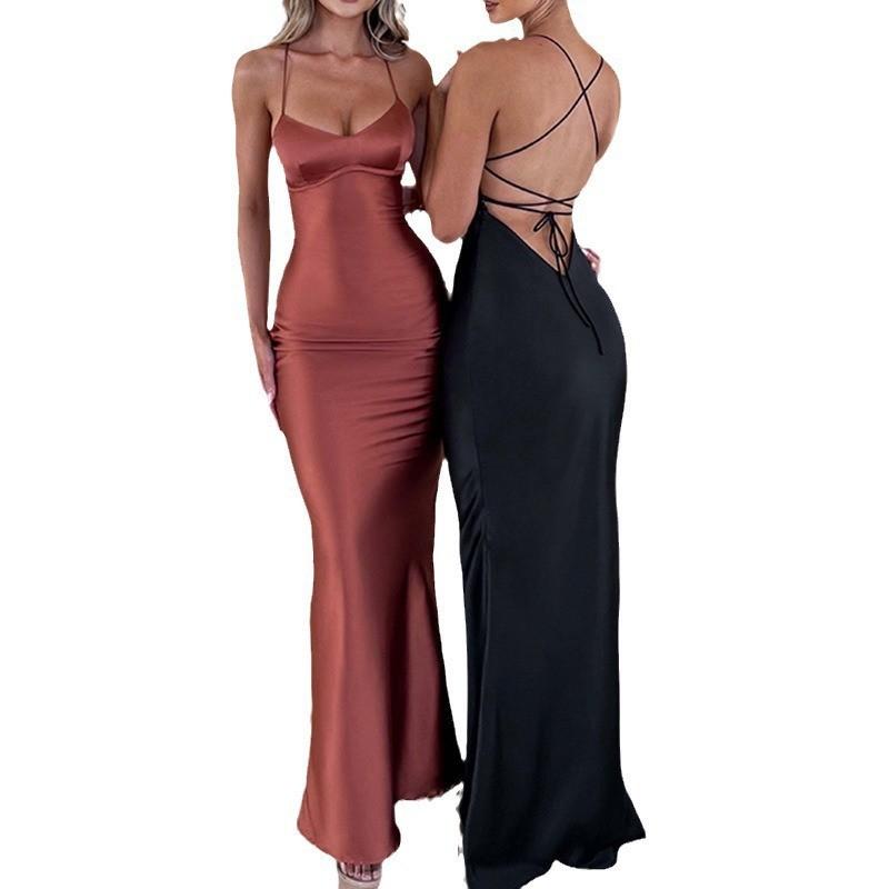 Vestido sexy de satén con tirantes para mujer, estilo Amazon Cross-border, otoño, nuevo, a la moda, con espalda descubierta y tirantes en la cintura.
