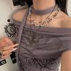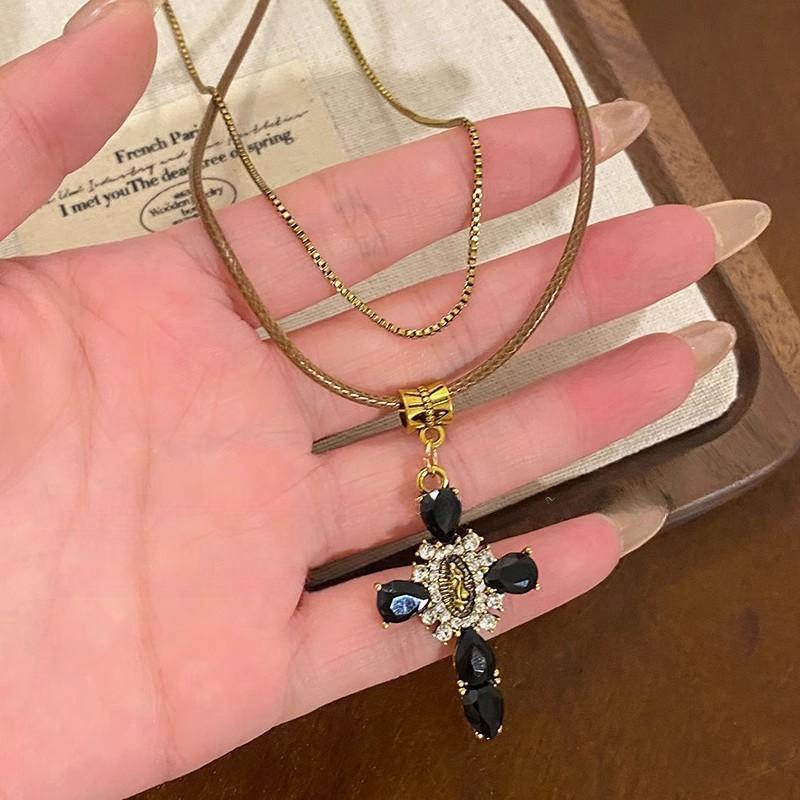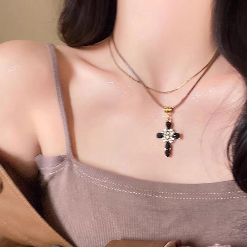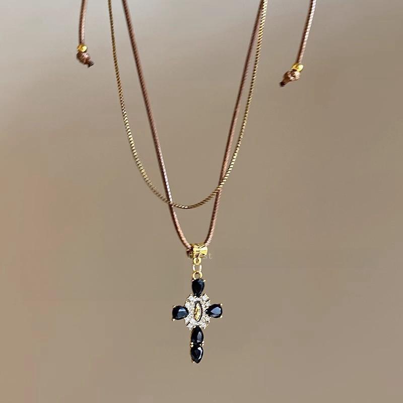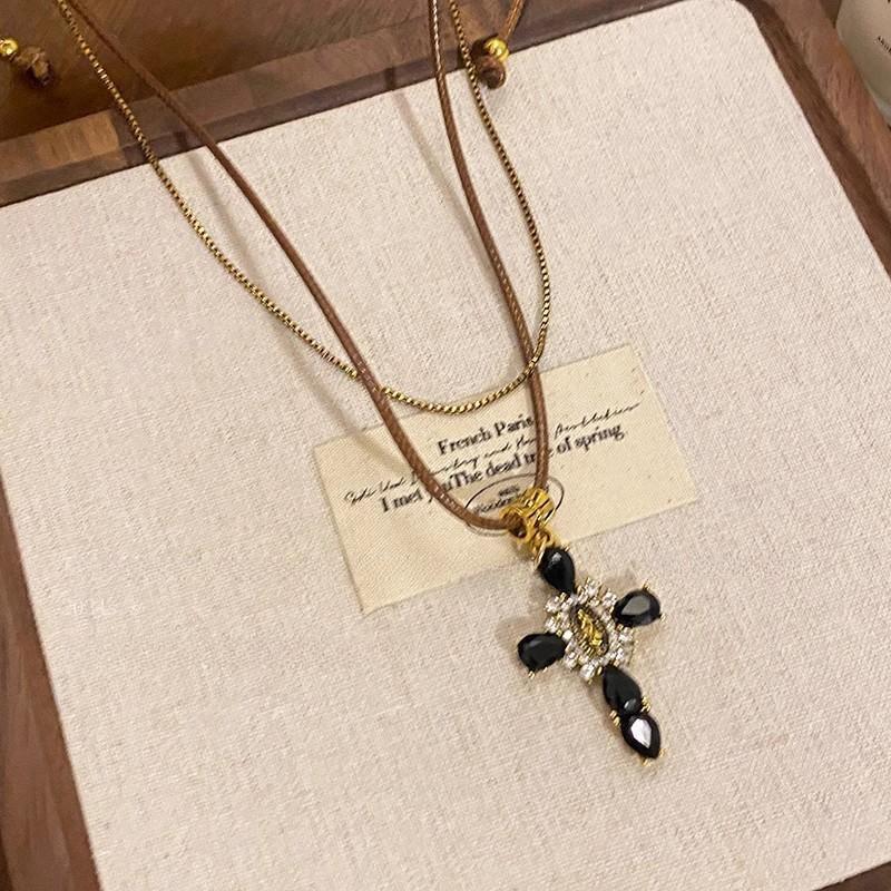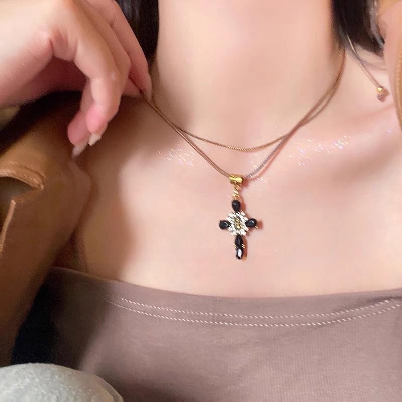 Collar Europeo y Americano Tejido Doble Capa Cruz para Mujer Nicho Retro Lujo Ligero Cadena Clavícula Diseño de Personalidad Única Cadena Collar Verano