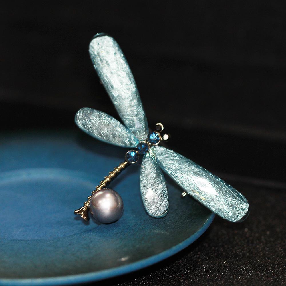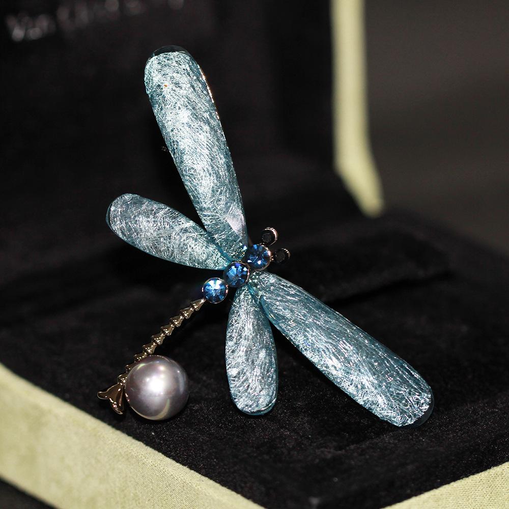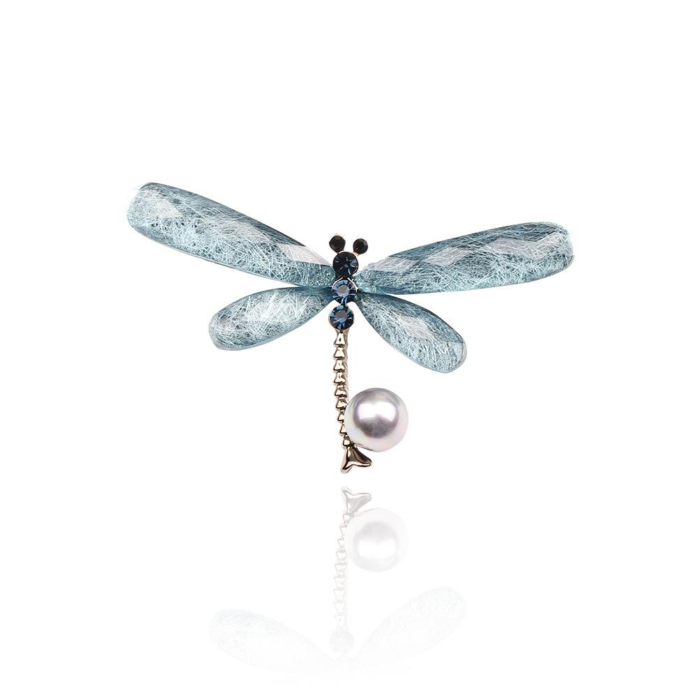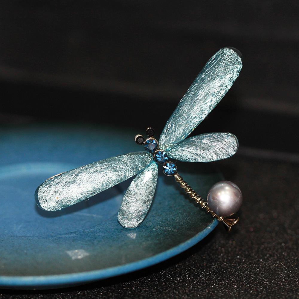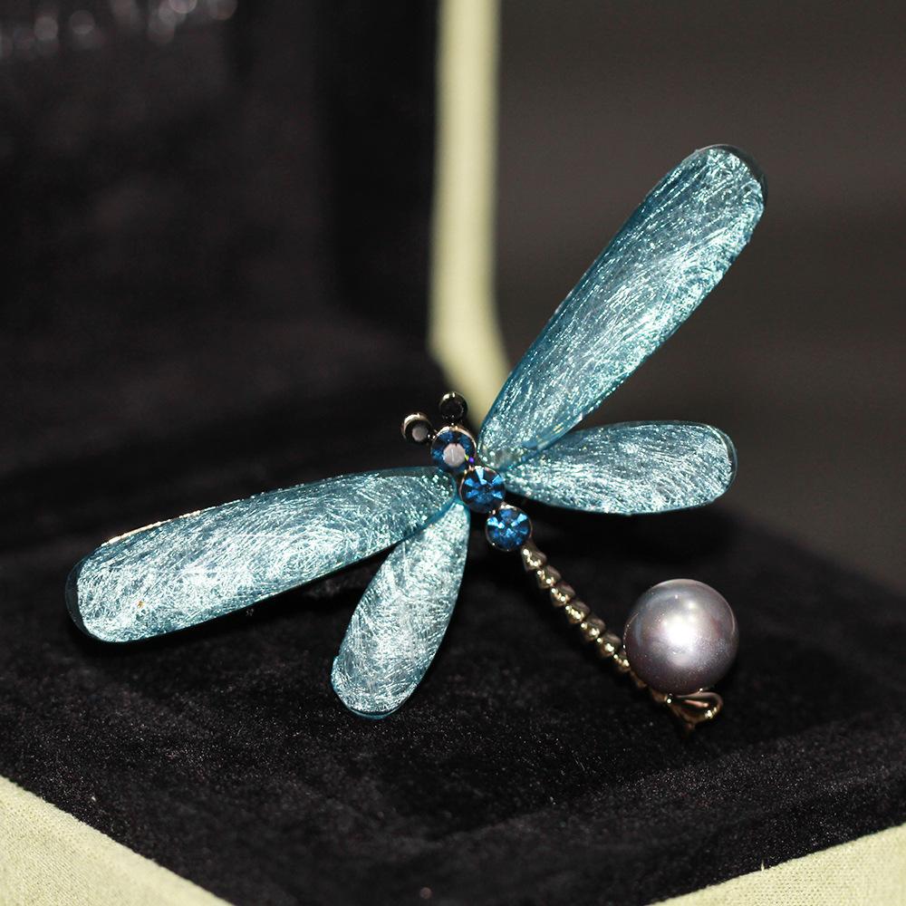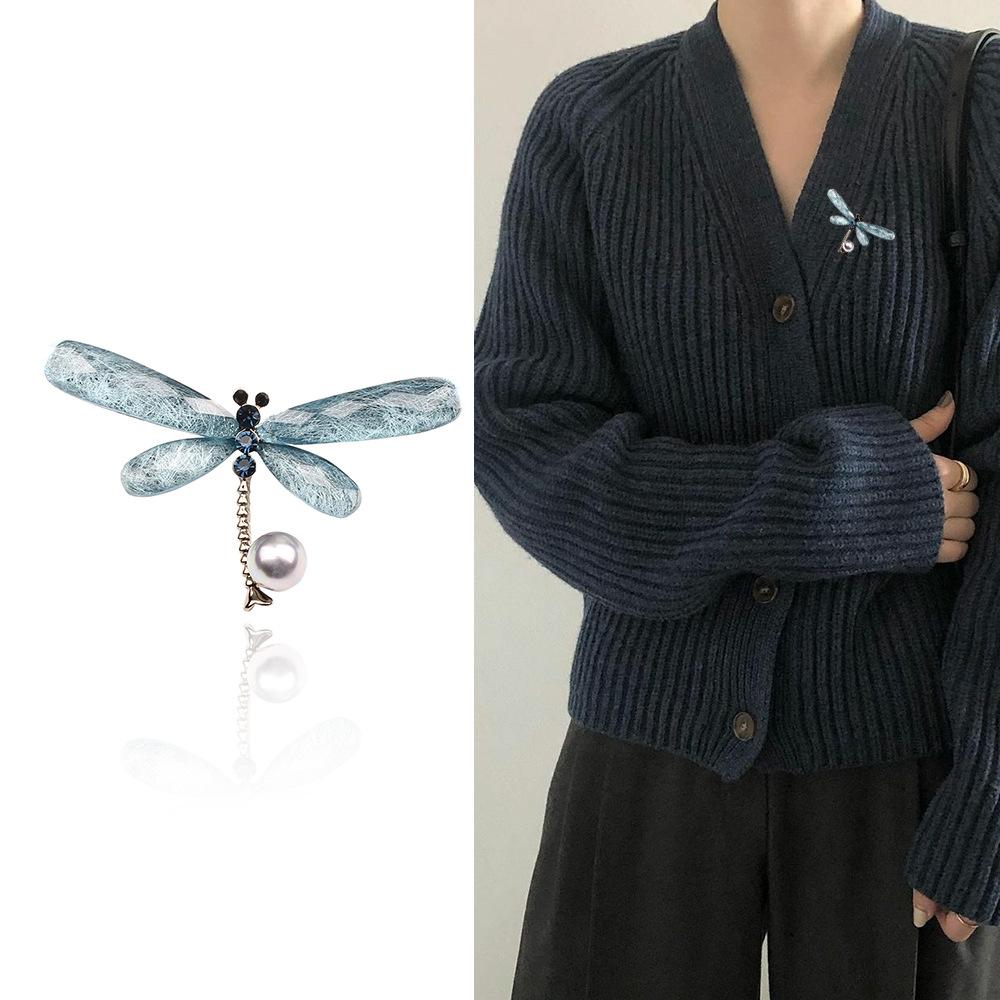 Broche clásico de libélula con placa azul Joker, temperamento, chapado en oro, broche de insecto con perla de imitación, elegante ramillete antiluz.