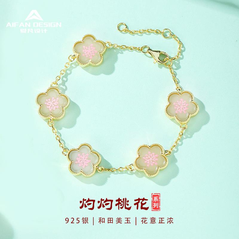Pulsera de moda y superventas serie flor de durazno para mujer verano nuevo S925 plata esterlina pura melocotón eres feliz pequeña fresca joyería de jade Hetian