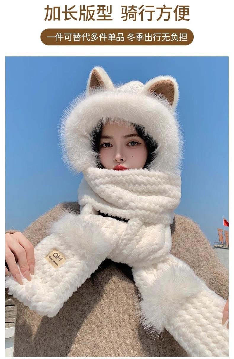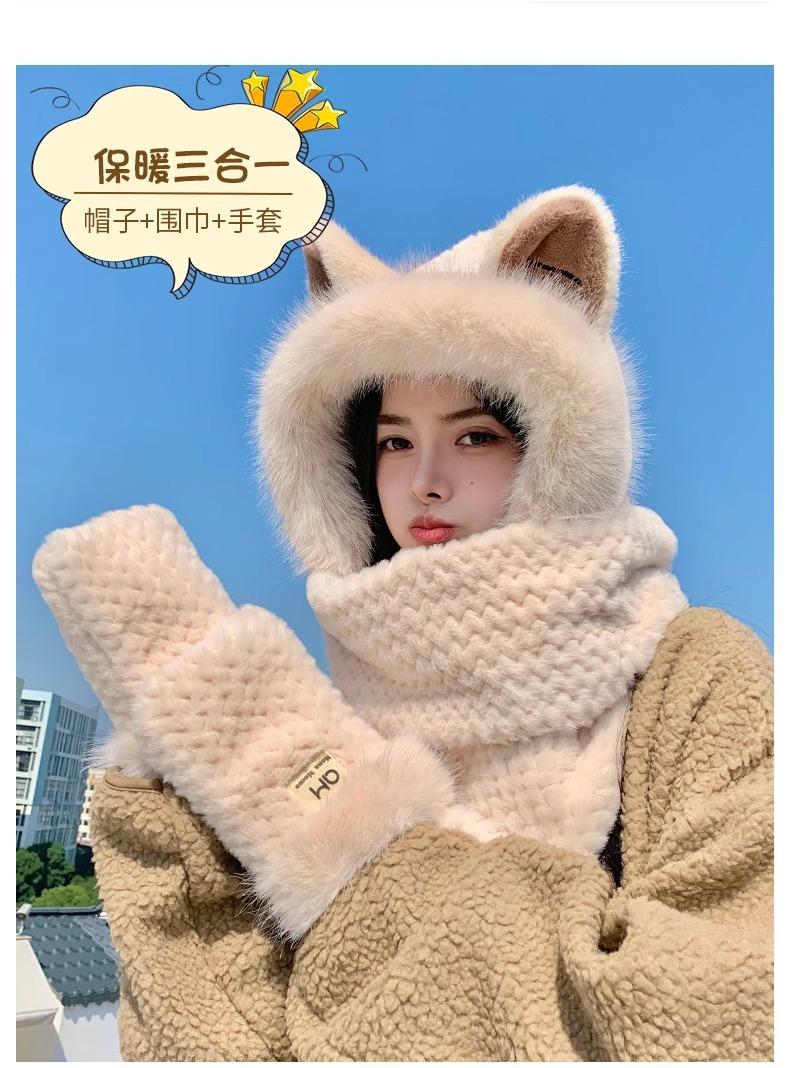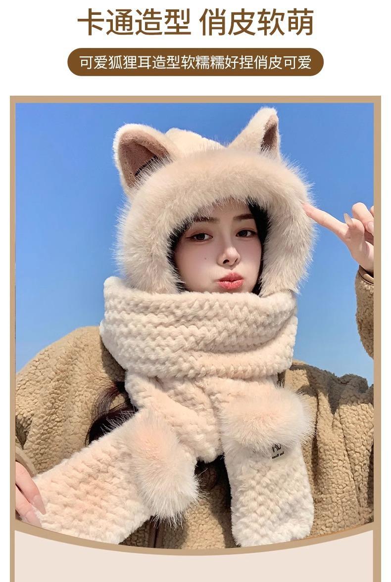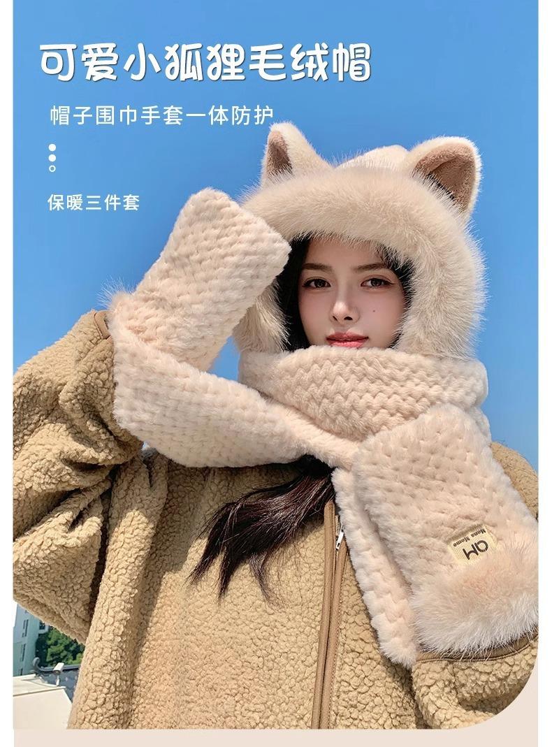 Conjunto de tres piezas de sombrero, bufanda y guantes para invierno para mujer, bufanda de terciopelo afelpado de una pieza para ciclismo, lindo con orejas de zorro, protección para las orejas