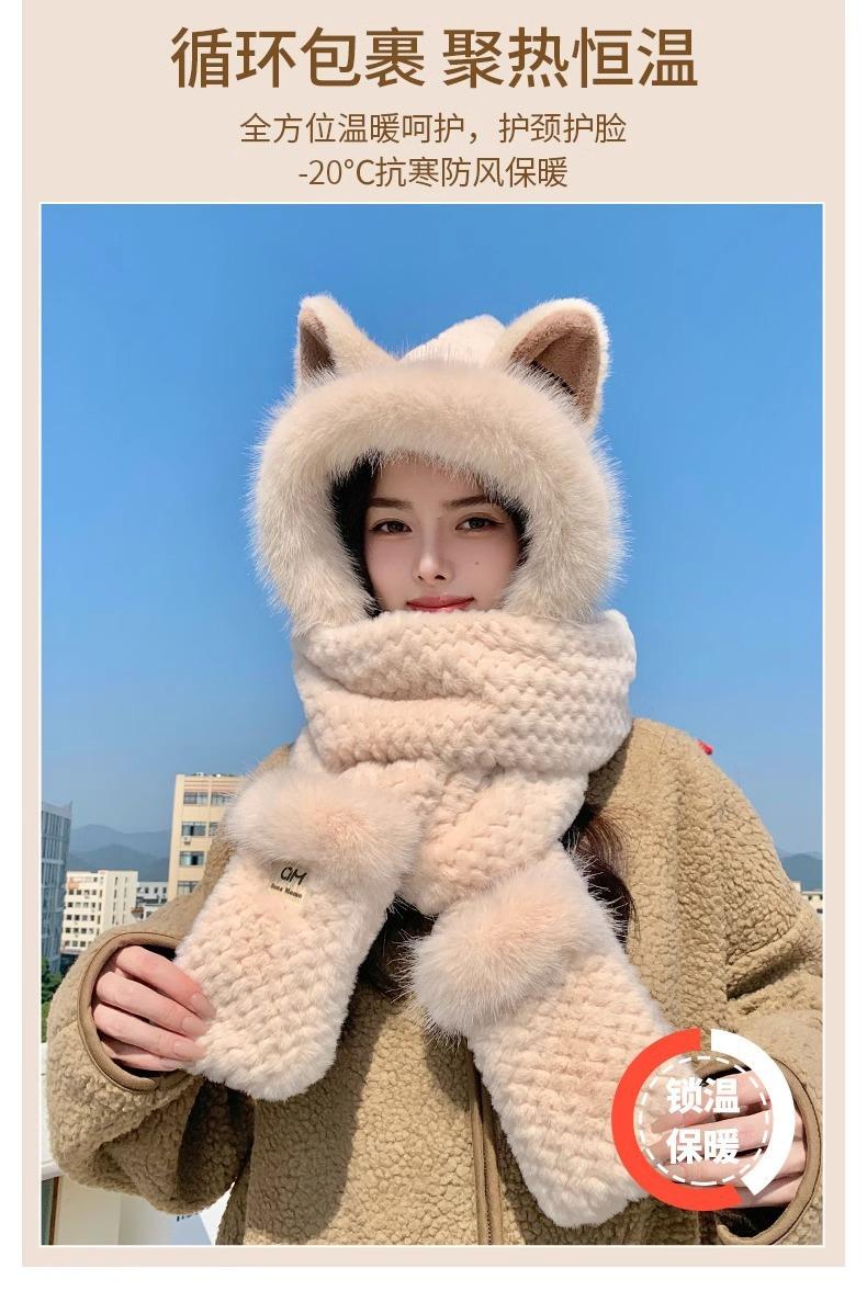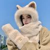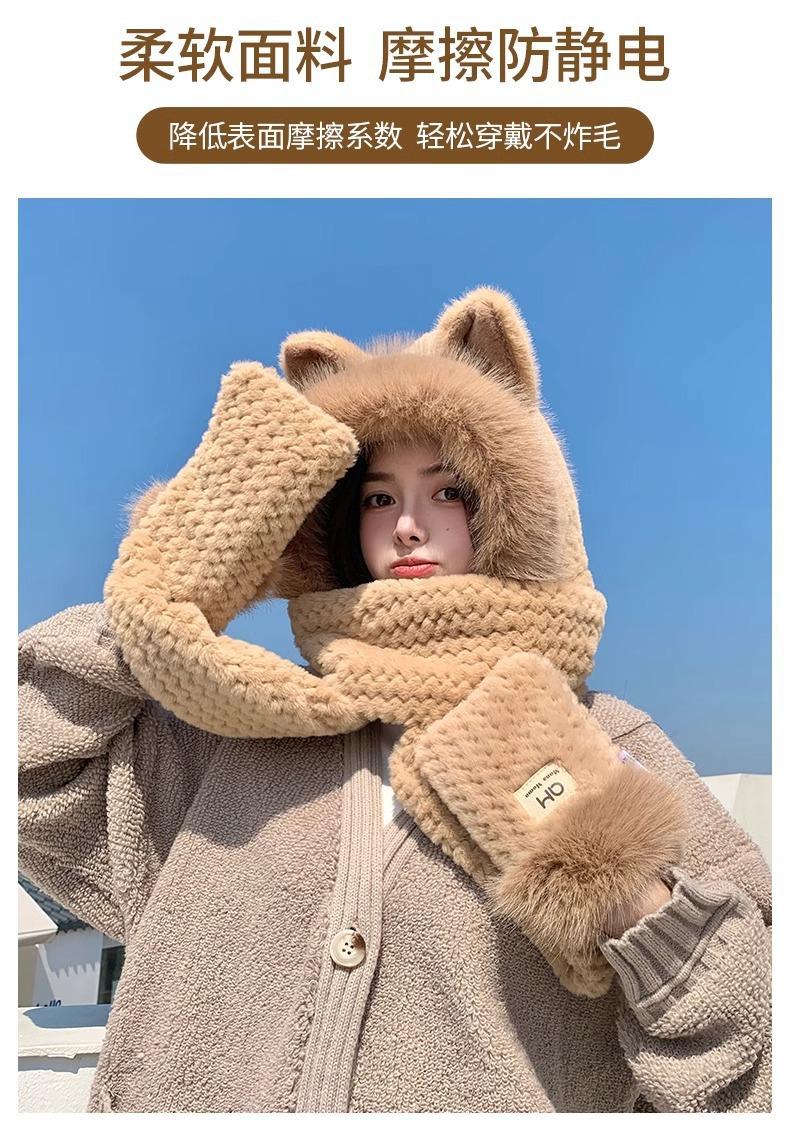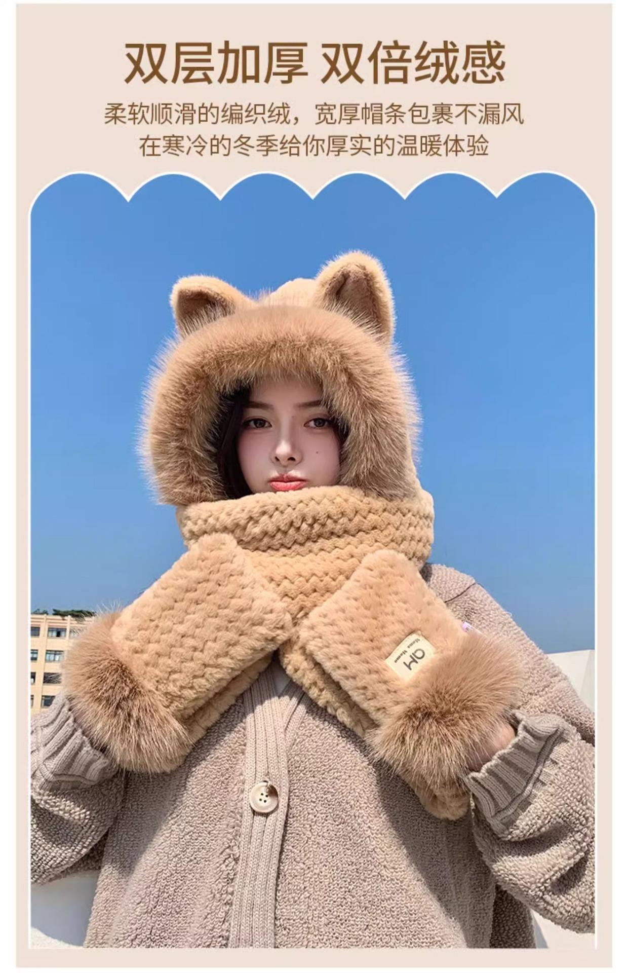 Conjunto de tres piezas de sombrero, bufanda y guantes para invierno para mujer, bufanda de terciopelo afelpado de una pieza para ciclismo, lindo con orejas de zorro, protección para las orejas