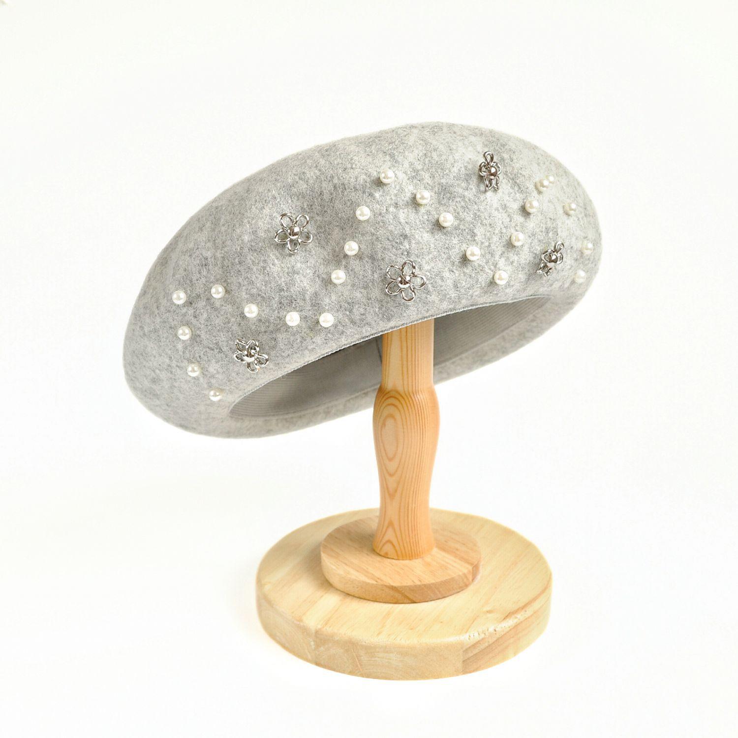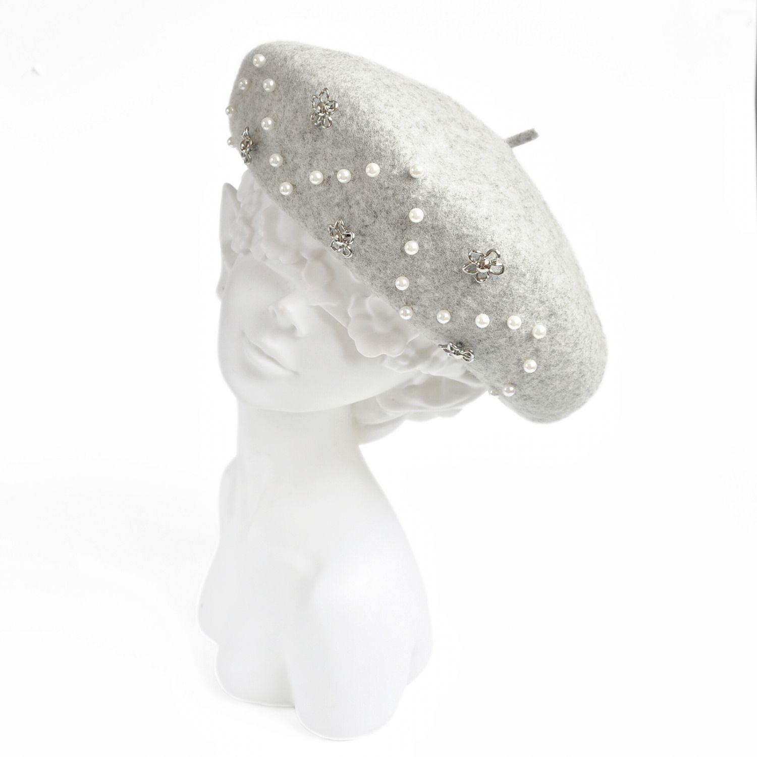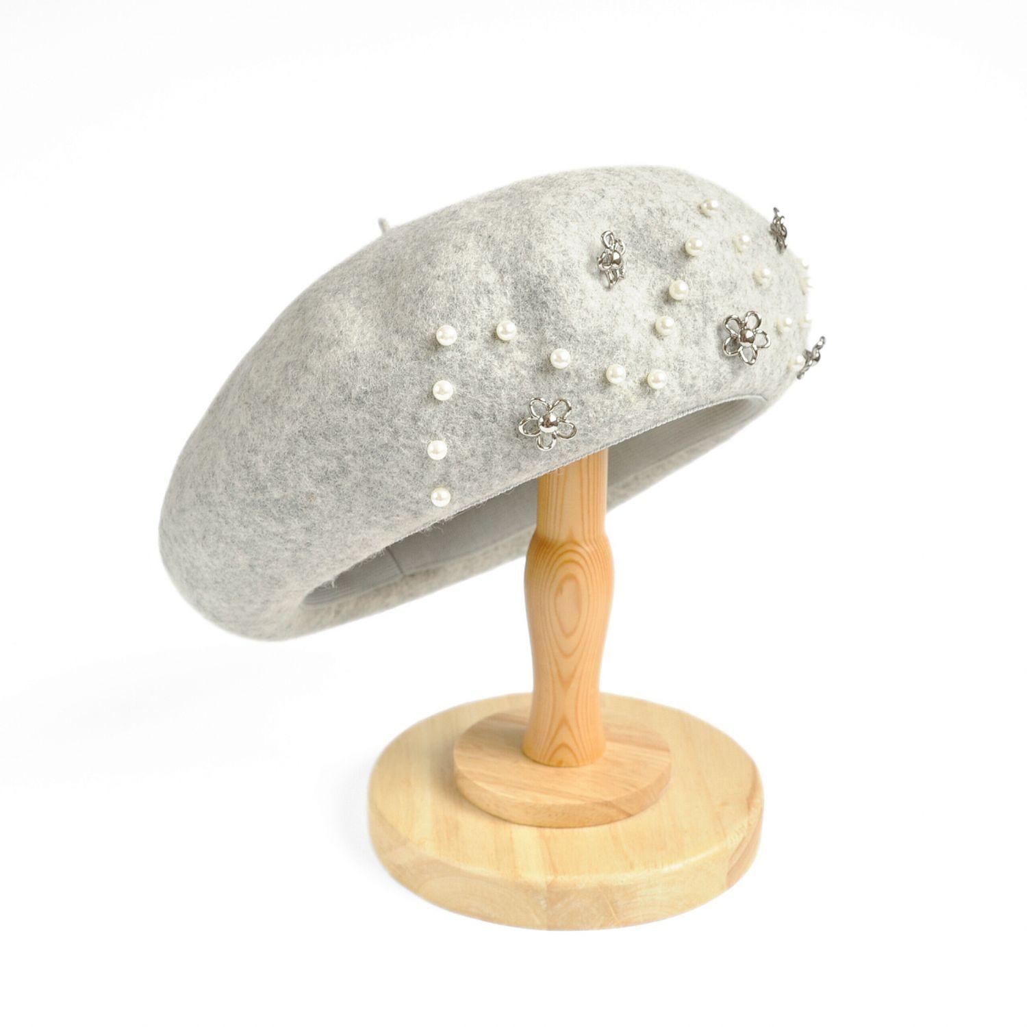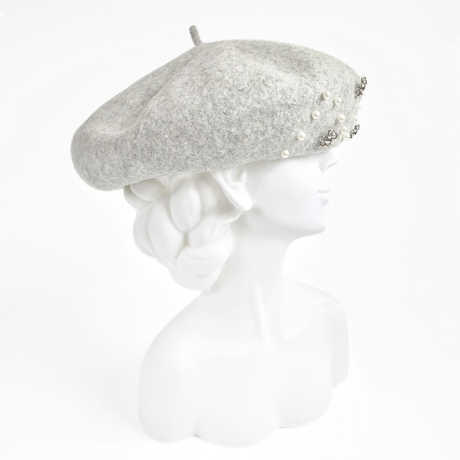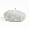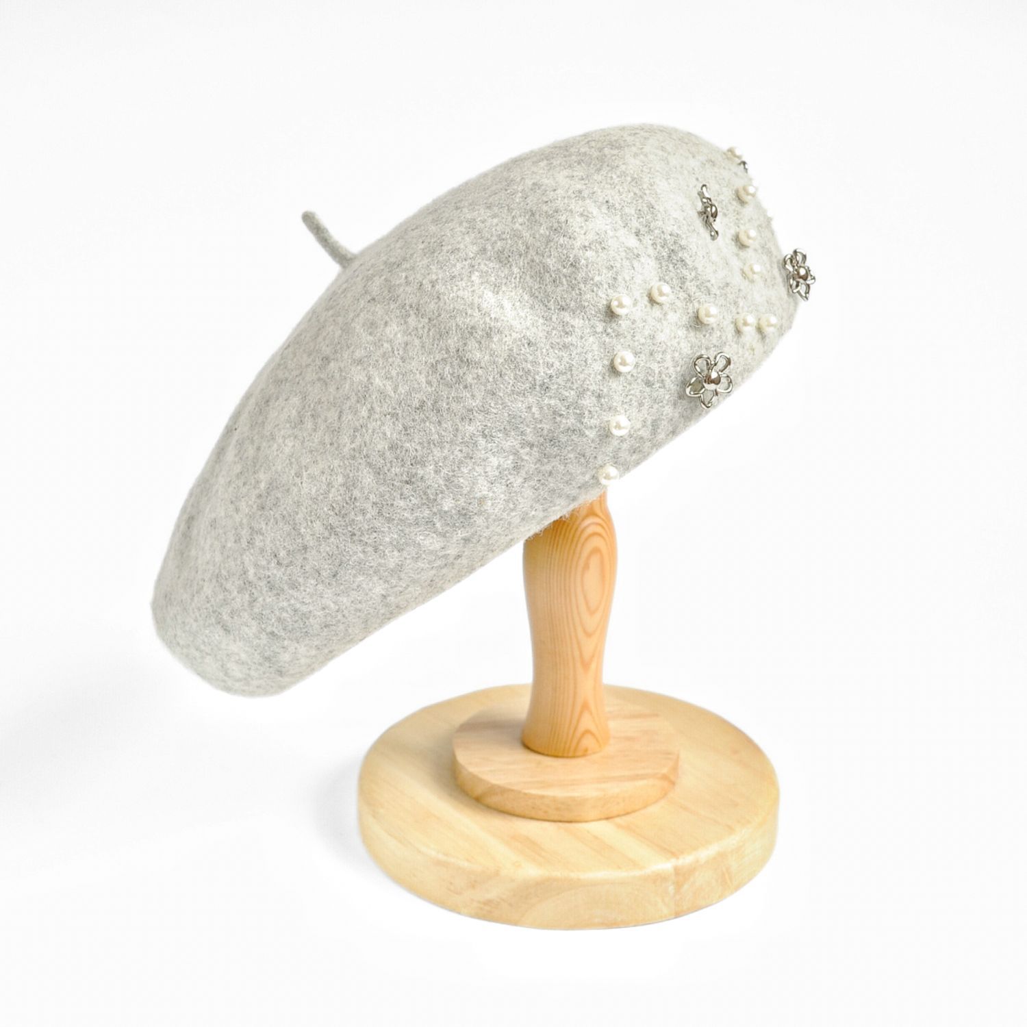 Otoño e Invierno Nuevo Estilo Sombrero de Pintor de Lana estilo Chanel para Mujer Flor Cosida a Mano Gris Perla de Industria Pesada Boina de Lana Estéreo