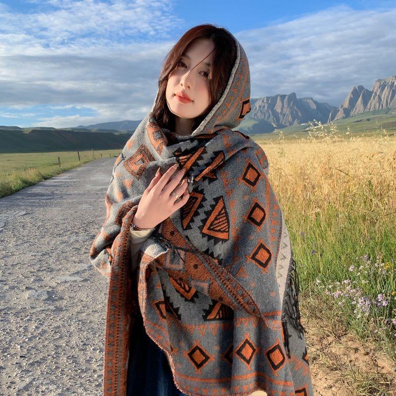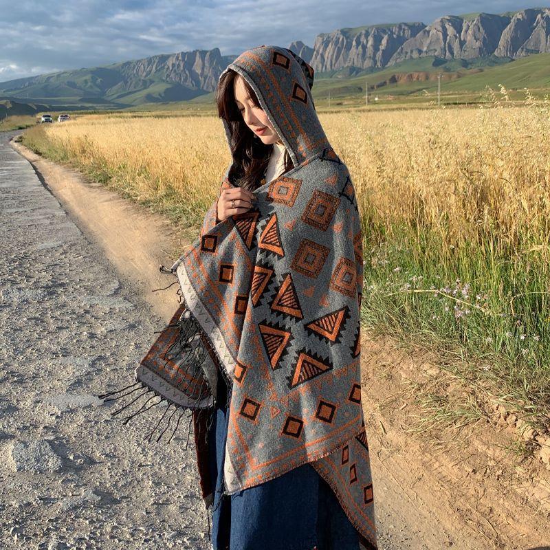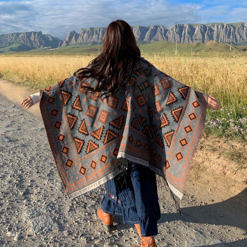 Chal de estilo étnico Yunnan Xinjiang Xizang Fotografía turística Chal Sombrero Borla Capa Cálida Protección solar Ropa exterior