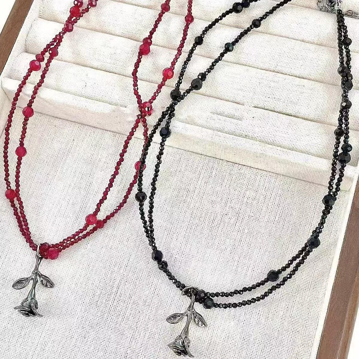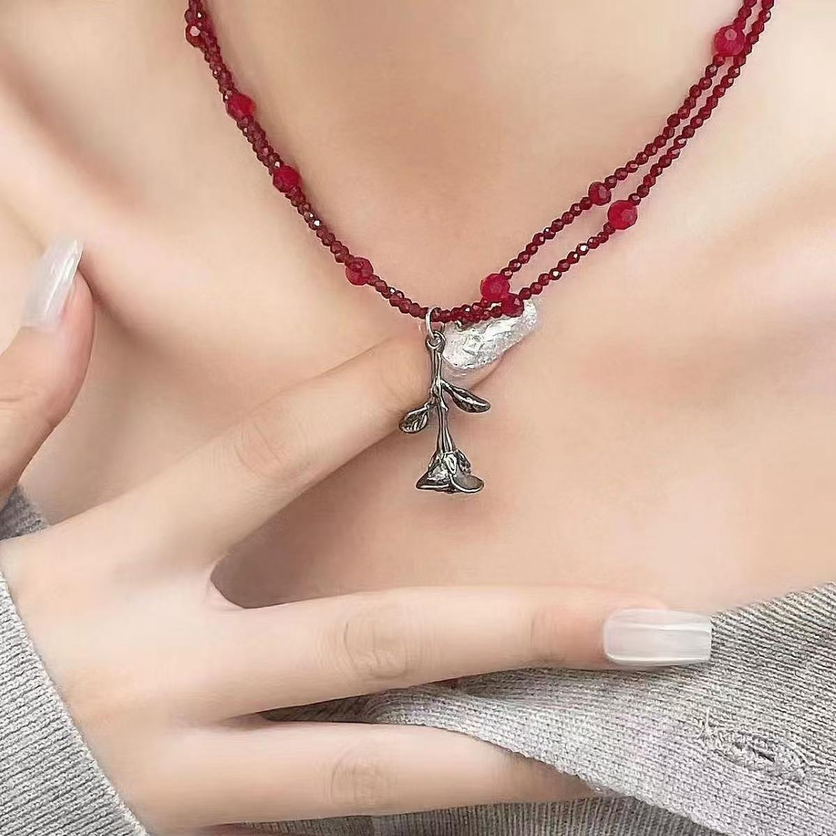 Collar con colgante de rosa dulce y fresca de moda con doble cadena de clavícula de cristal, con temperamento europeo y americano, diseño de nicho exquisito