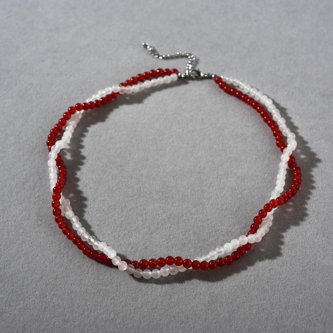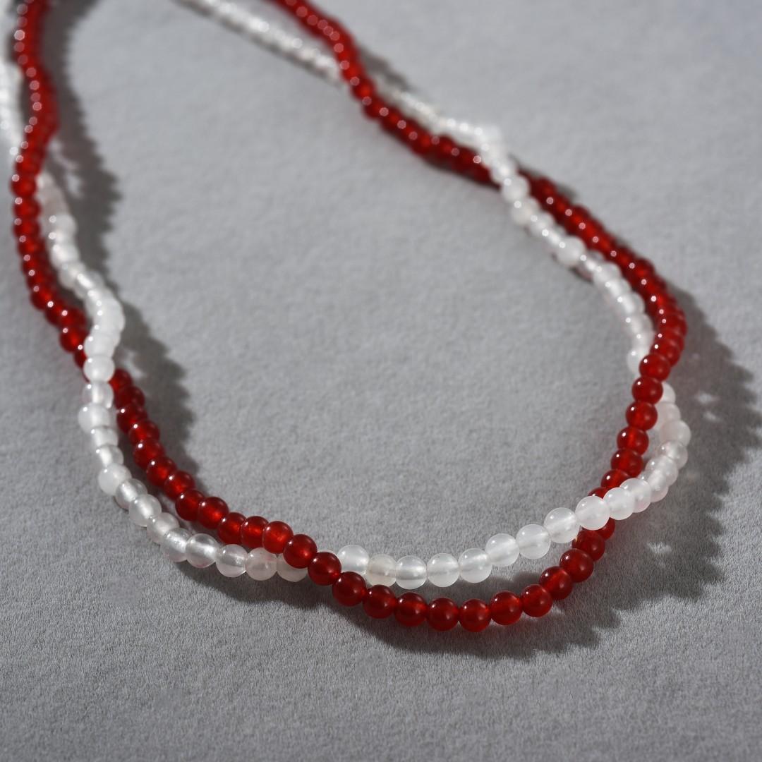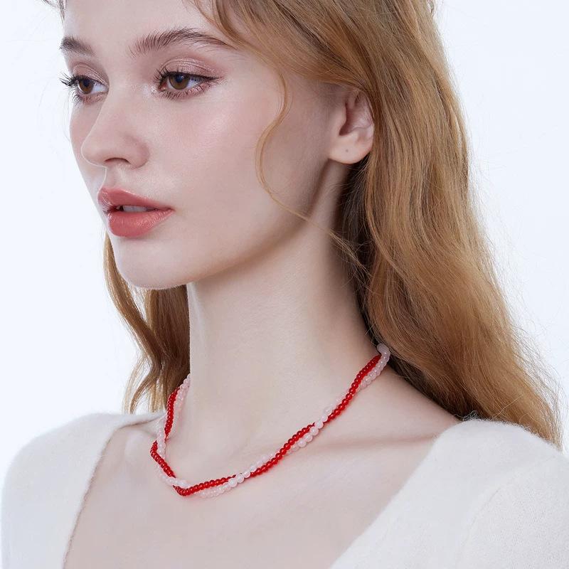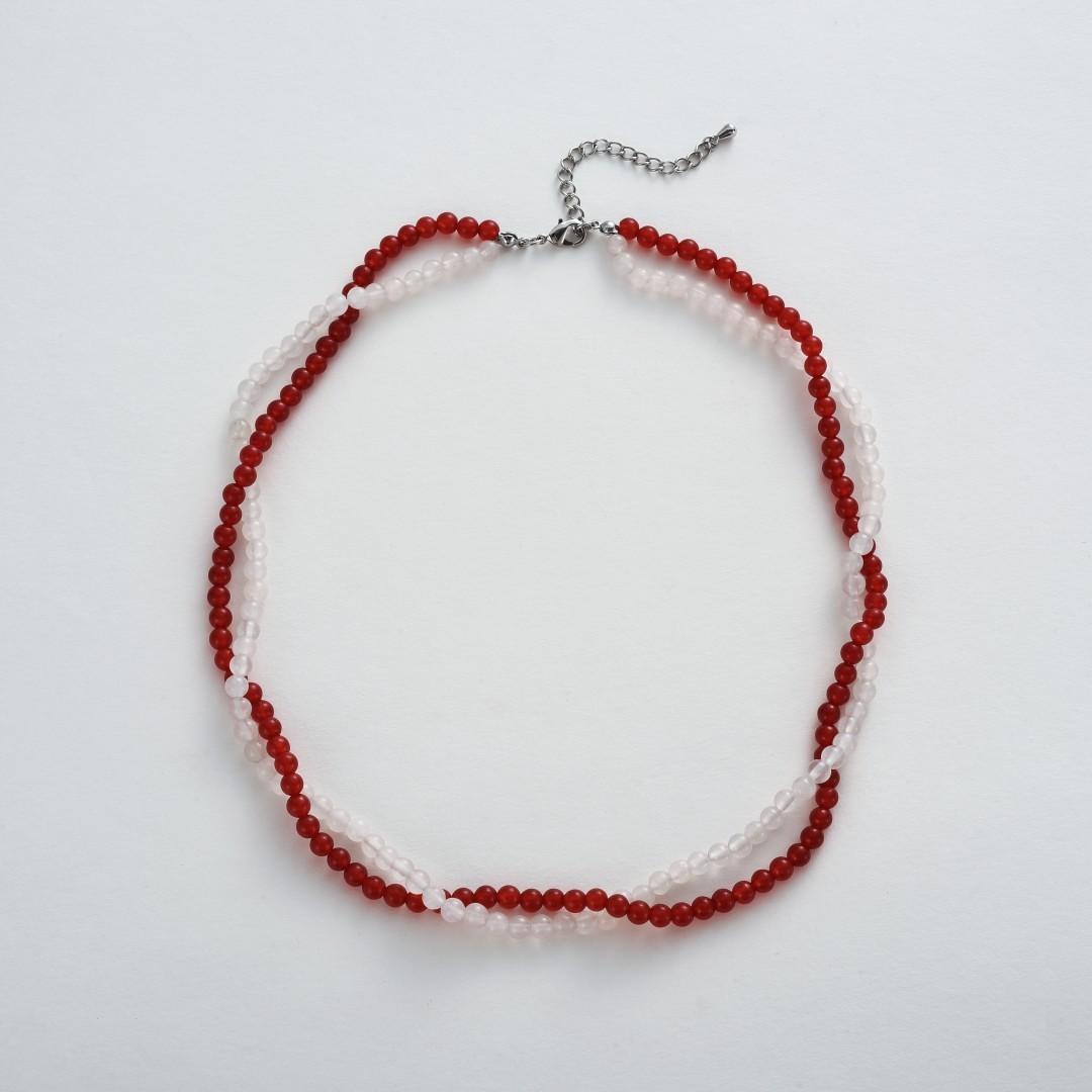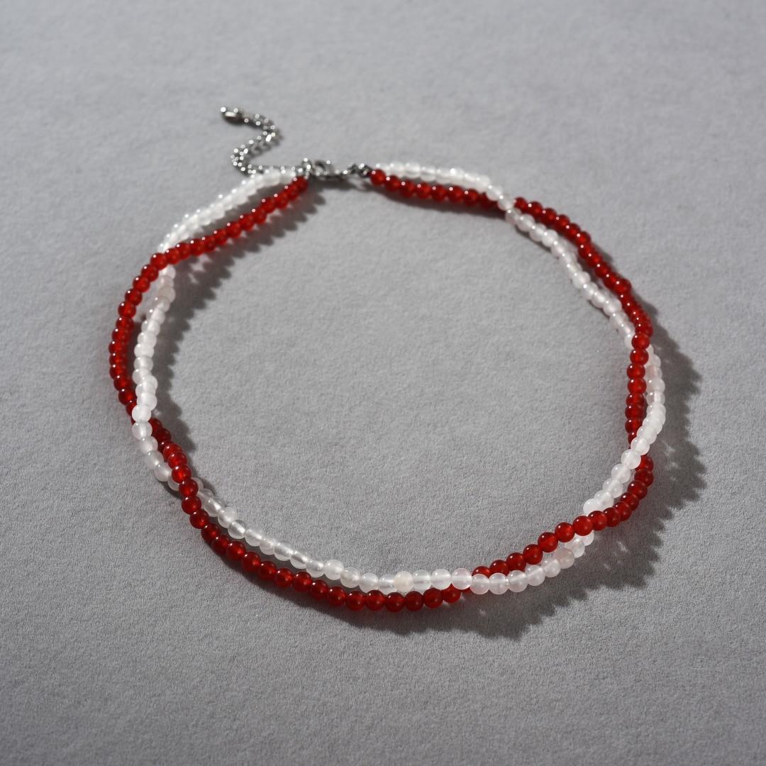 Material: Cobre bañado en platino + piedra blanca + ágata roja.Tamaño: 42 cm + cadena de extensión de 5 cm