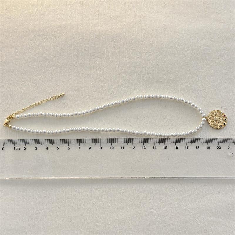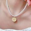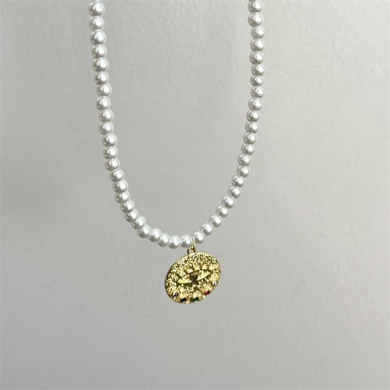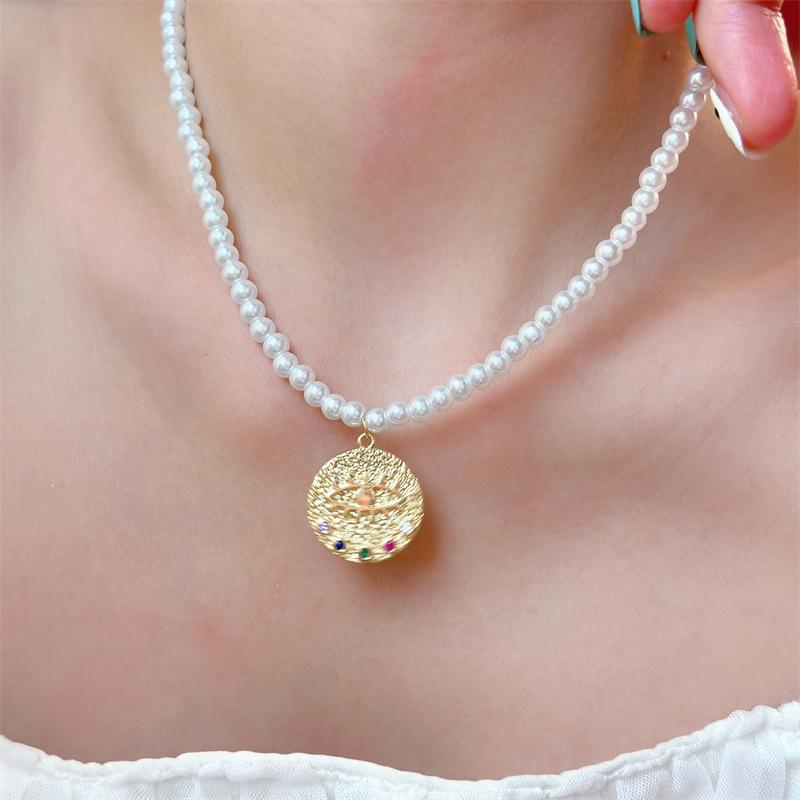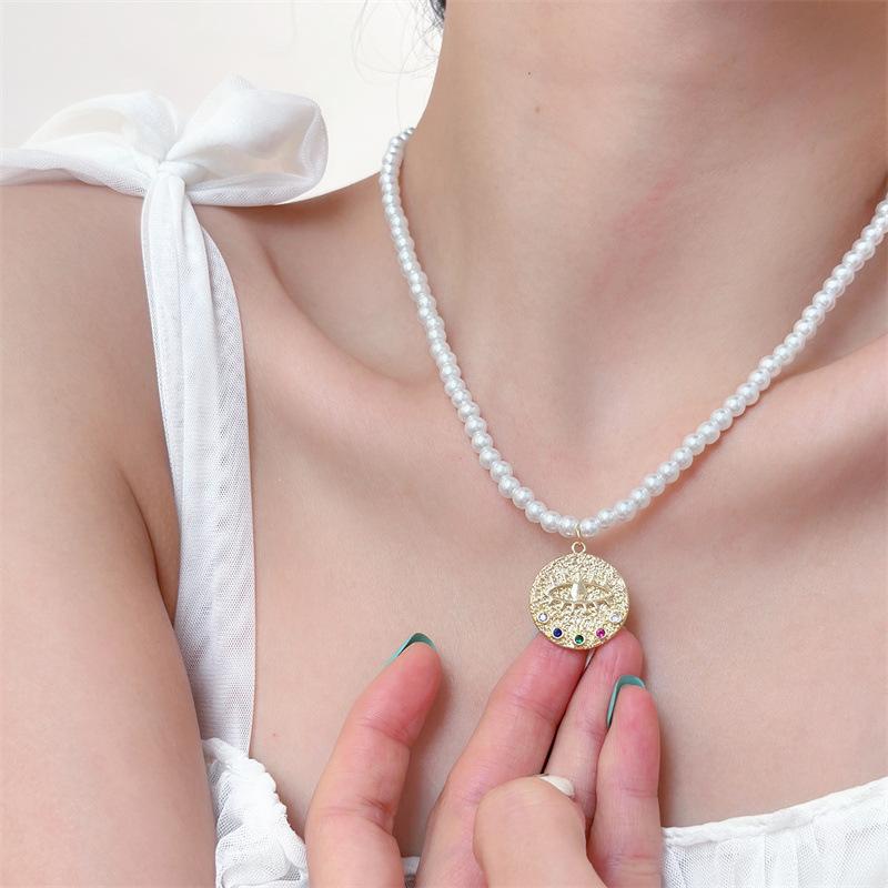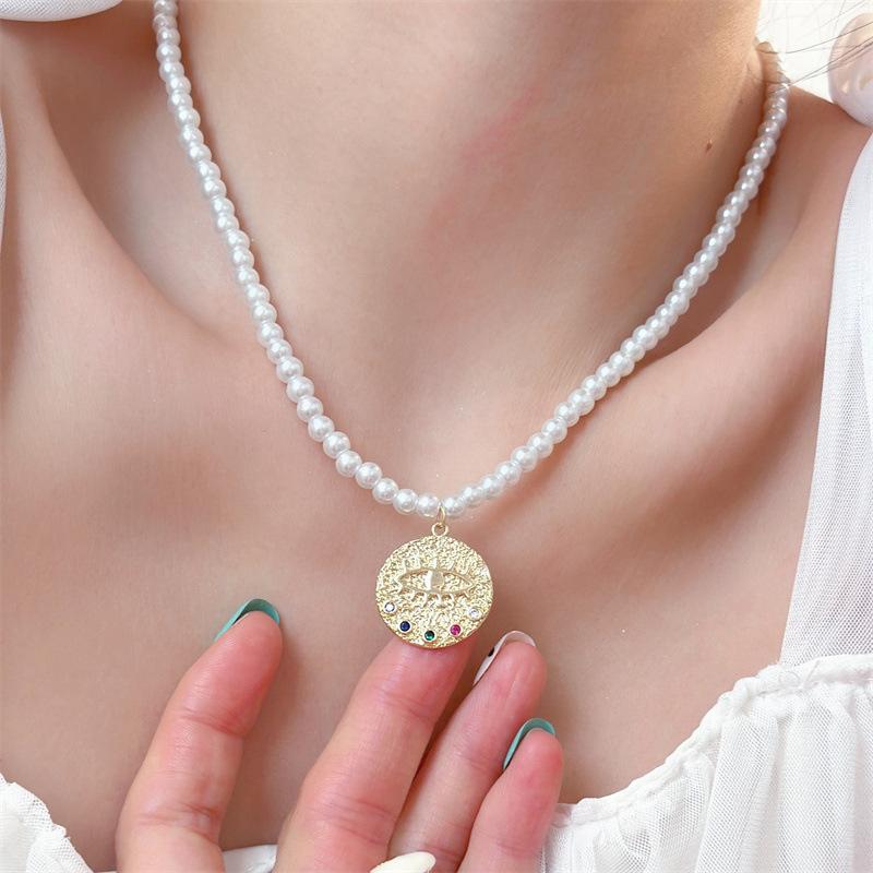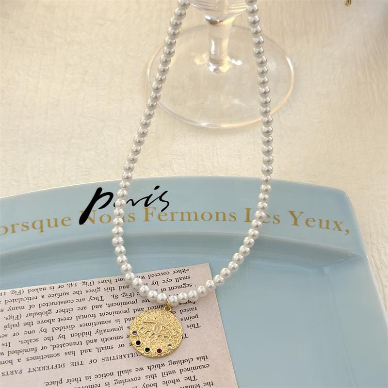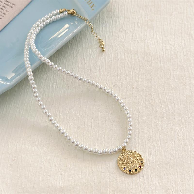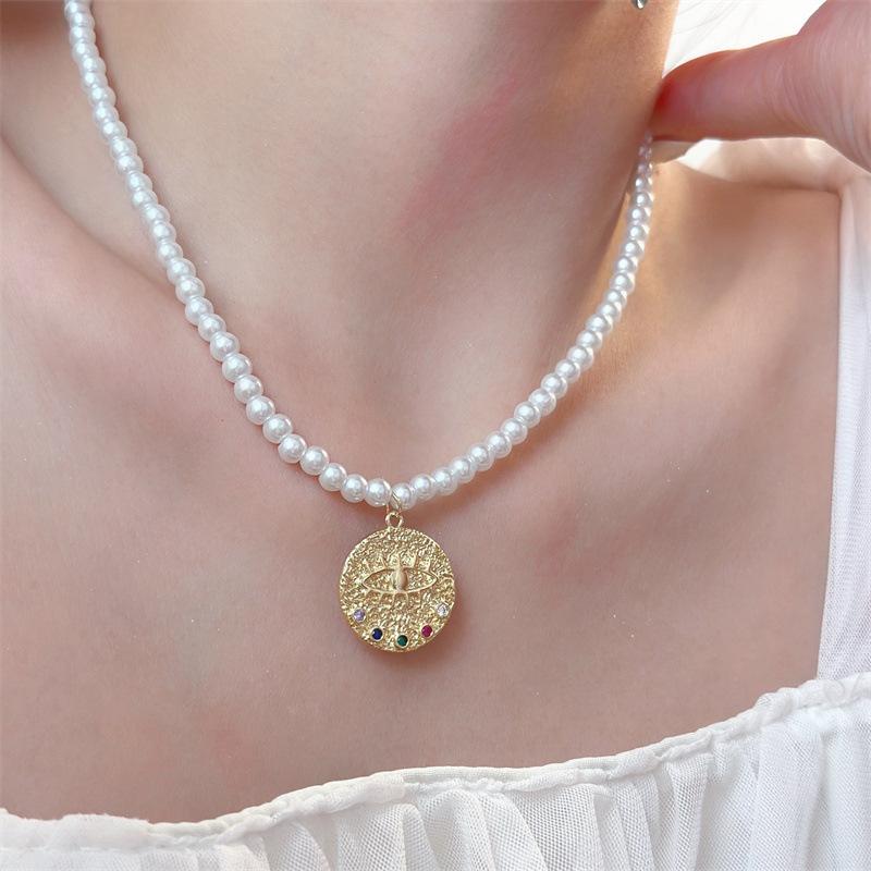 Collar de perlas naturales con forma de ojo de diablo de estilo Baihe blanco con moneda de oro, cadena de clavícula de perlas de agua dulce de alta calidad retro para mujer