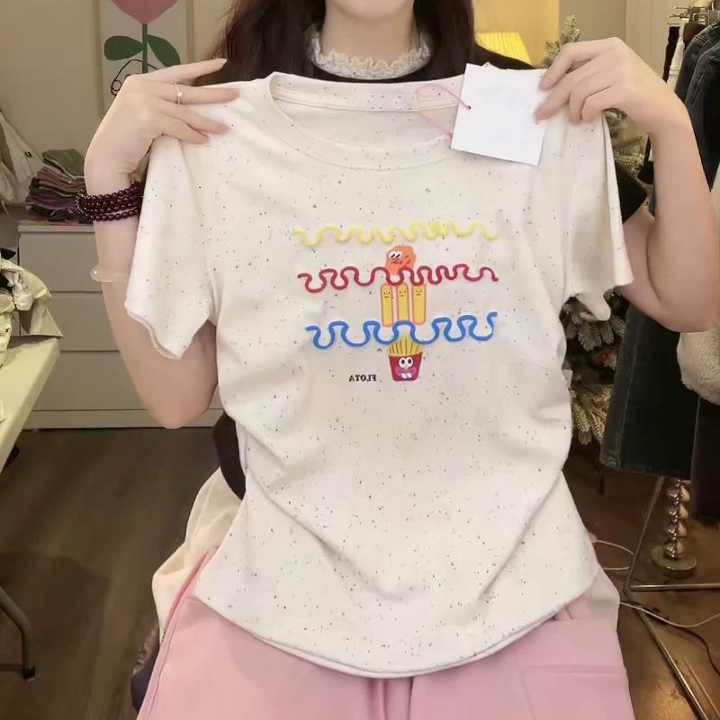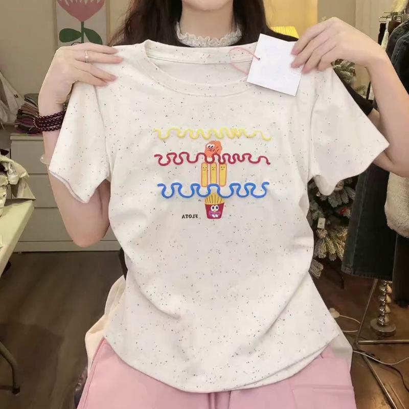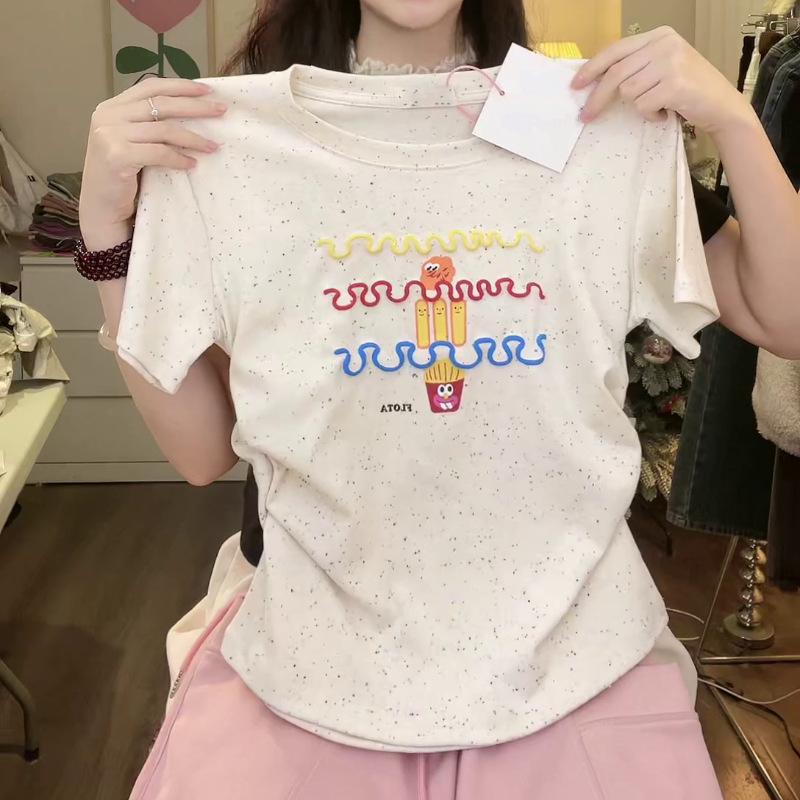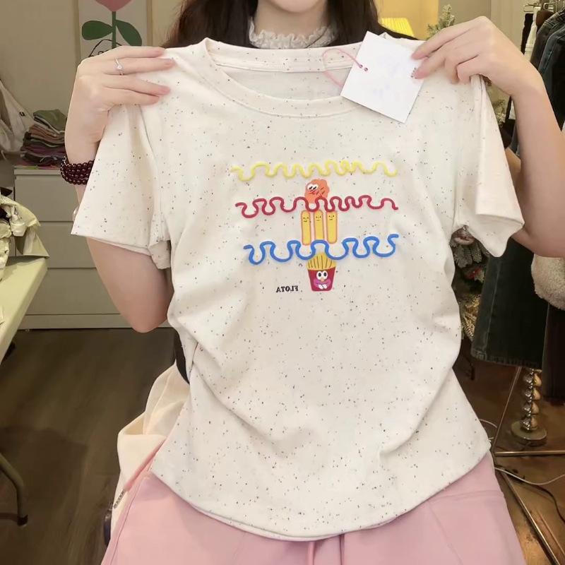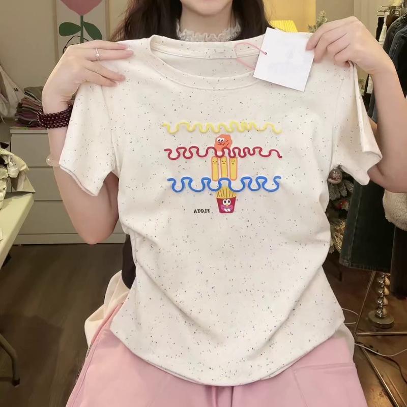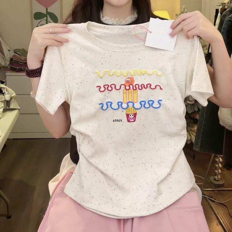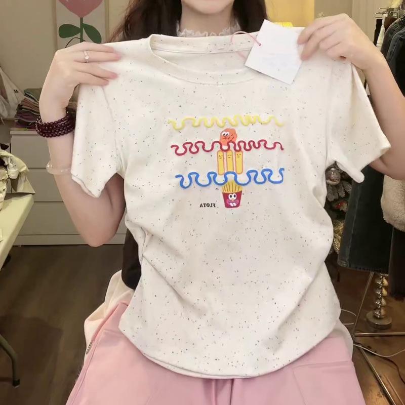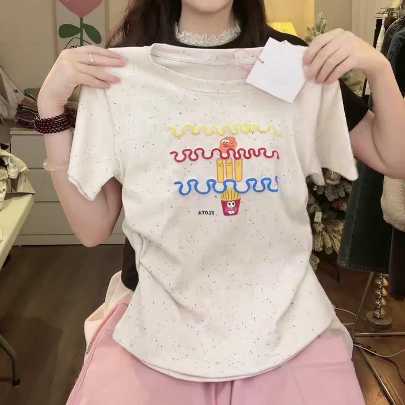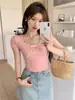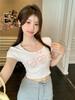 Nueva y dulce camiseta de manga corta con hombros bordados para mujer, diseño de verano, corte entallado, top corto ajustado