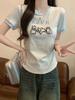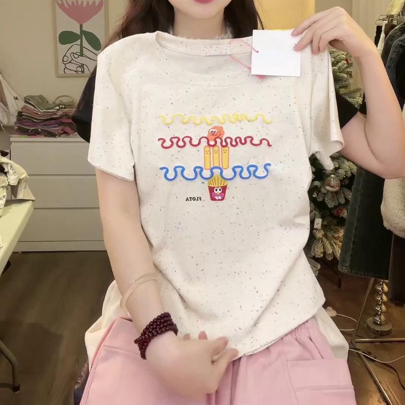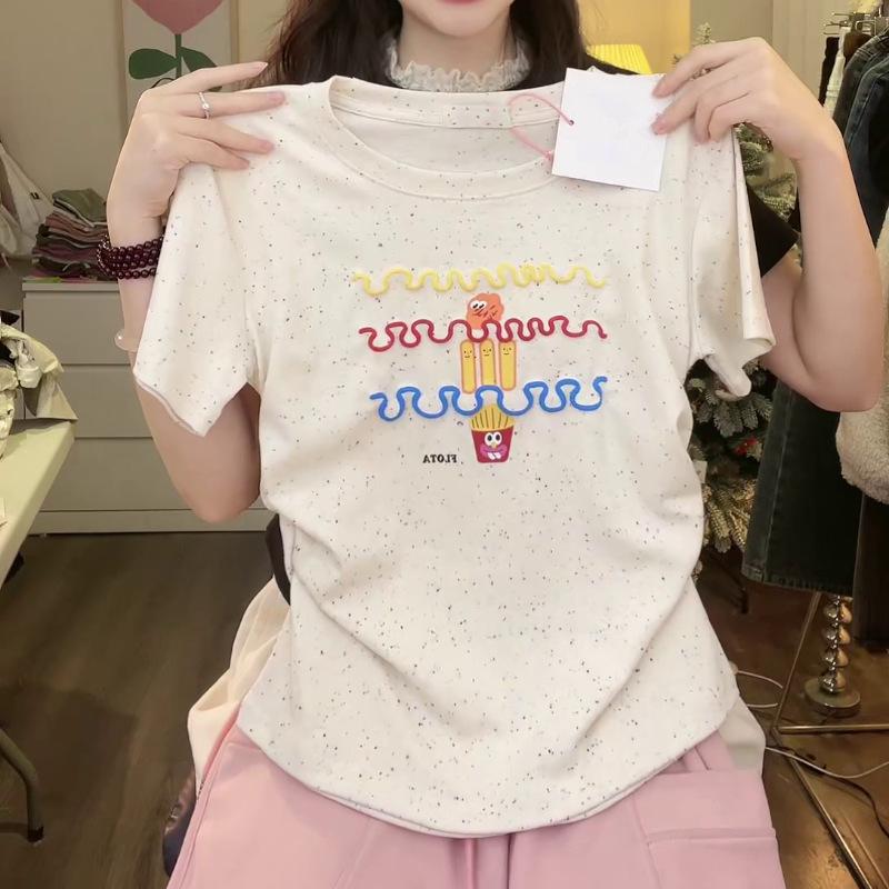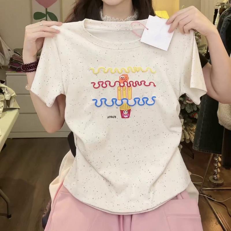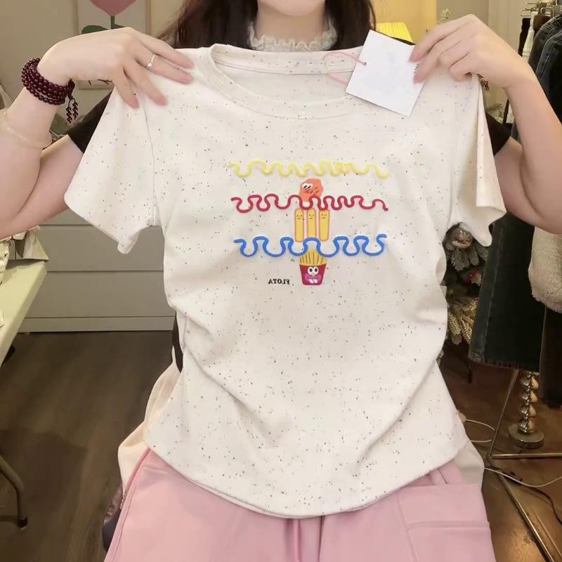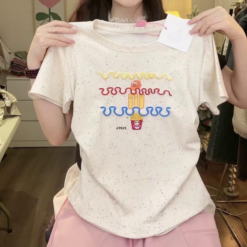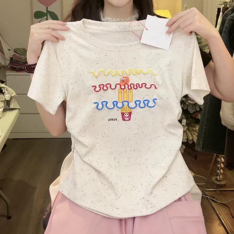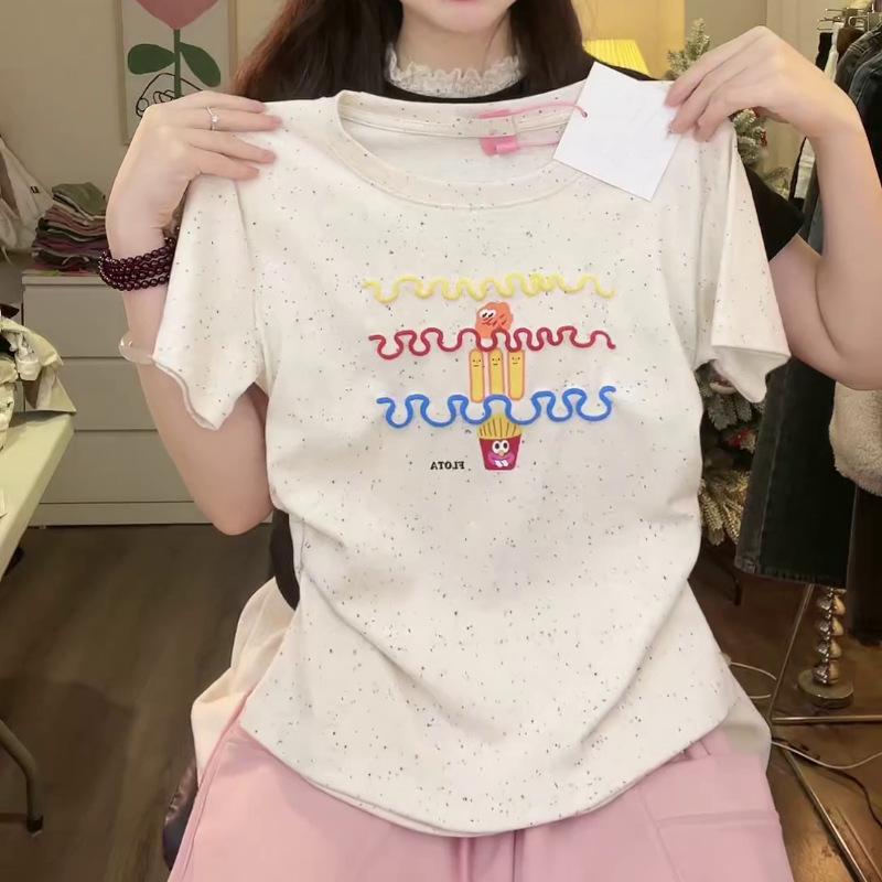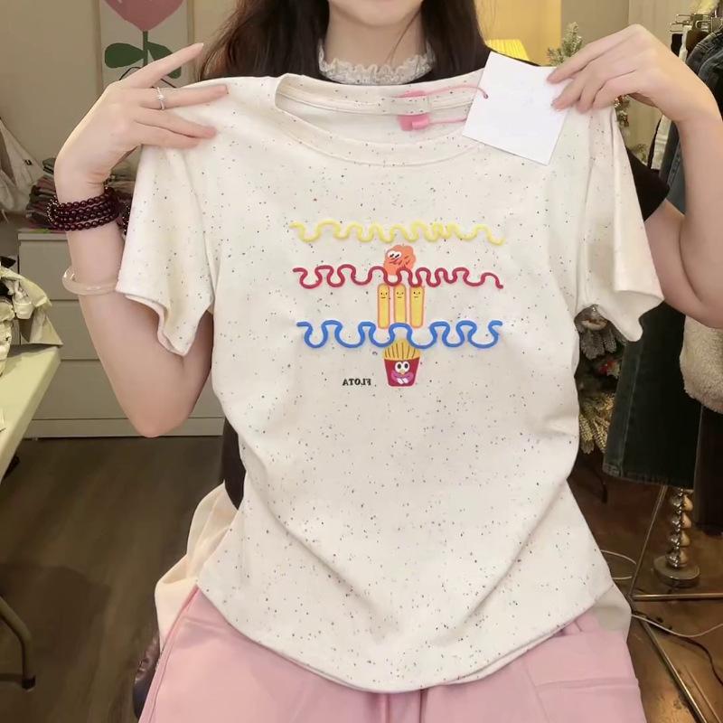 Nueva y dulce camiseta de manga corta con hombros bordados para mujer, diseño de verano, corte entallado, top corto ajustado