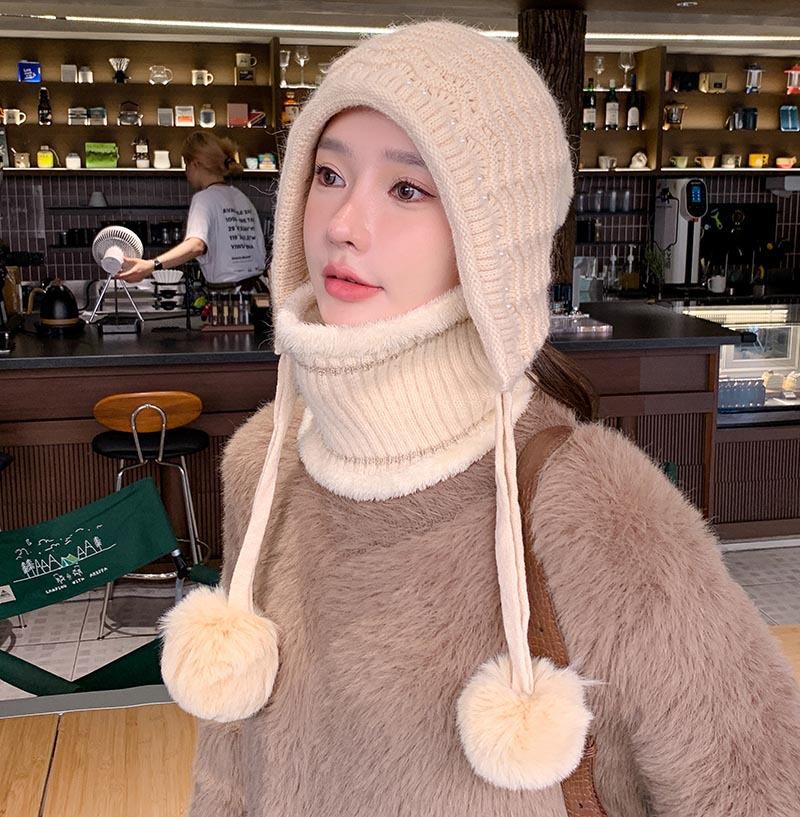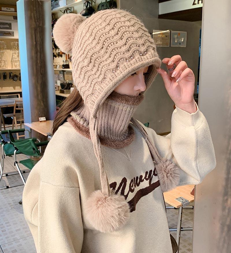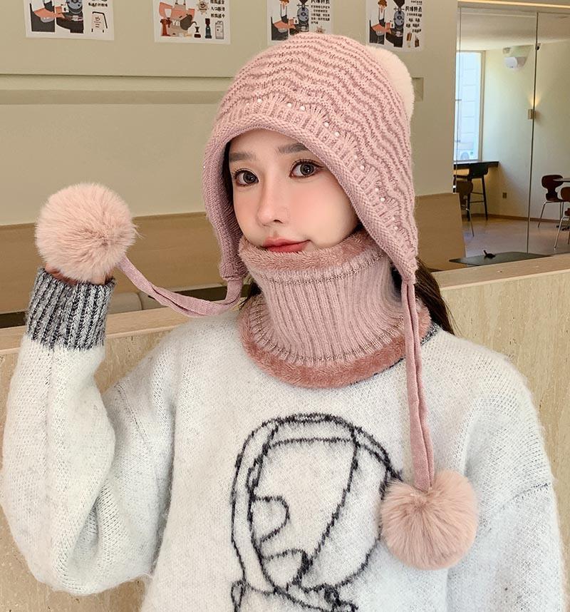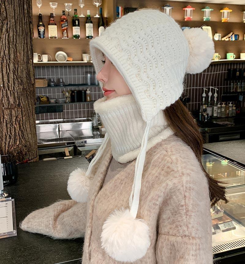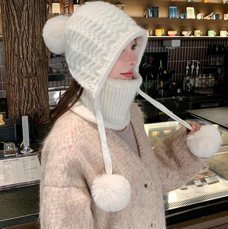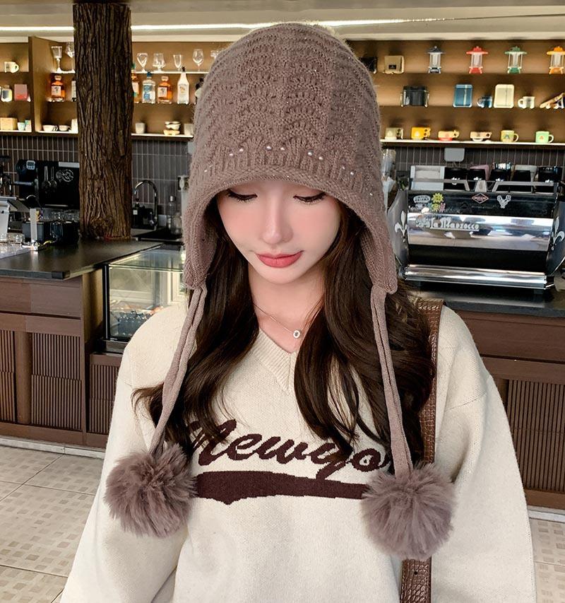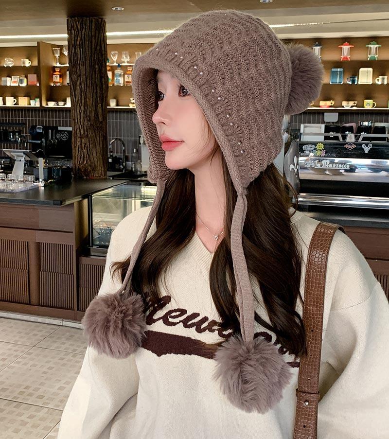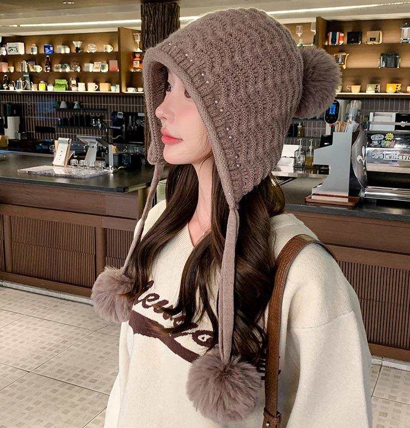 Gorro de lana de punto con protección para los oídos, con cordones, resistente al frío, con tres bolas de pelo, cálido, de piel de conejo, para niños, con forro polar de invierno, grueso y protector facial.
