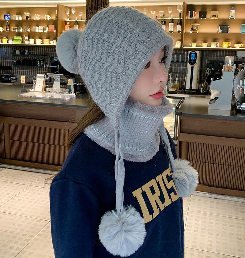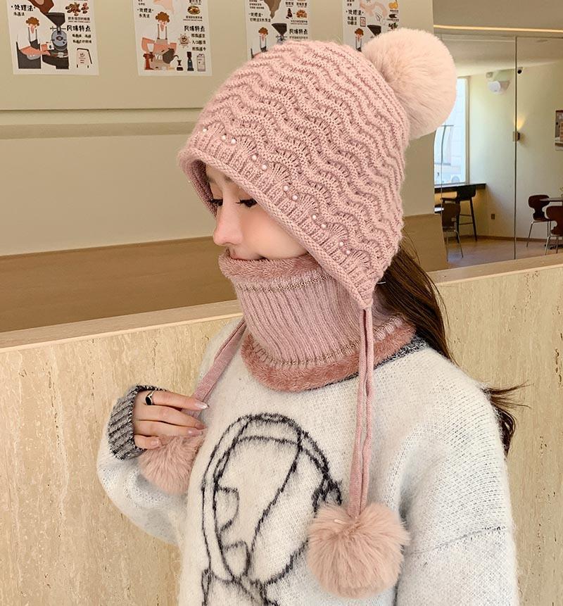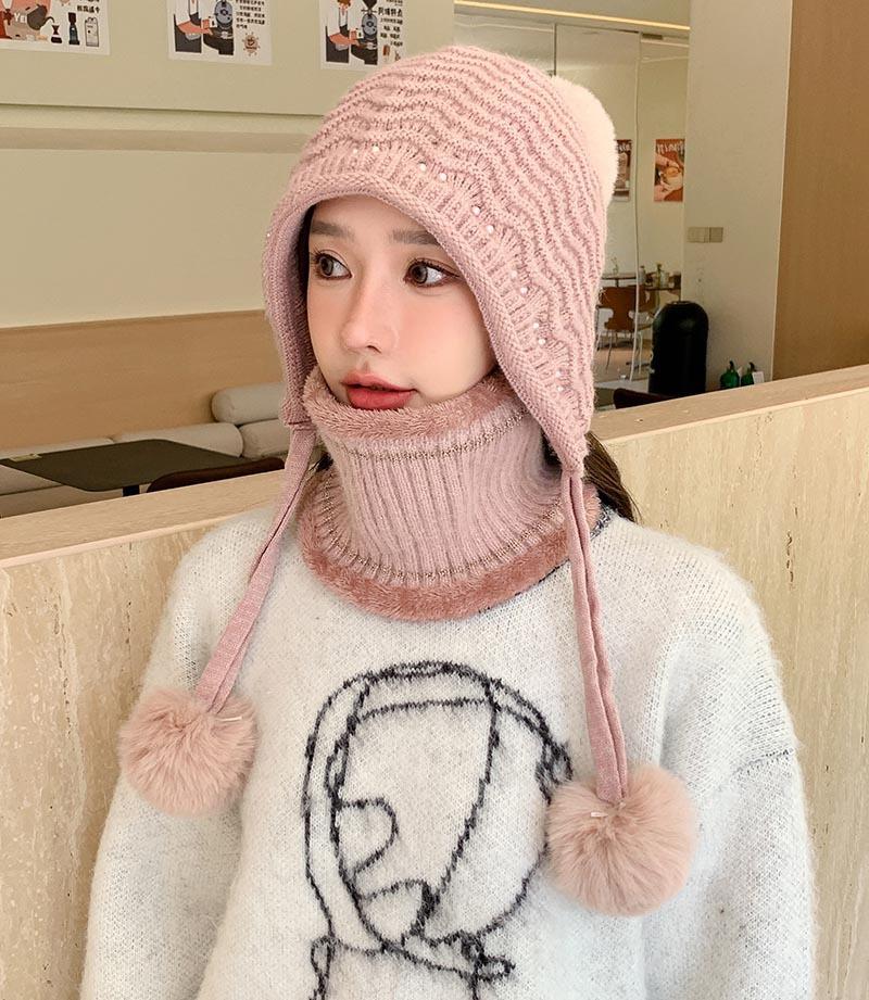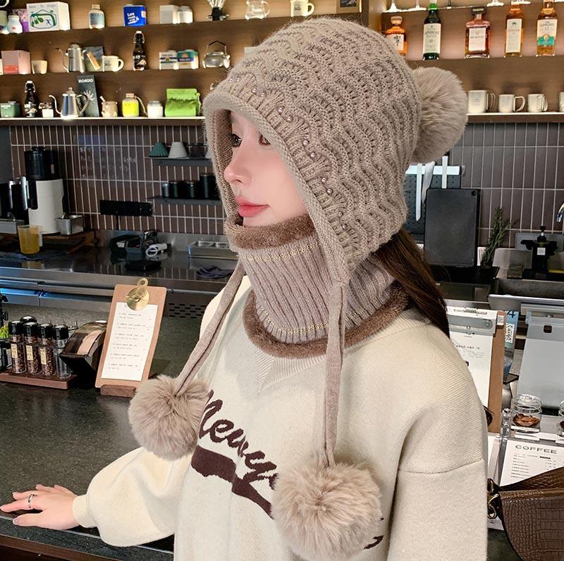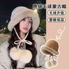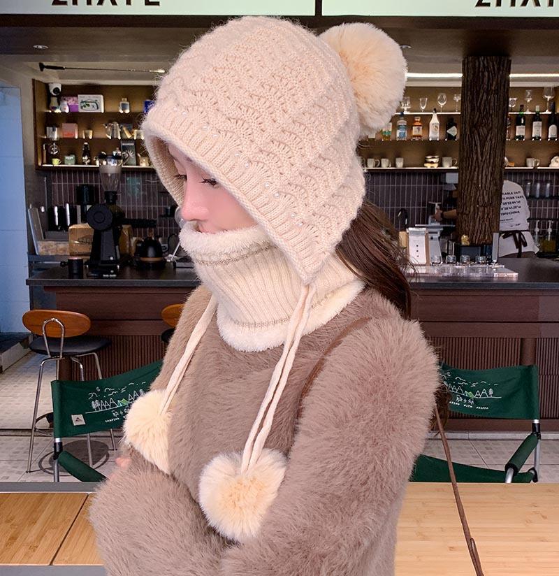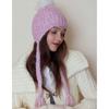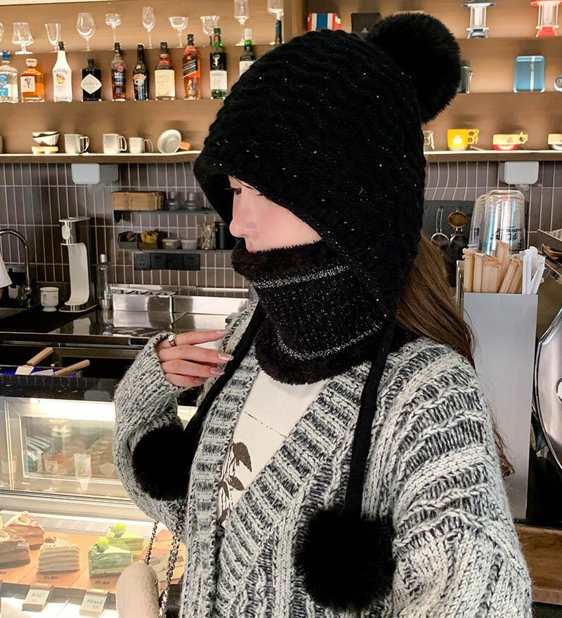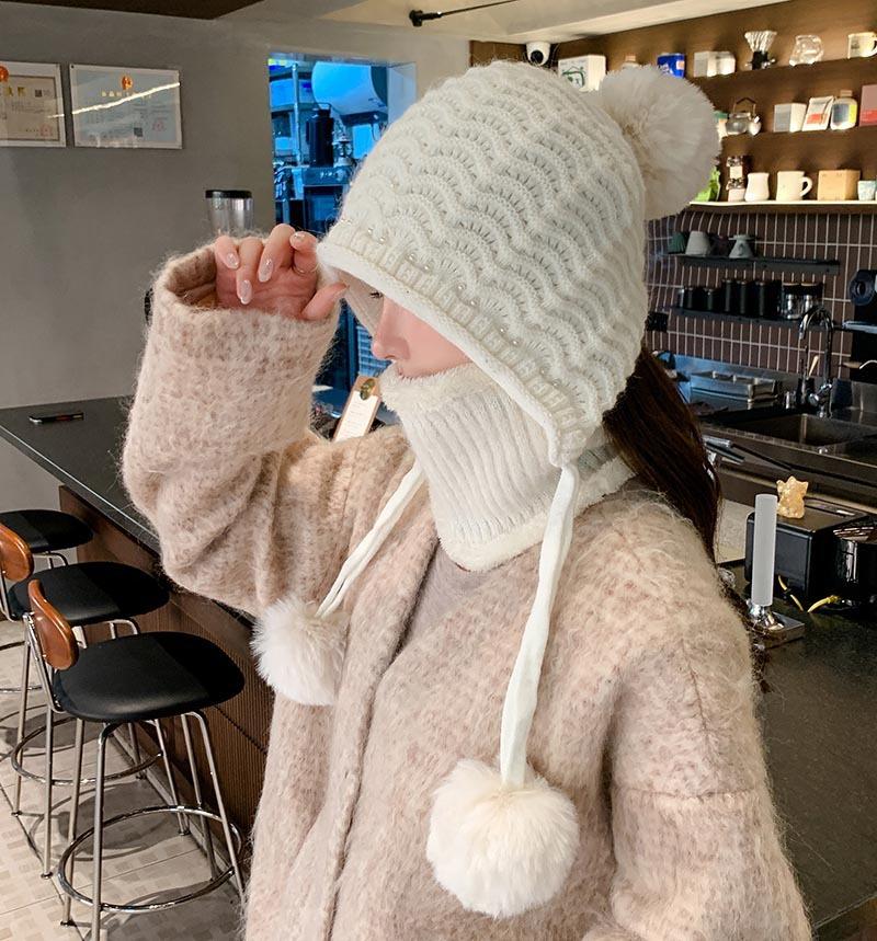 Gorro de lana de punto con protección para los oídos, con cordones, resistente al frío, con tres bolas de pelo, cálido, de piel de conejo, para niños, con forro polar de invierno, grueso y protector facial.