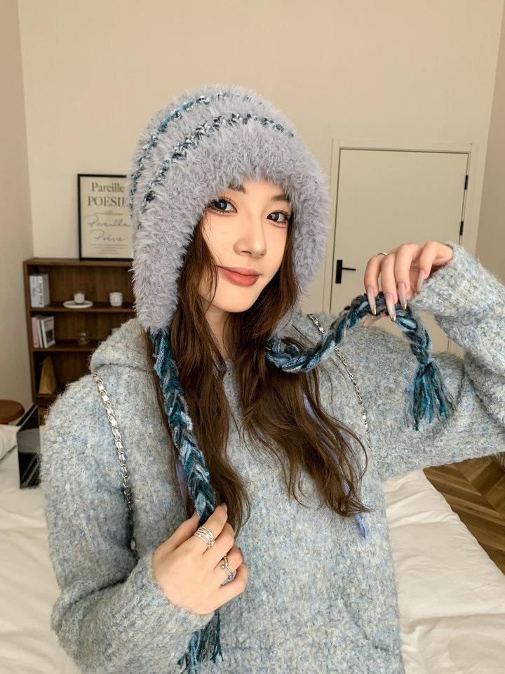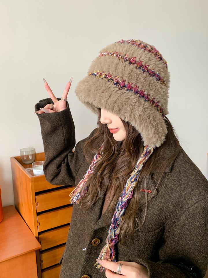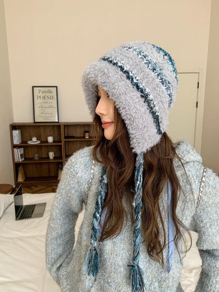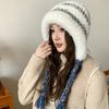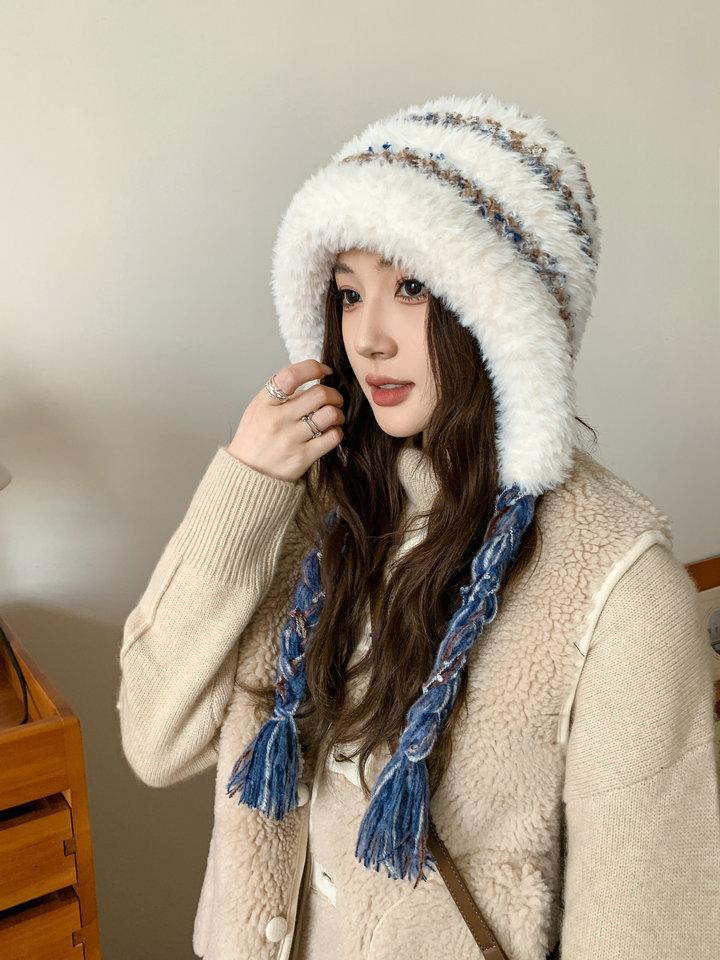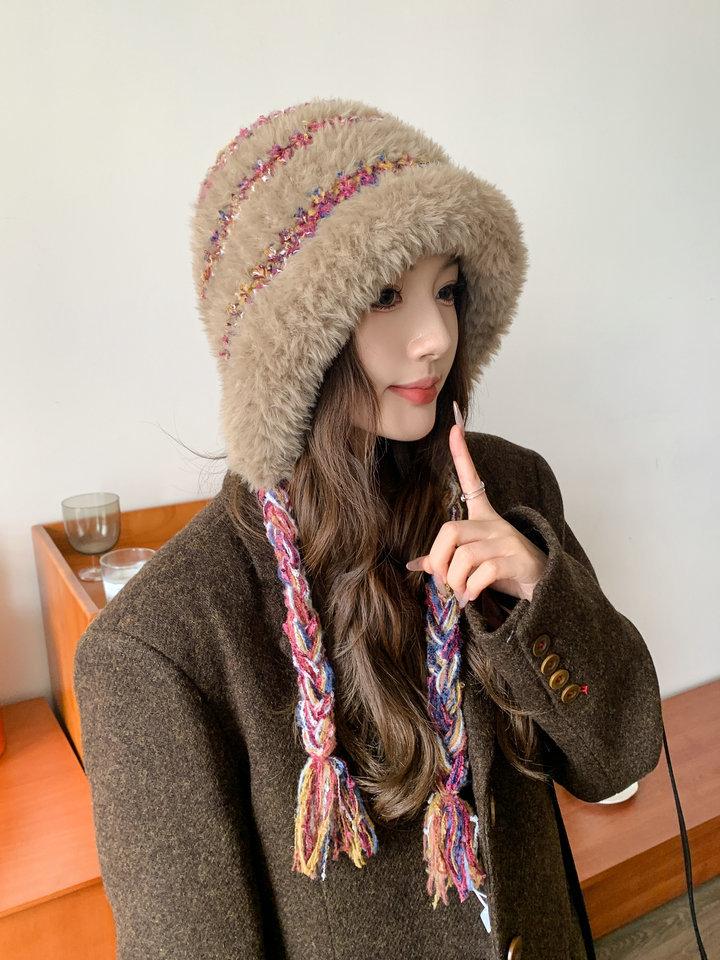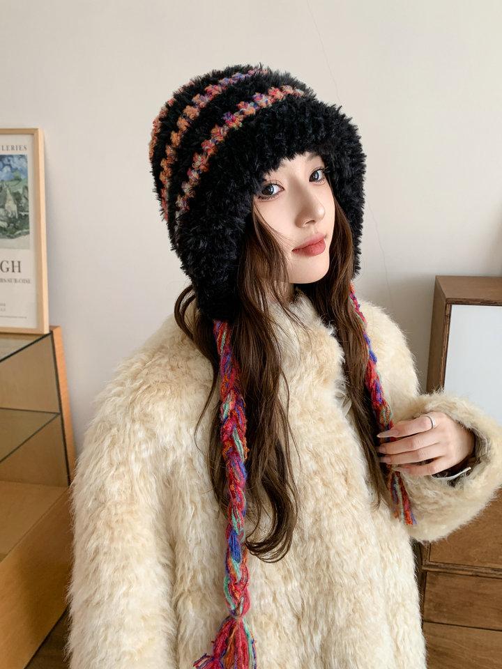 Otoño e Invierno Cálido Colorido Trenzado Protección para las Orejas Sombrero de Felpa para Mujer Viaje al Noreste Versátil Sombrero Lei Feng Borla Bloque de Color Sombrero Frío