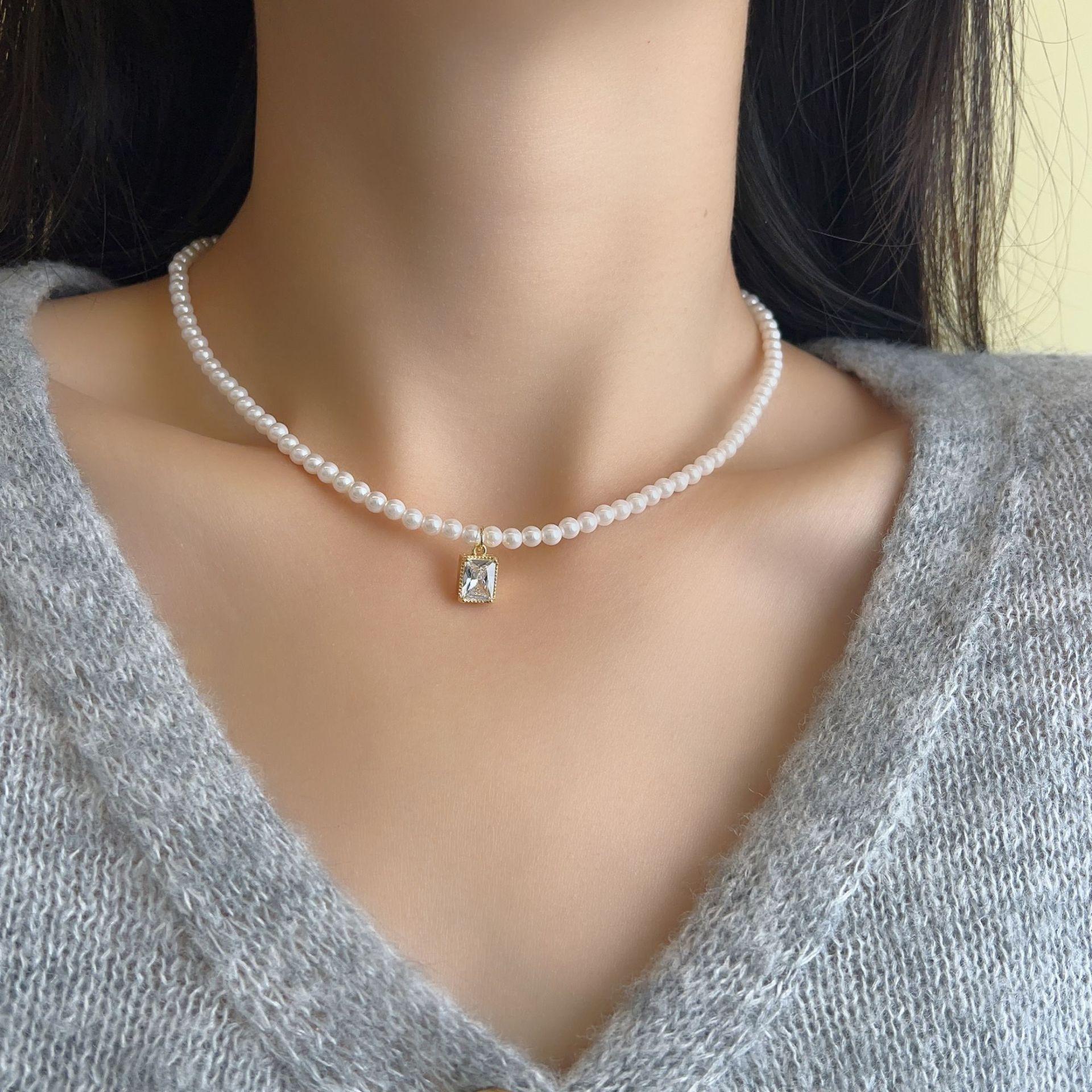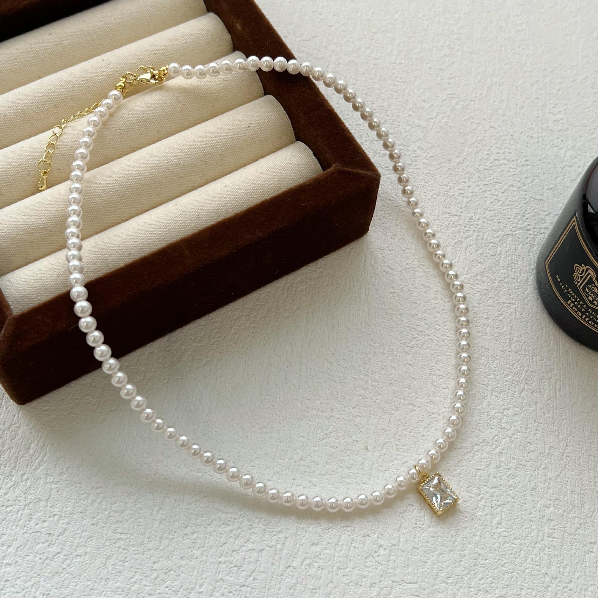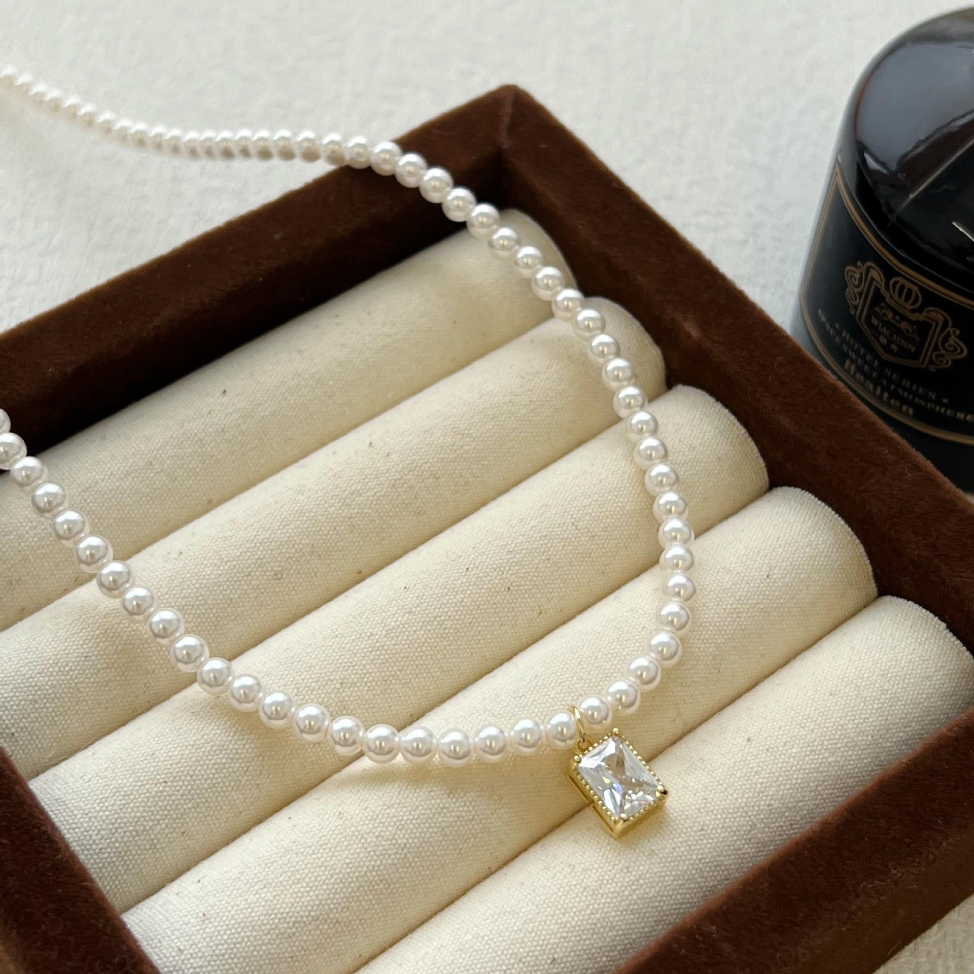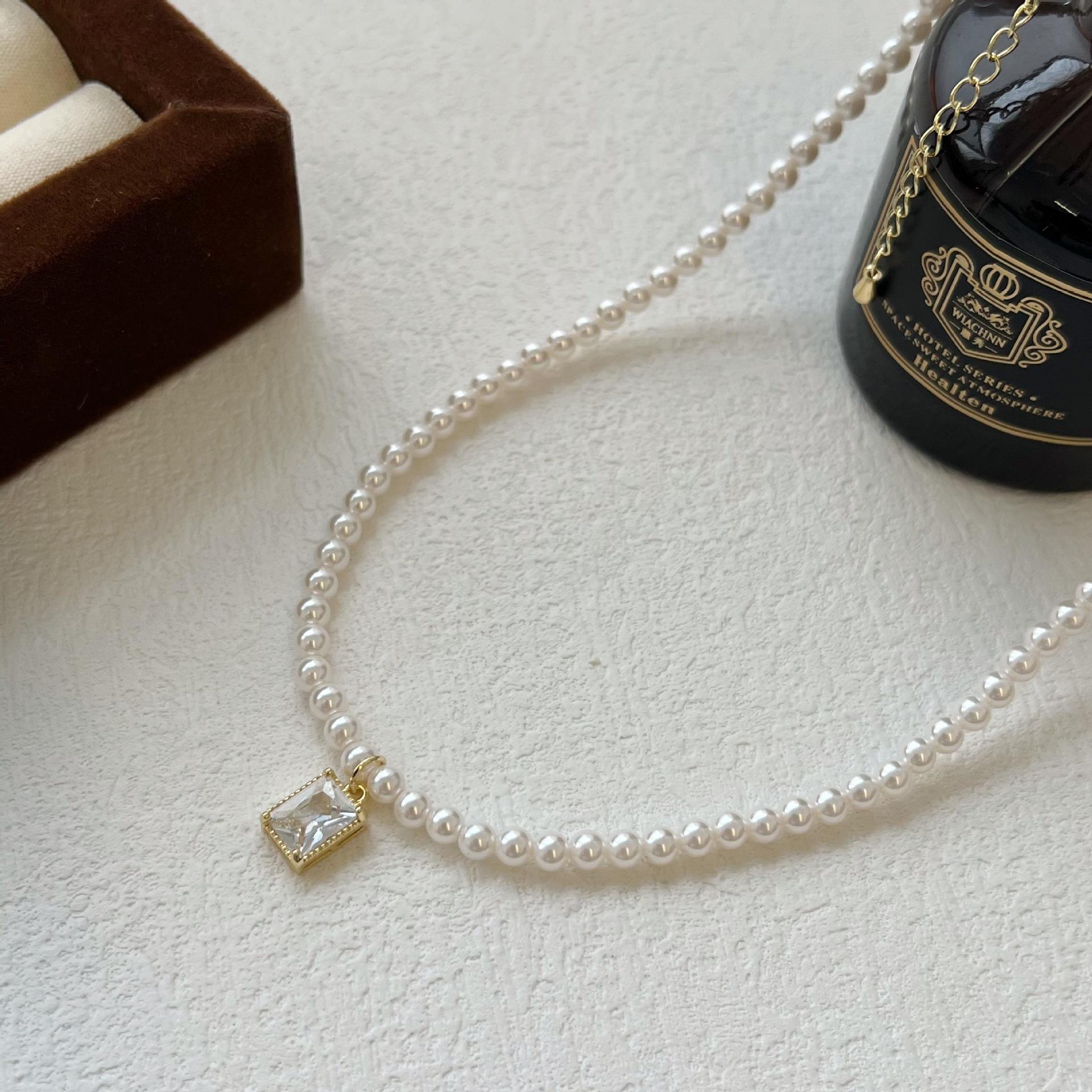 Collar con colgante de circón y perlas Shijia, de nicho, ligero, de lujo, combina con todo, francés, retro, romántico, cuadrado, con diamantes, cadena de clavícula.