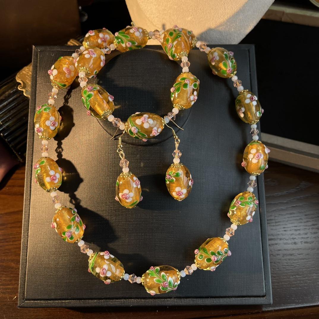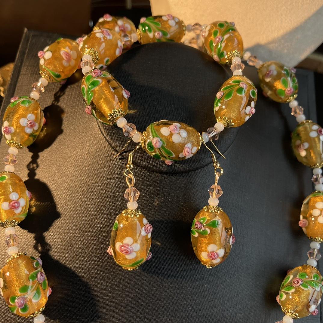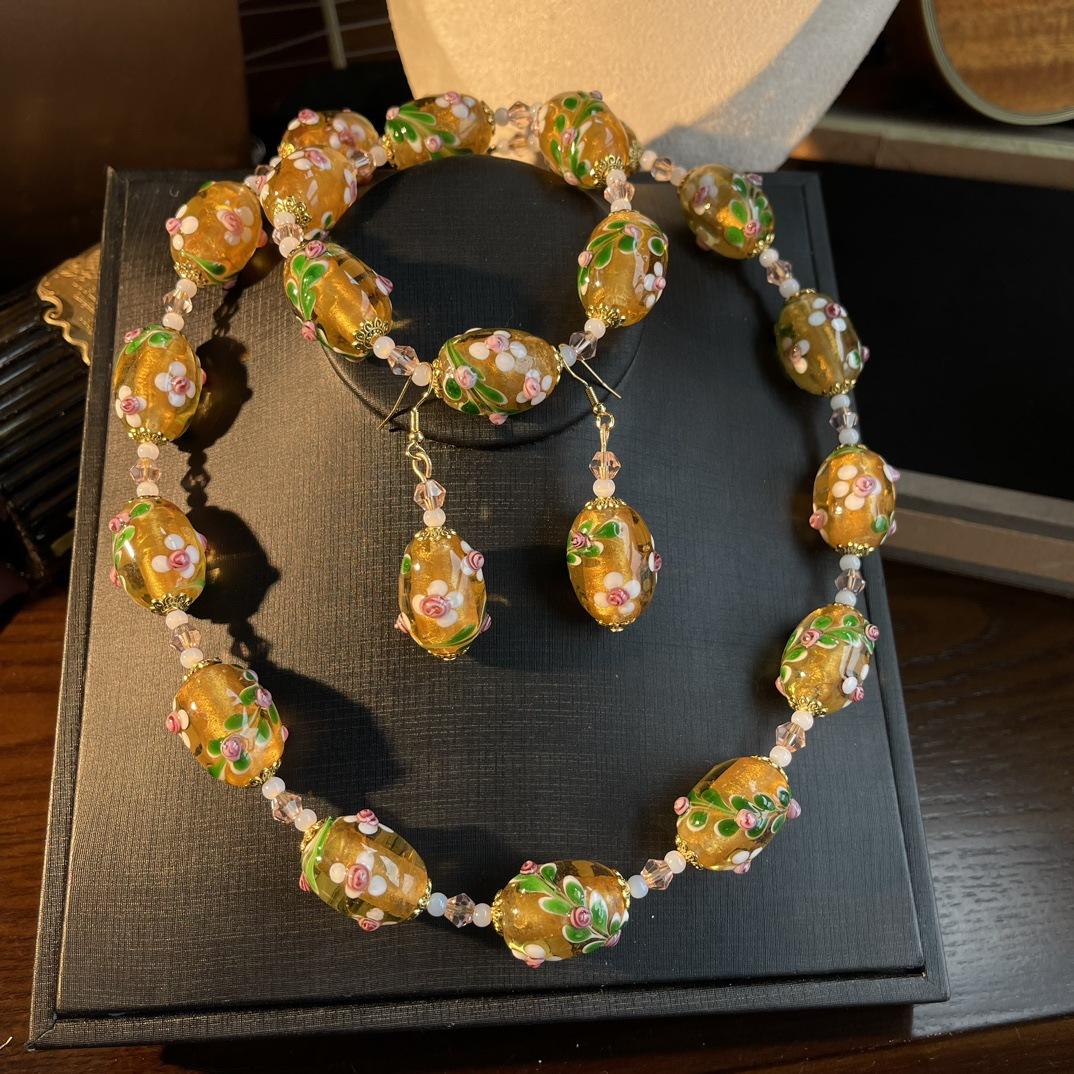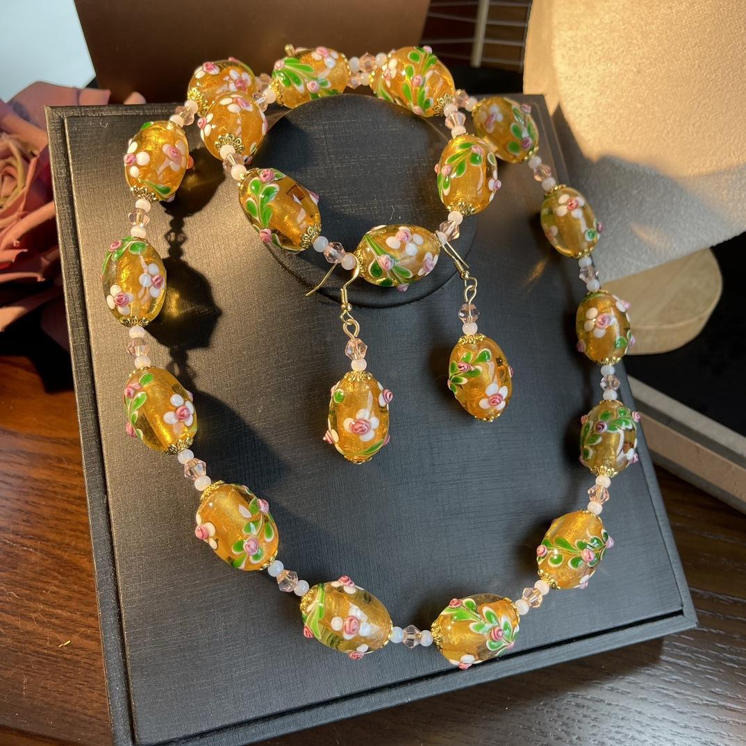 [Honey South] Collar con pulsera y pendientes de flores de Murano con lámina de oro estilo corte vintage