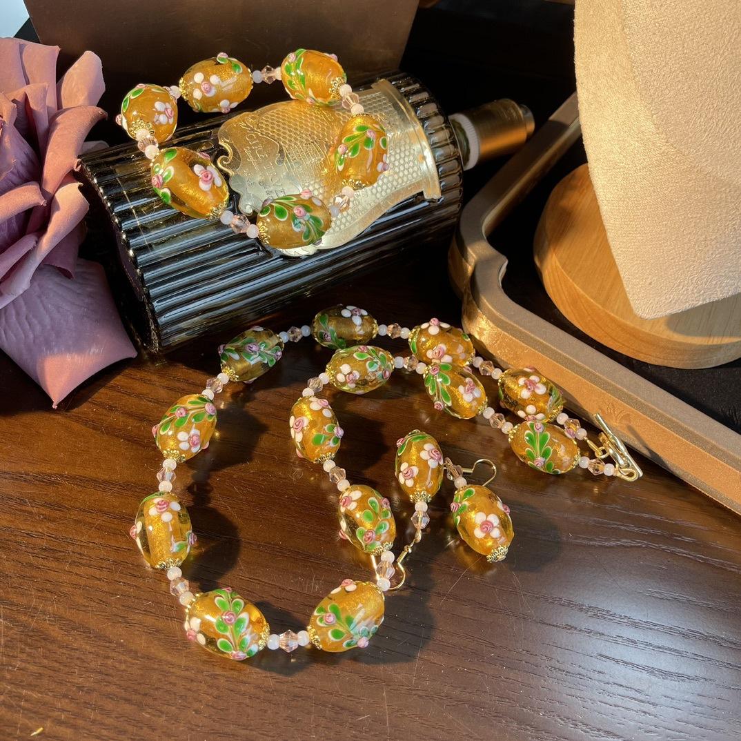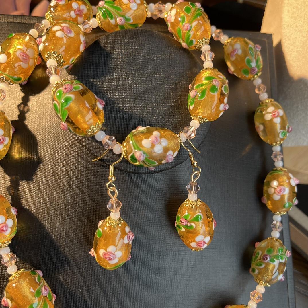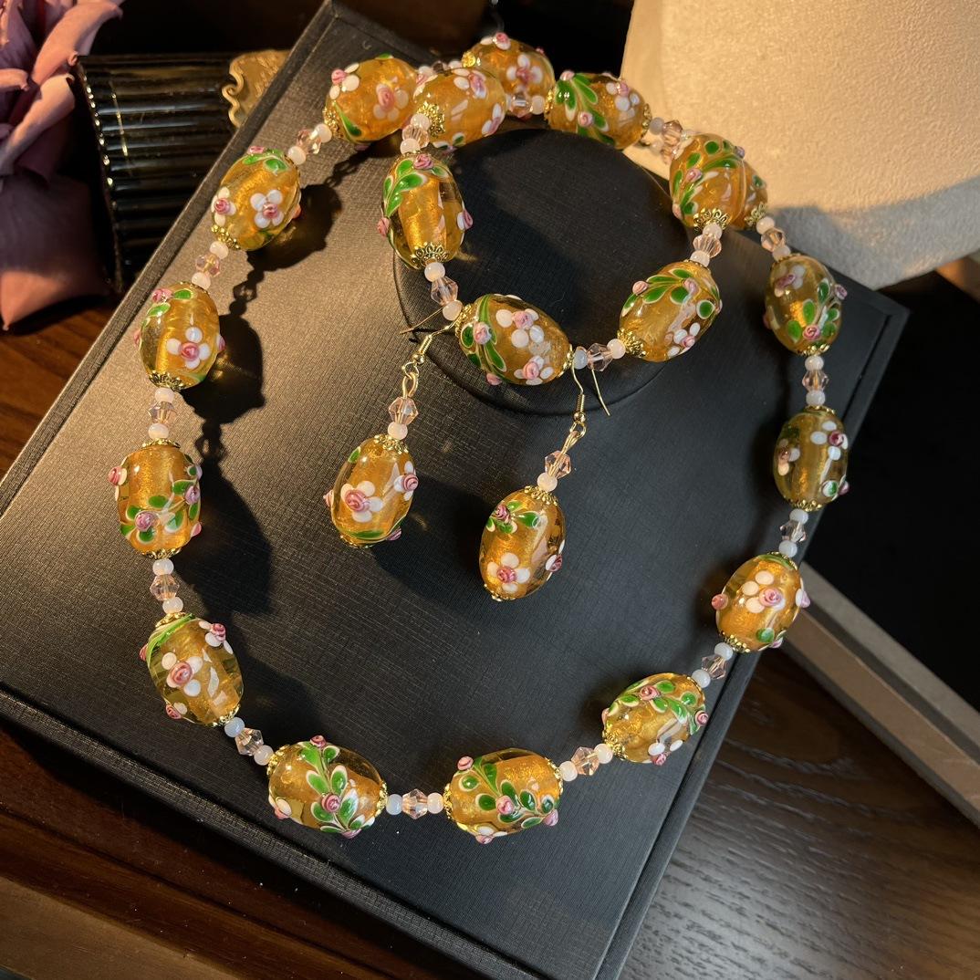 [Honey South] Collar con pulsera y pendientes de flores de Murano con lámina de oro estilo corte vintage