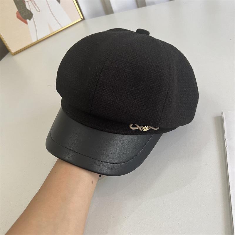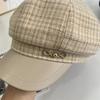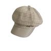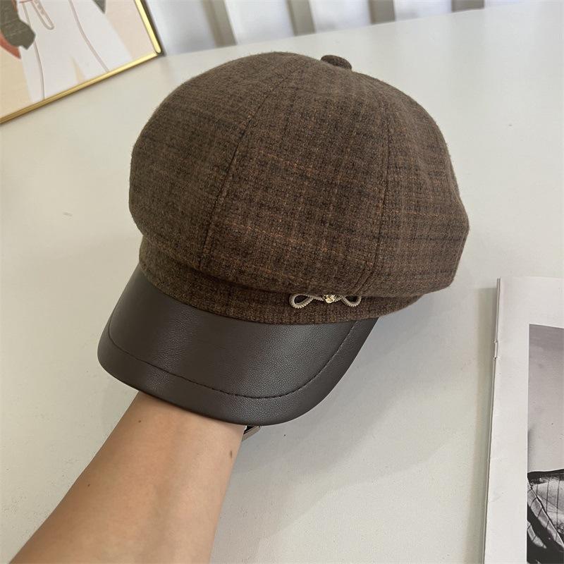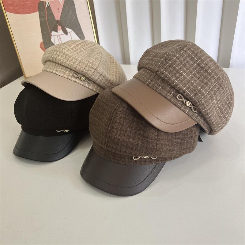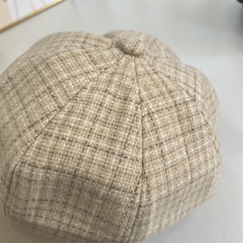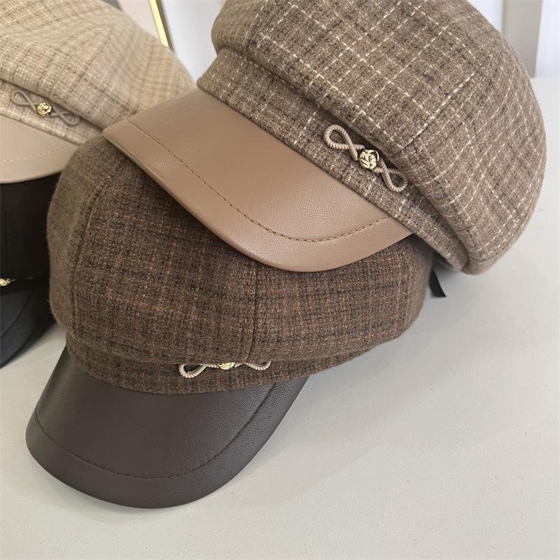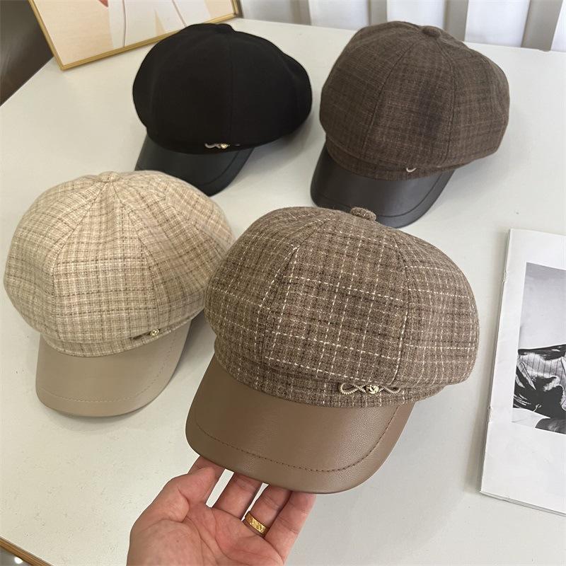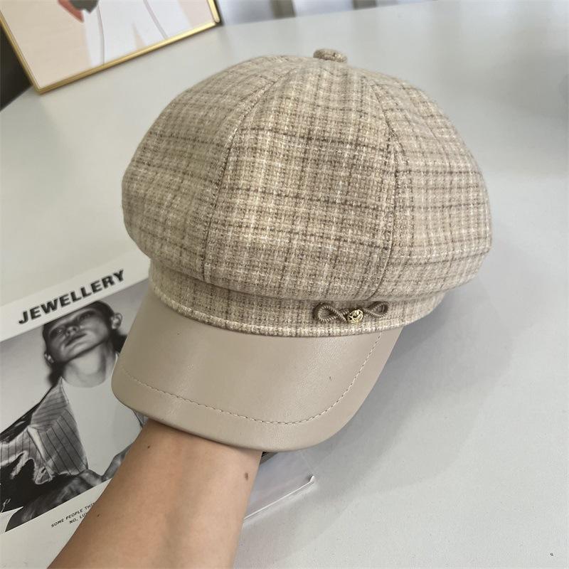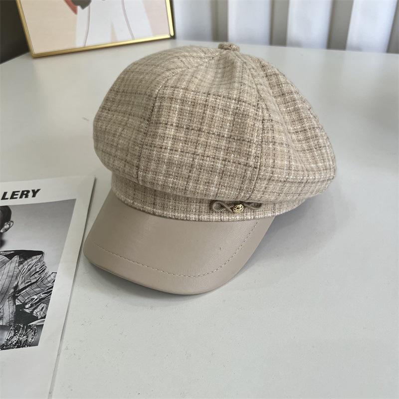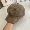 Nuevo gorro octogonal de lana a cuadros finos de otoño para mujer, gorra con visera de cuero, boina pequeña con cara visible, sombrero de pintor