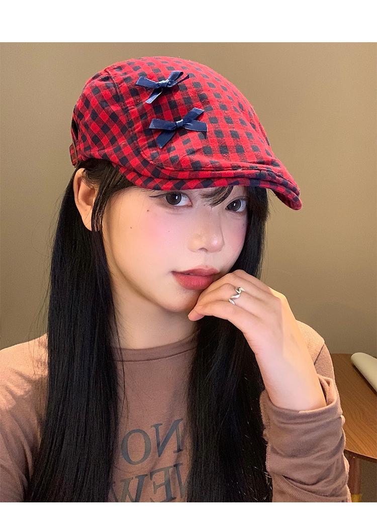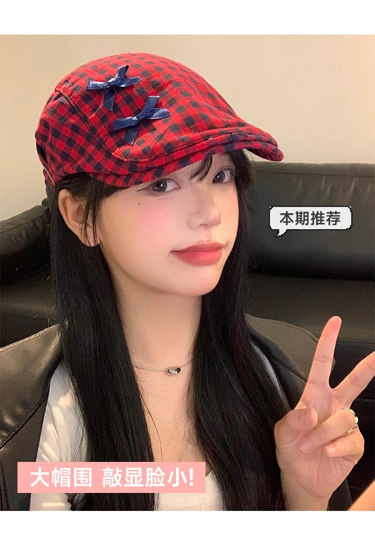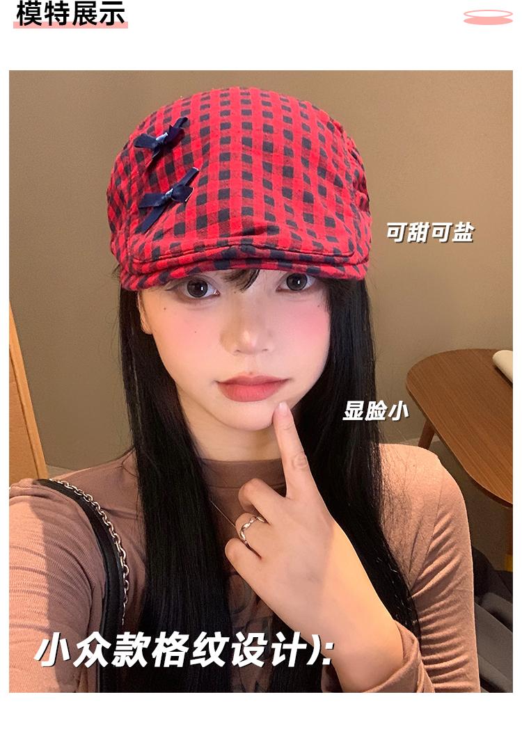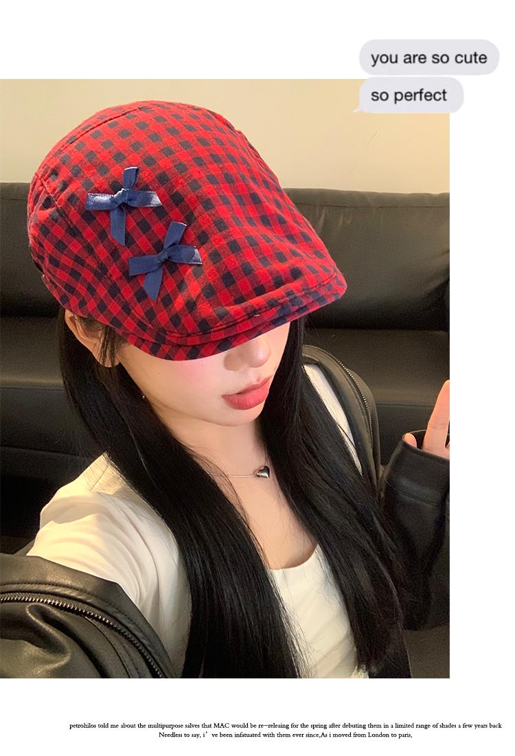 Sombrero de cuadros rojos con lazo hacia adelante para mujer, estilo coreano, boina pequeña que deja ver el rostro, sombrero retro combinable de nicho, moderno