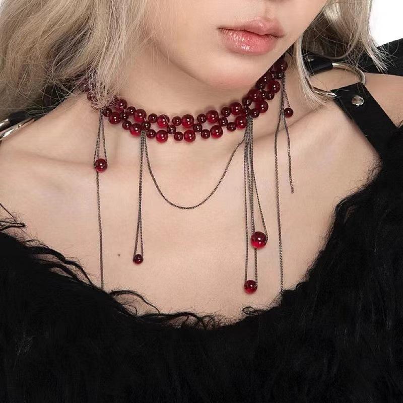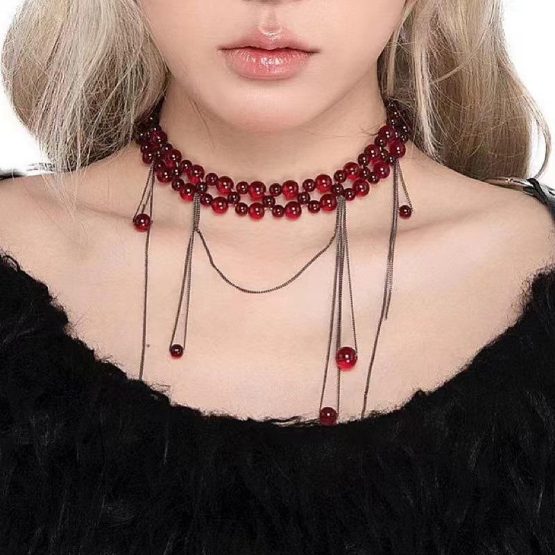 Elegante collar de nicho de lujo ligero y elegante con cadena de clavícula de doble capa con borlas de cuentas rojas de alta calidad