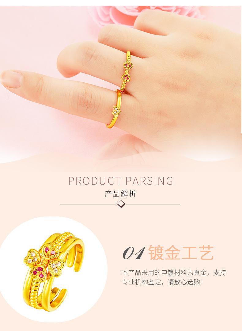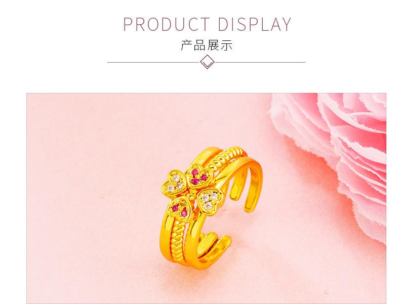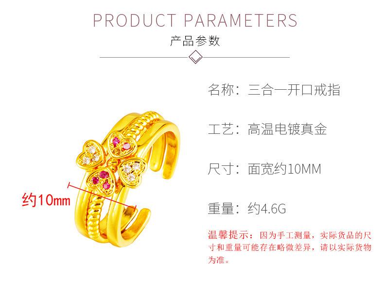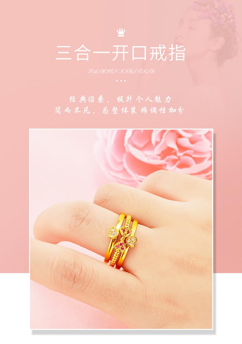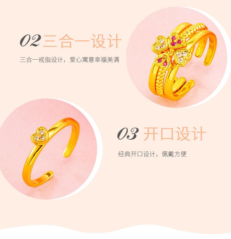Anillo abierto de combinación tres en uno de amor de oro de imitación de 18 quilates para mujer con incrustaciones de diamante de imitación, joyería de oro arena al por mayor de fábrica