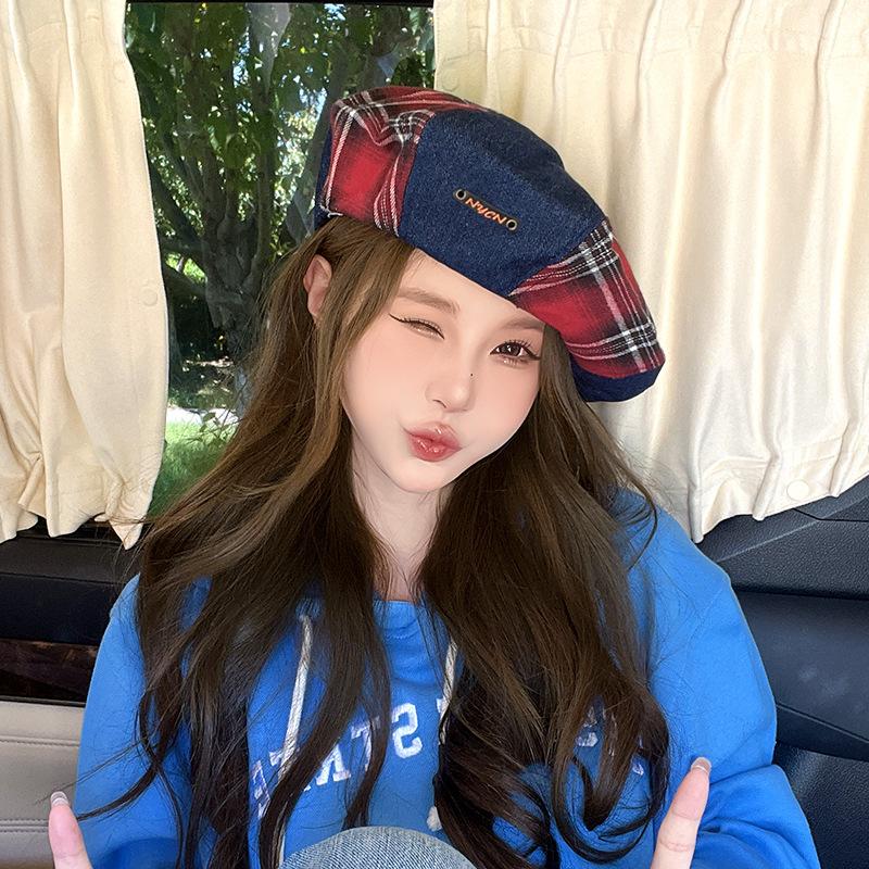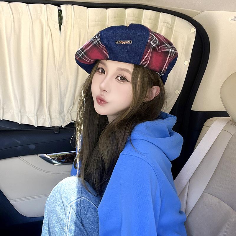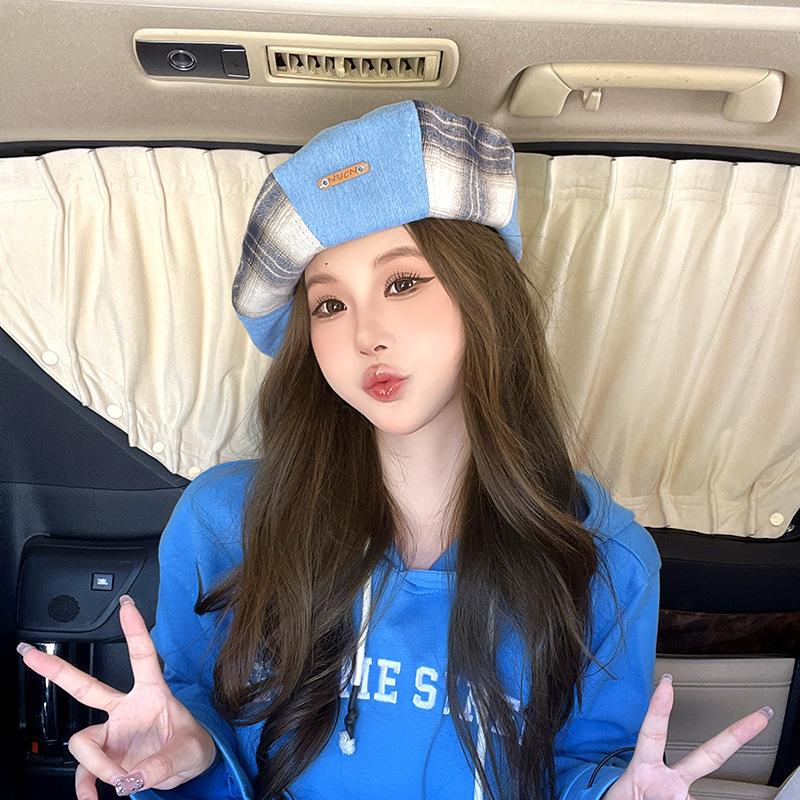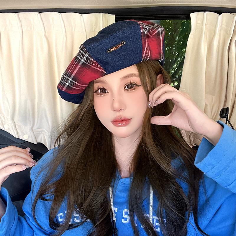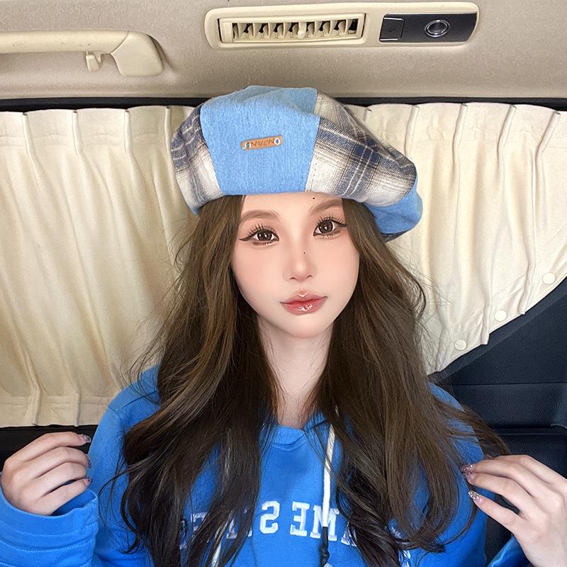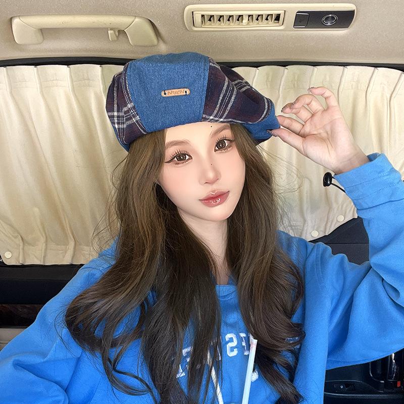 Boina vintage a cuadros a juego para mujer, de verano, de cuero, con etiqueta y letras, estilo pintor, para exhibir, pequeña, octogonal.