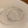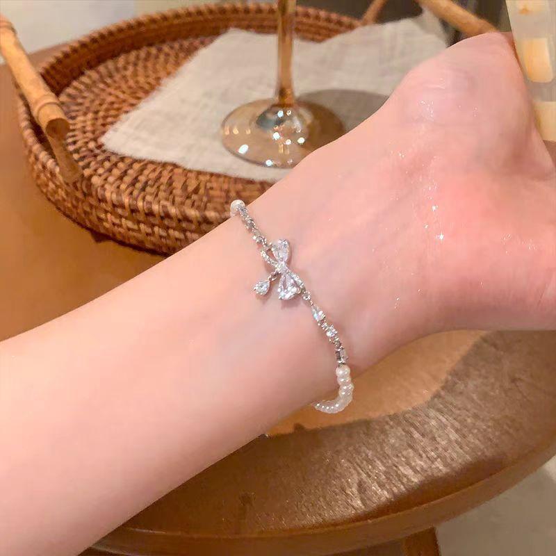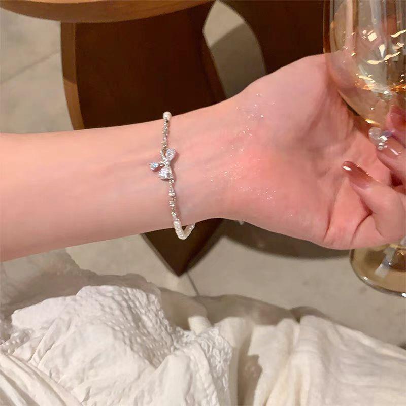 Pulsera de Perlas con Lazo de Circonita Brillante para Niña, Lujo Ligero Elegante Nicho Delicado Personalidad de Alta Gama Dulce