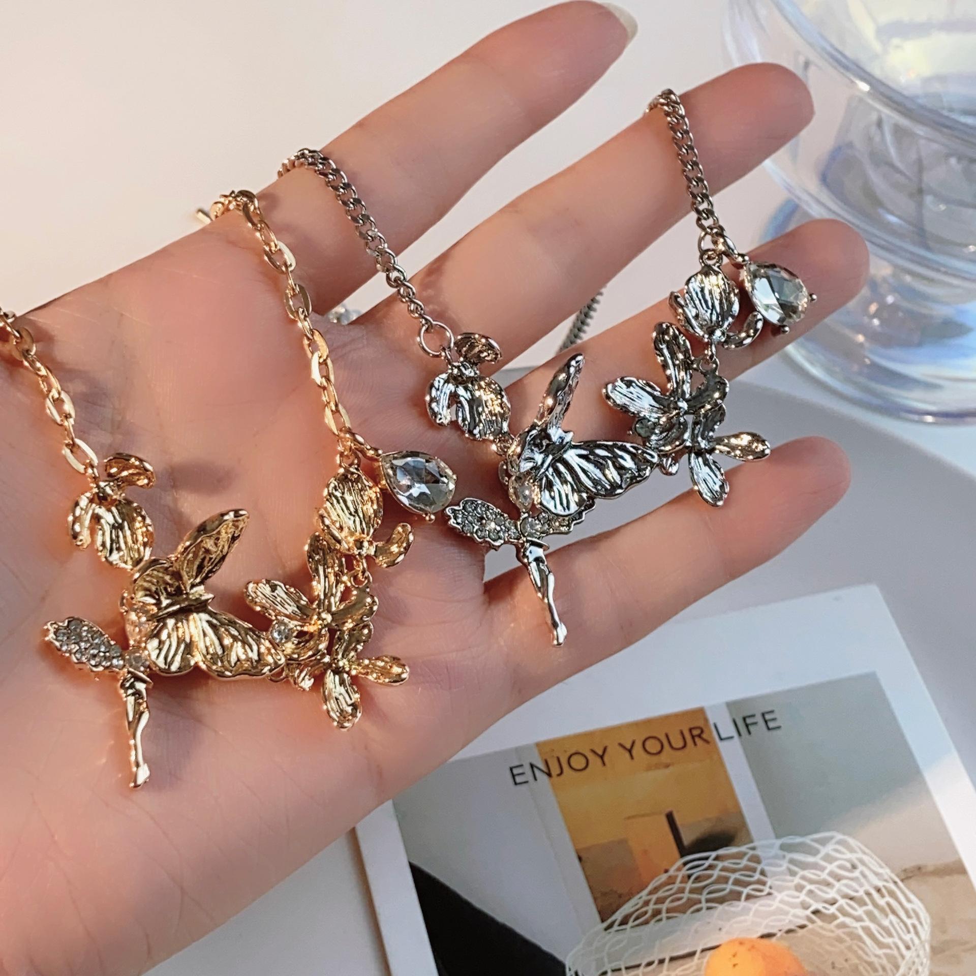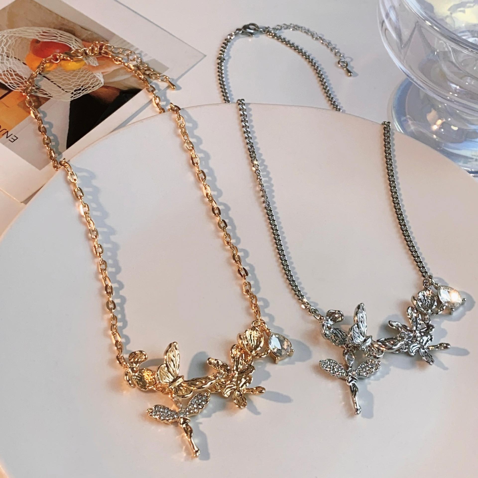 silver romantic flower zircon butterfly necklace, Golden Romantic Flower Zircon Butterfly Necklace