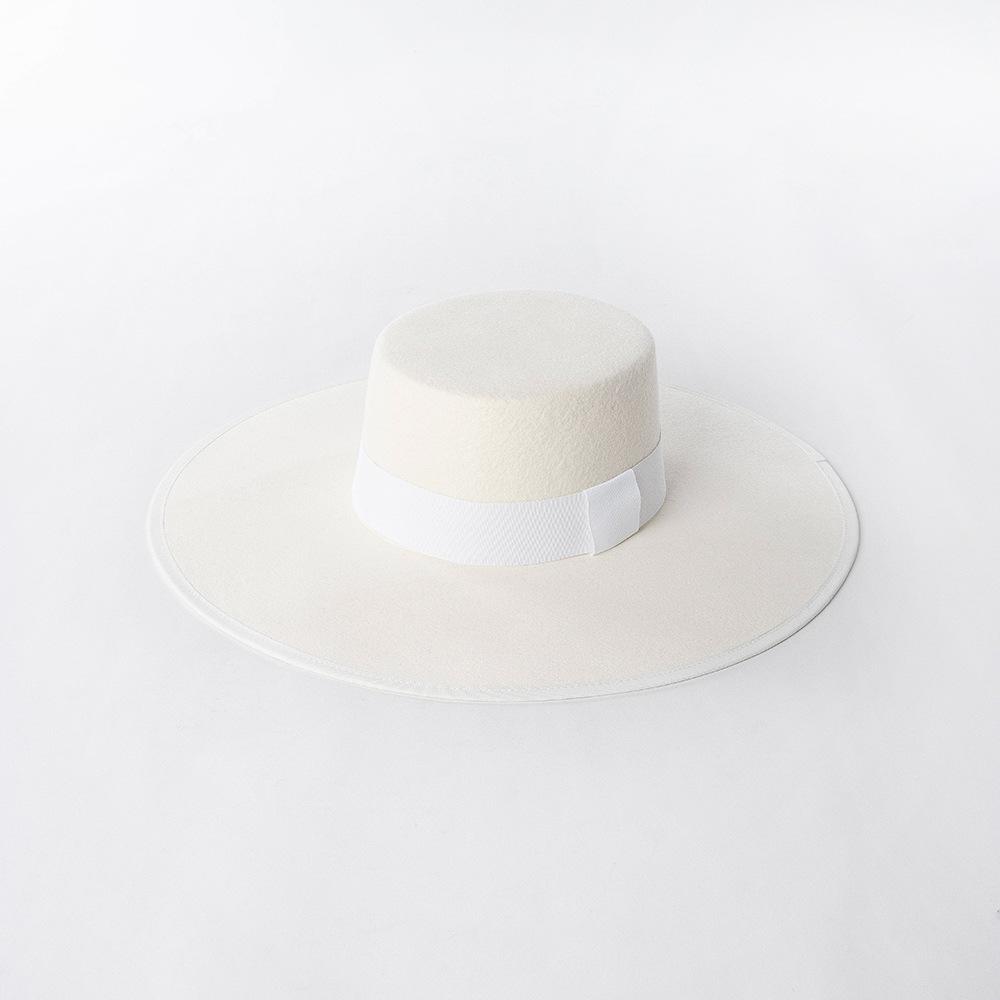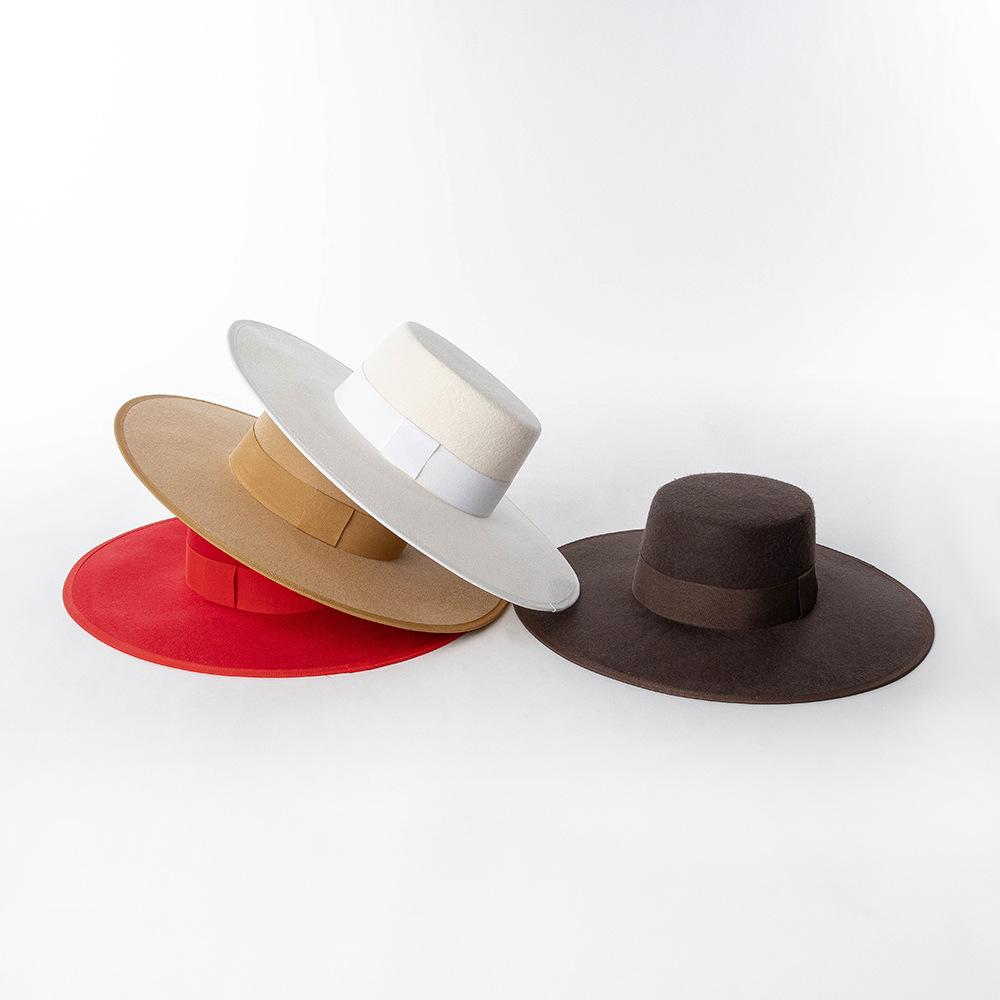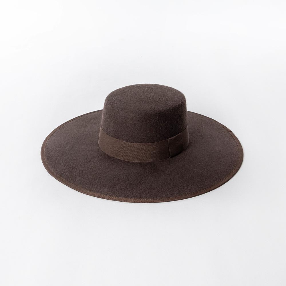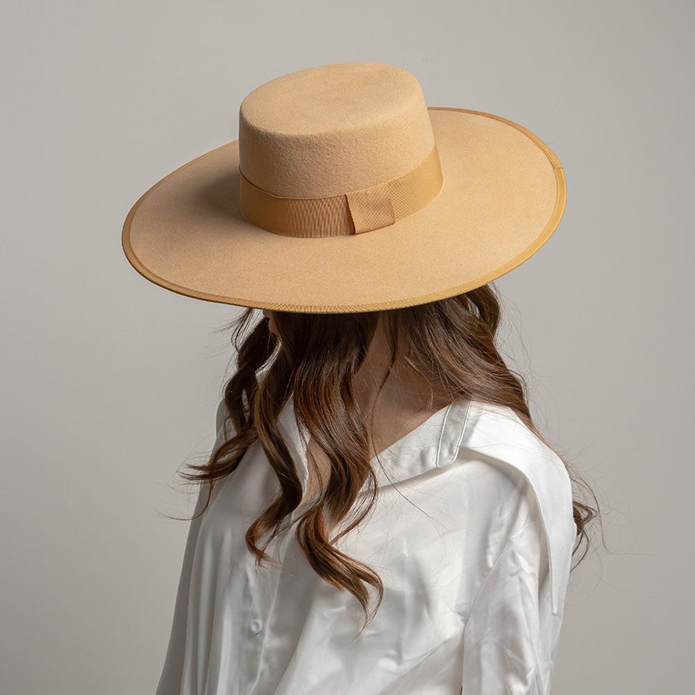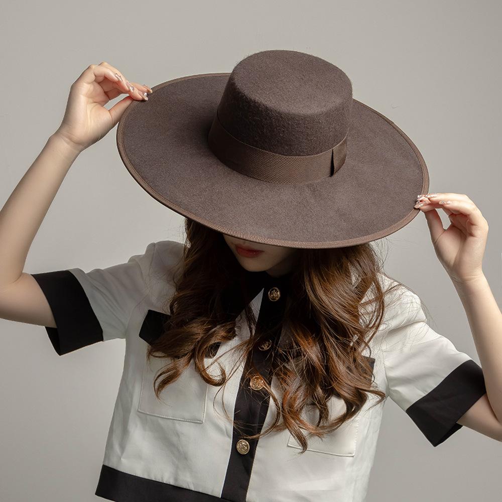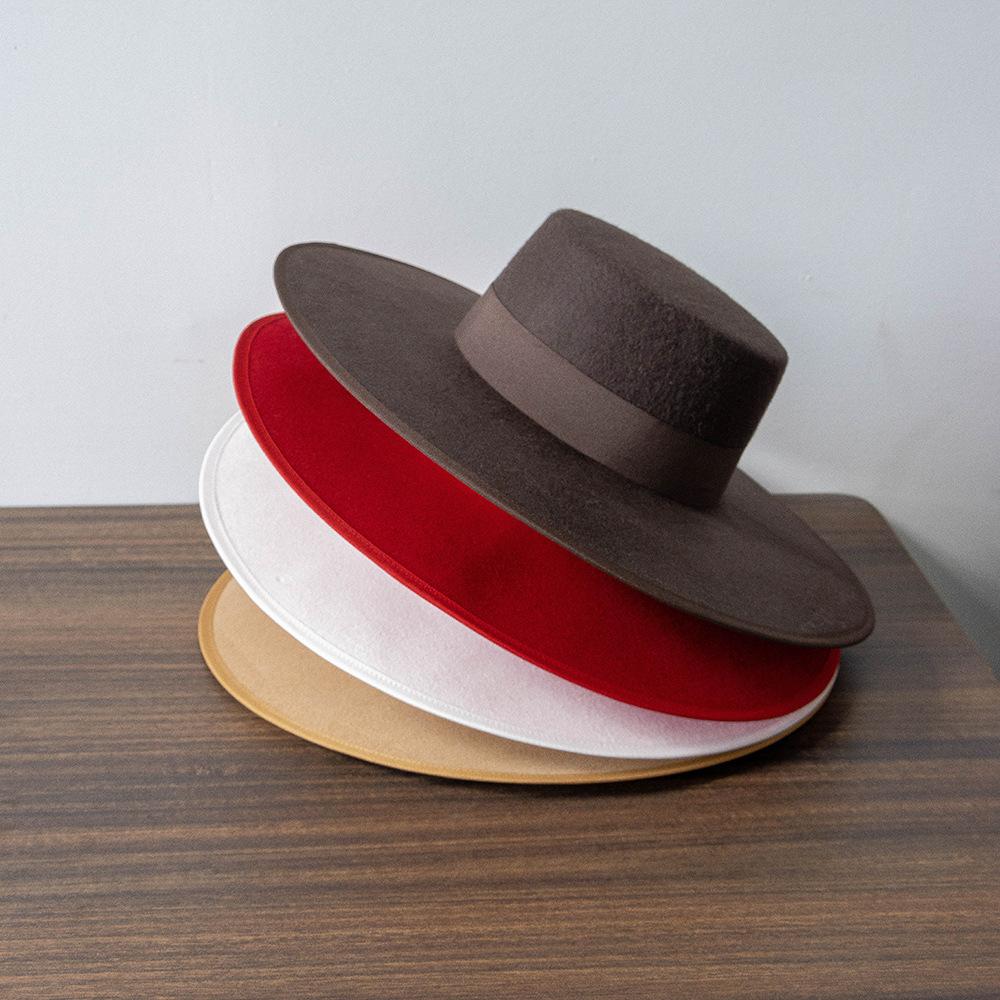 Otoño e Invierno Nuevo Sombrero de Lana de Ala Ancha para Adulto con Cinta de Borde y Copa Plana Elegante y a la Moda Estilo Sombrero de Copa de Fieltro de Lana