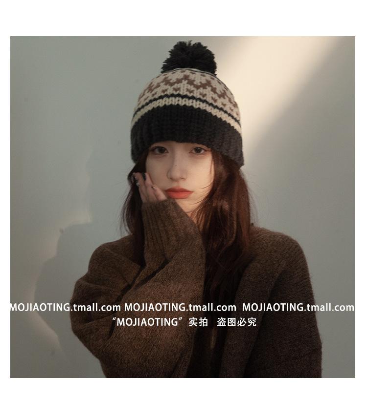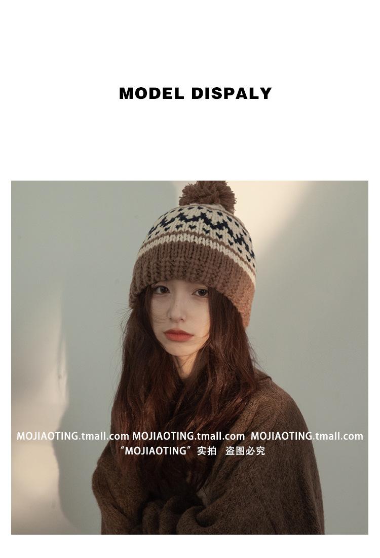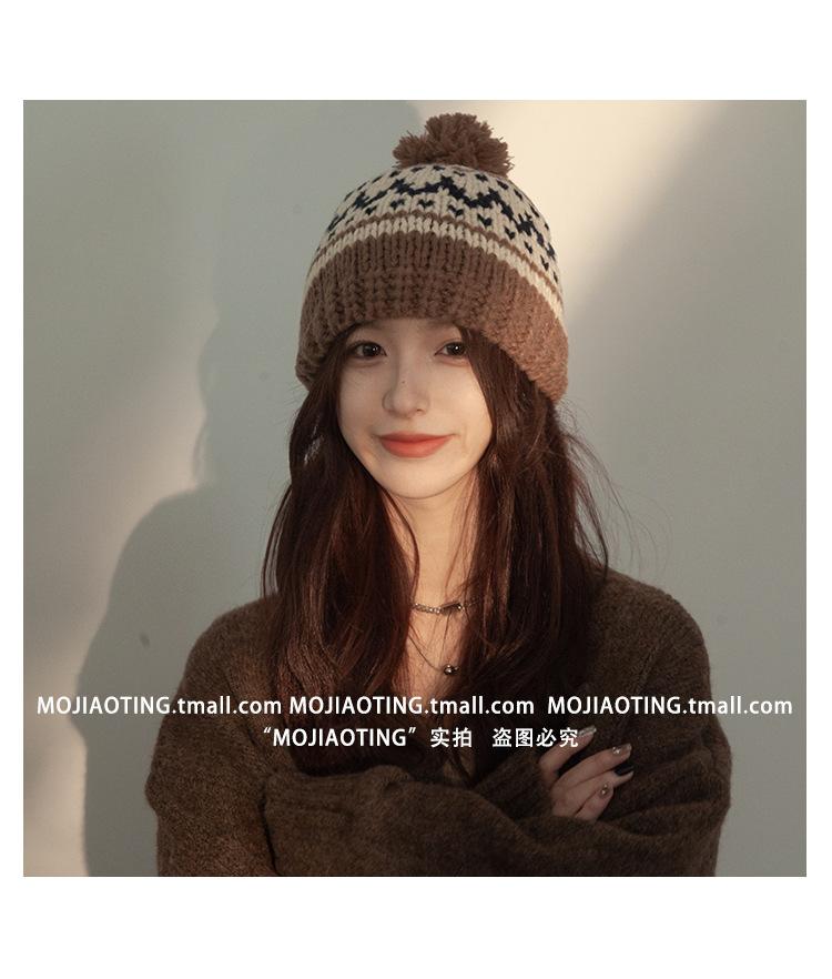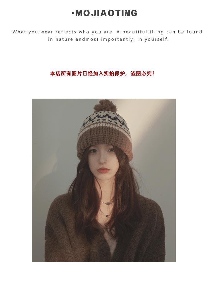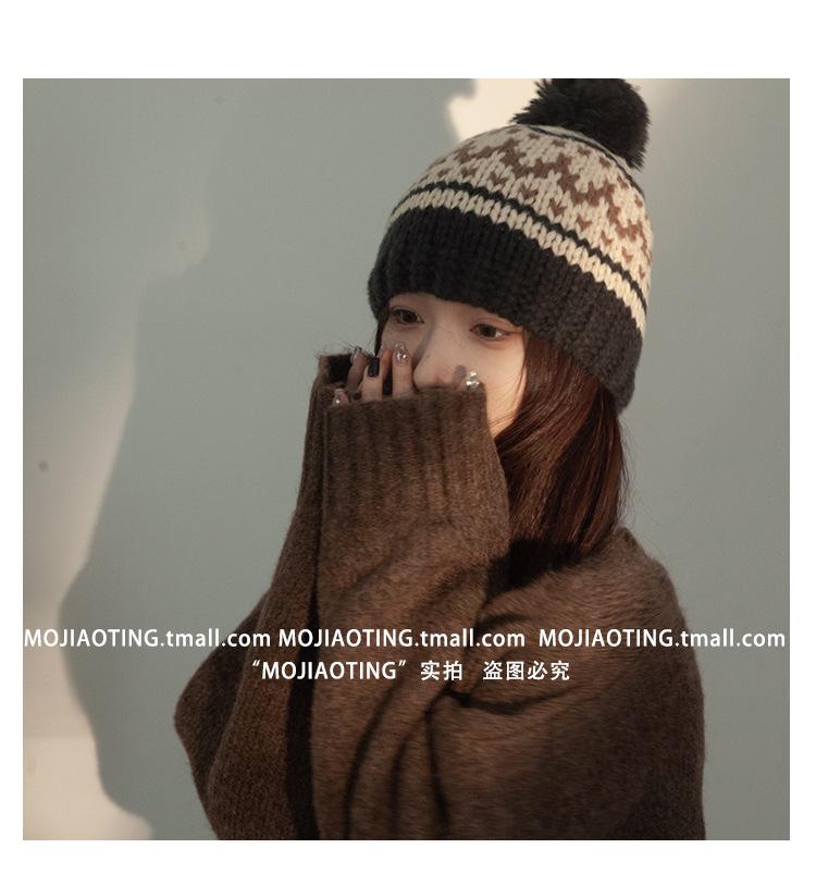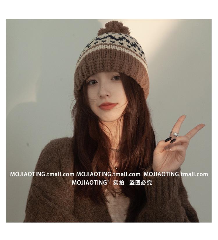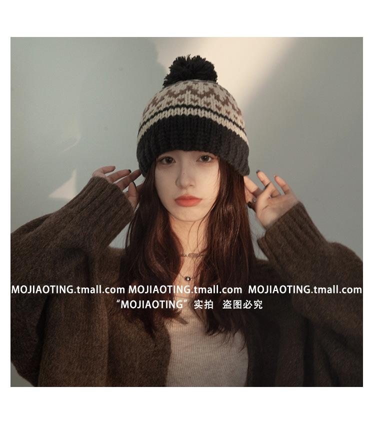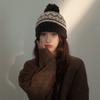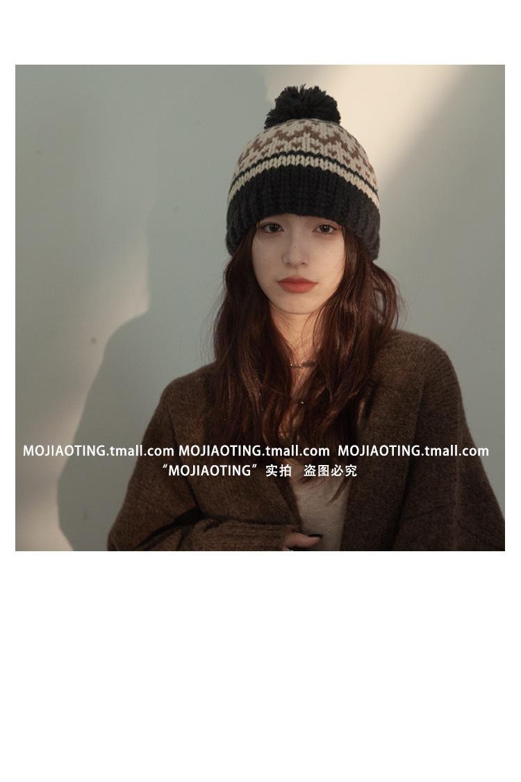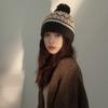 Nuevo gorro de punto con bola de pelo en contraste de color jacquard para mujer, gorro grande con protección para las orejas para el rostro, gorro pequeño y cálido de lana para otoño e invierno.