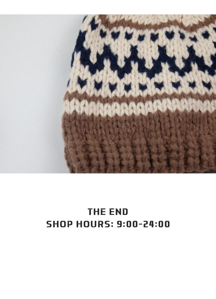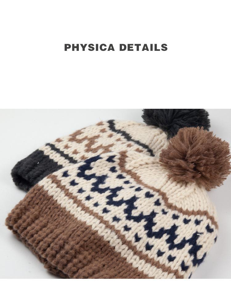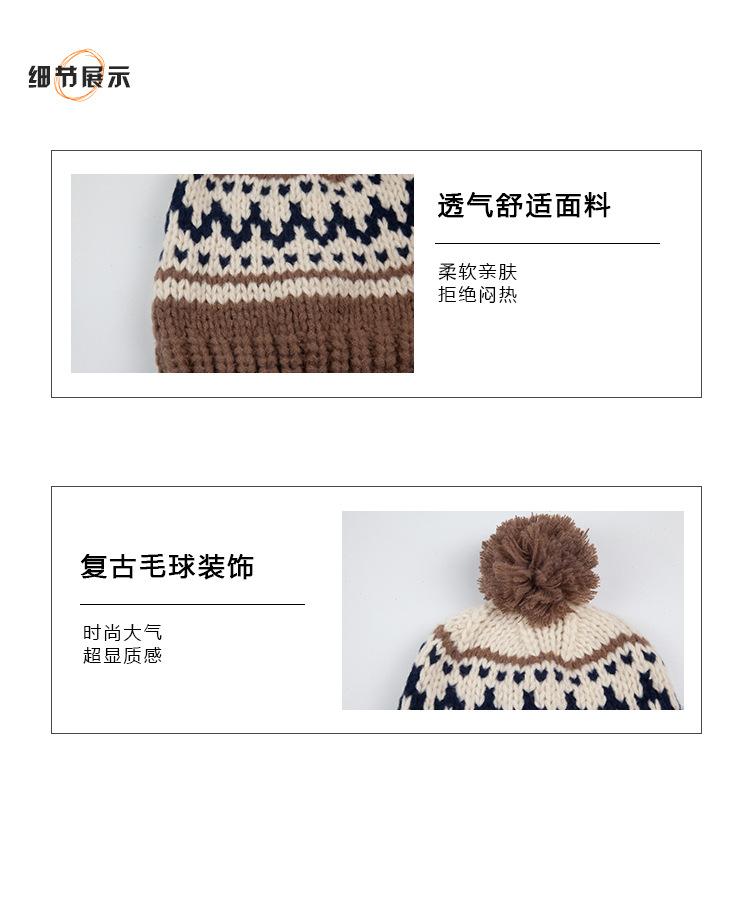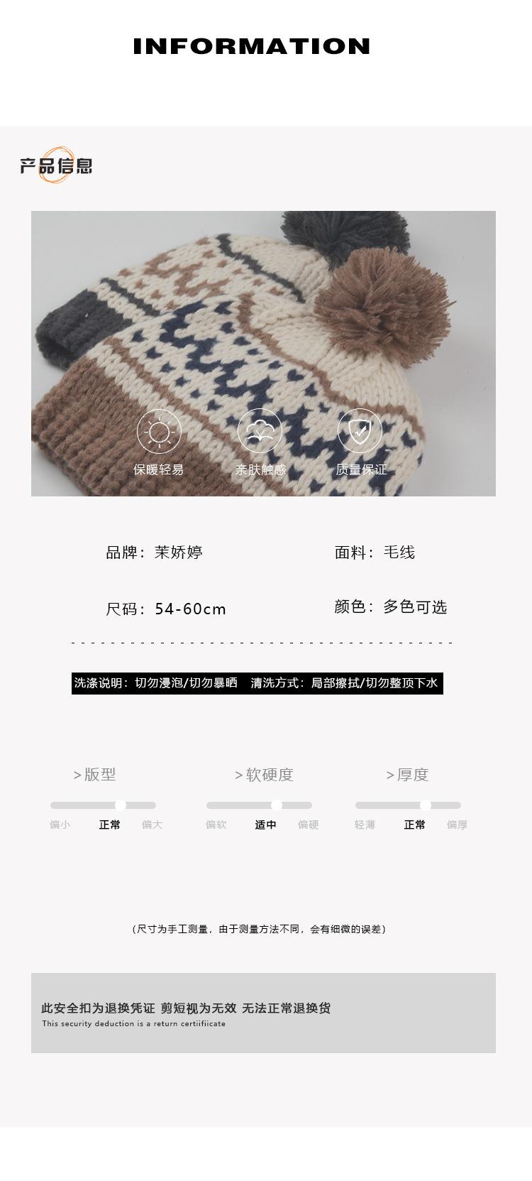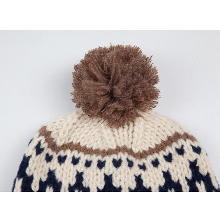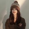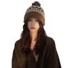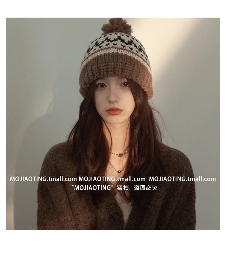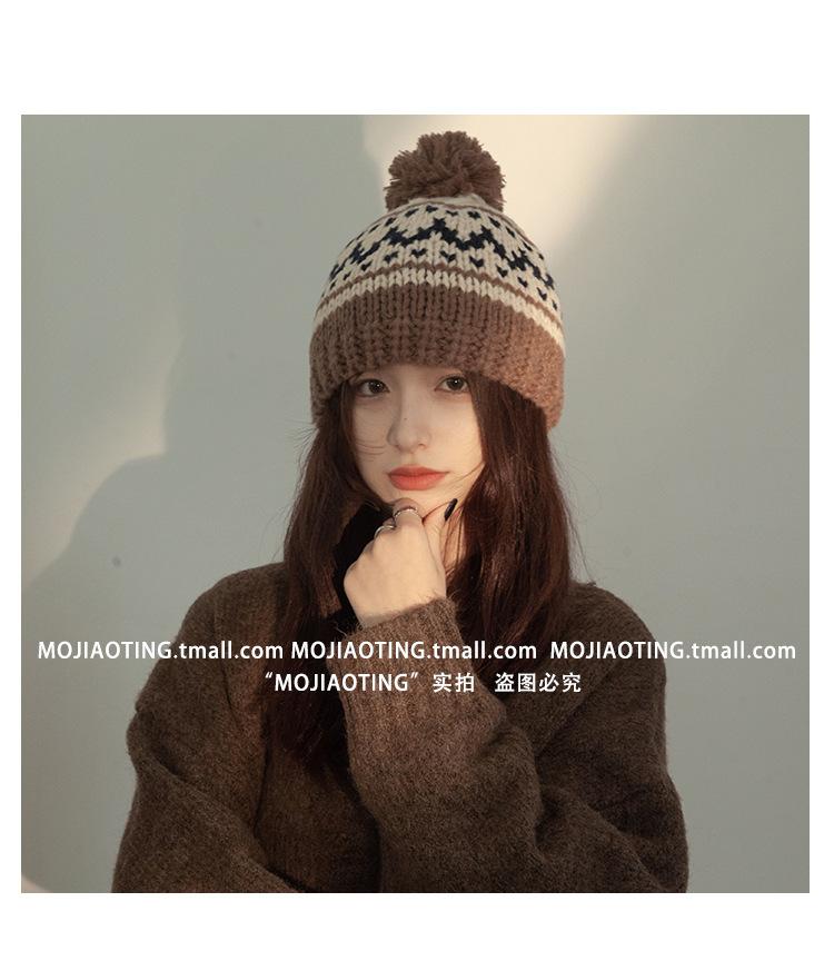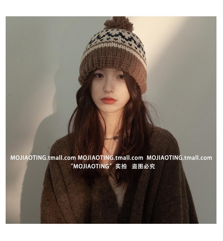 Nuevo gorro de punto con bola de pelo en contraste de color jacquard para mujer, gorro grande con protección para las orejas para el rostro, gorro pequeño y cálido de lana para otoño e invierno.