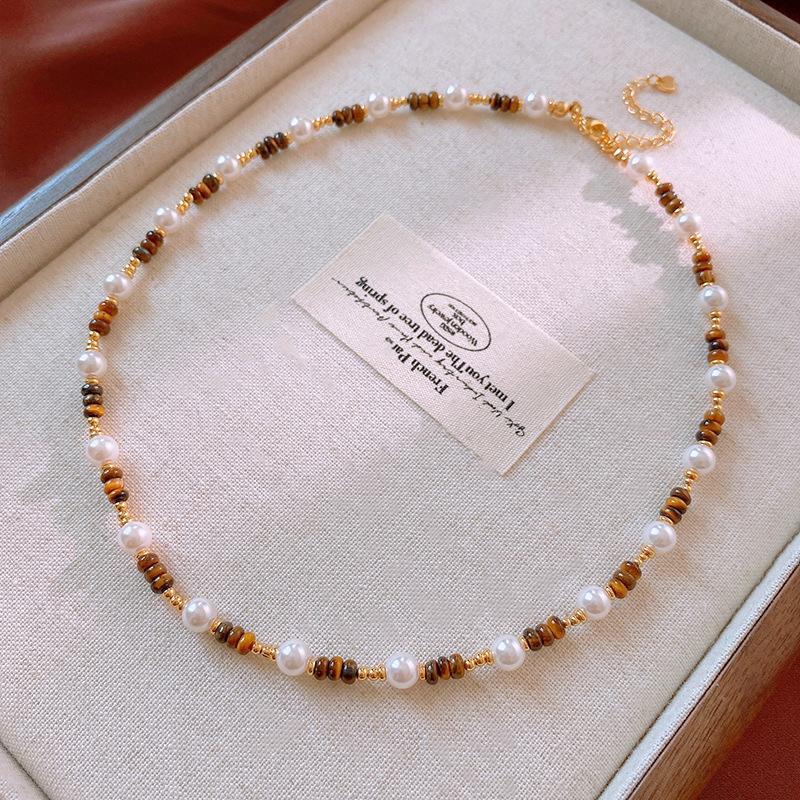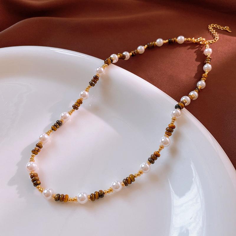 Collar de perlas con cuentas de piedra de ojo de tigre, nuevo diseño retro de cadena de clavícula de alta calidad, joyería de diseño Joker de nicho al por mayor