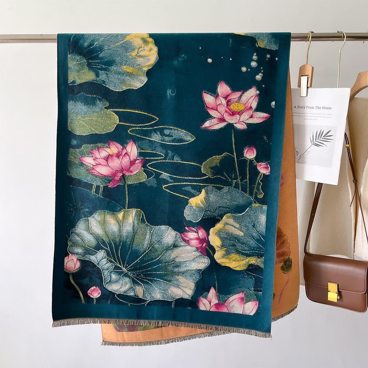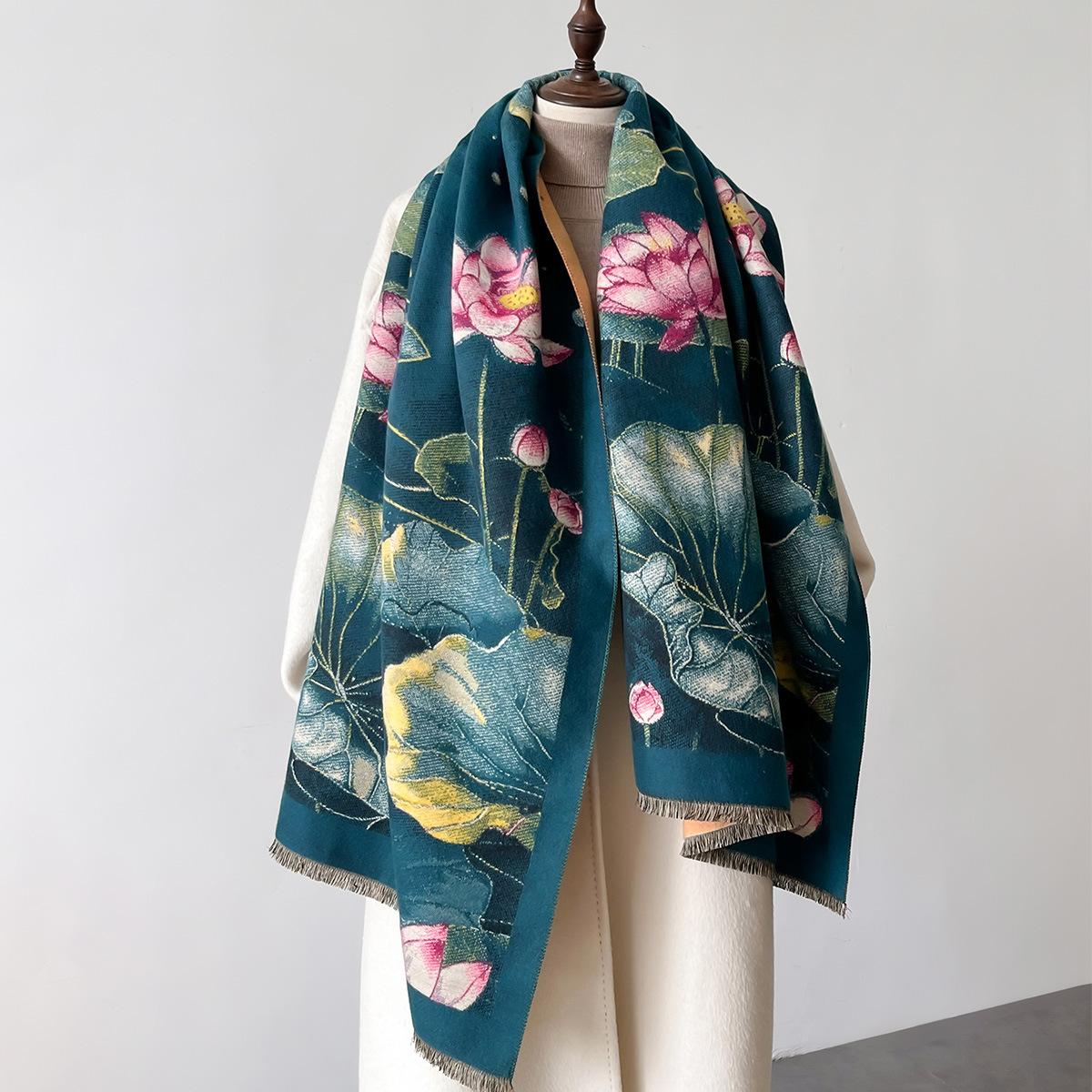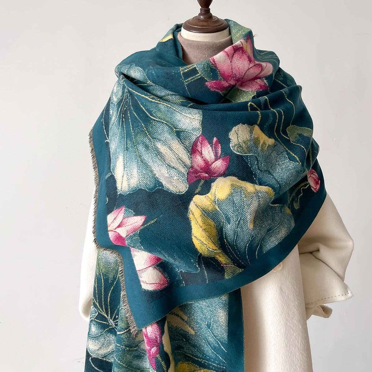 Bufanda Estampado de Loto Elegante de Alta Gama Moda Otoño e Invierno Bufanda Cálida de Doble Uso Cachemira Engrosada Chal de Mujer