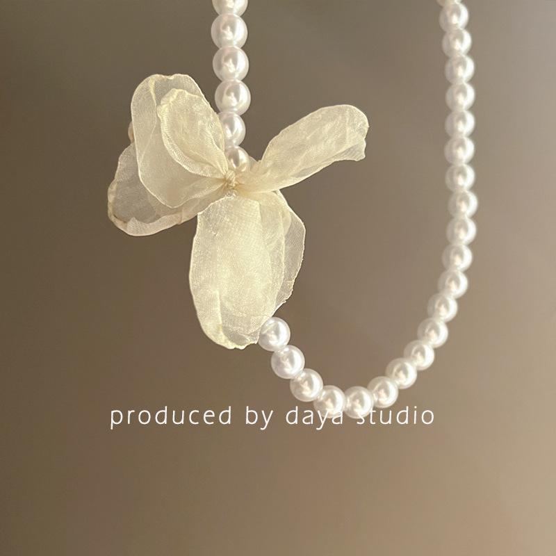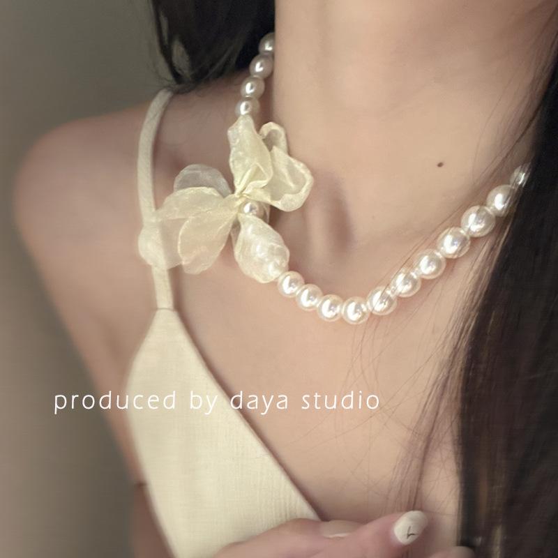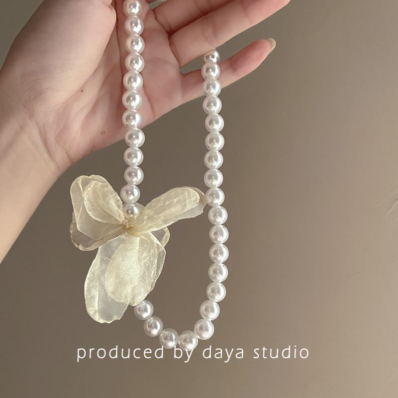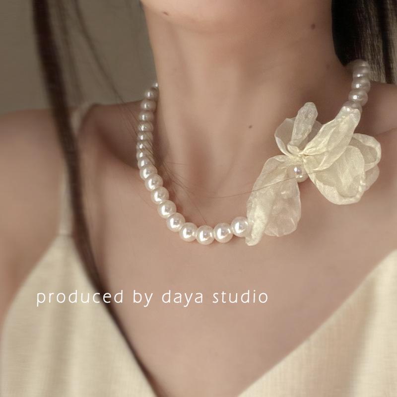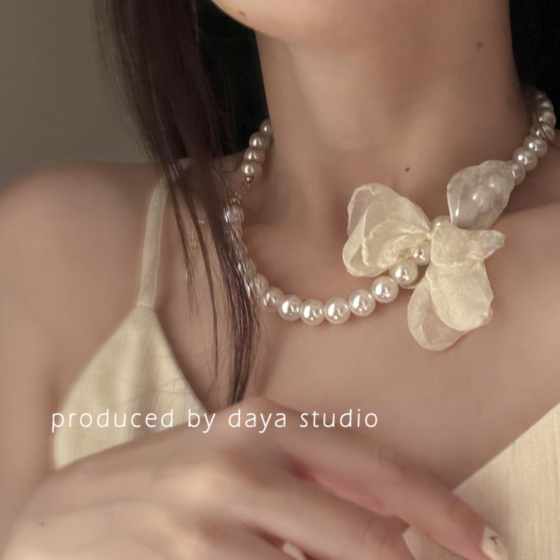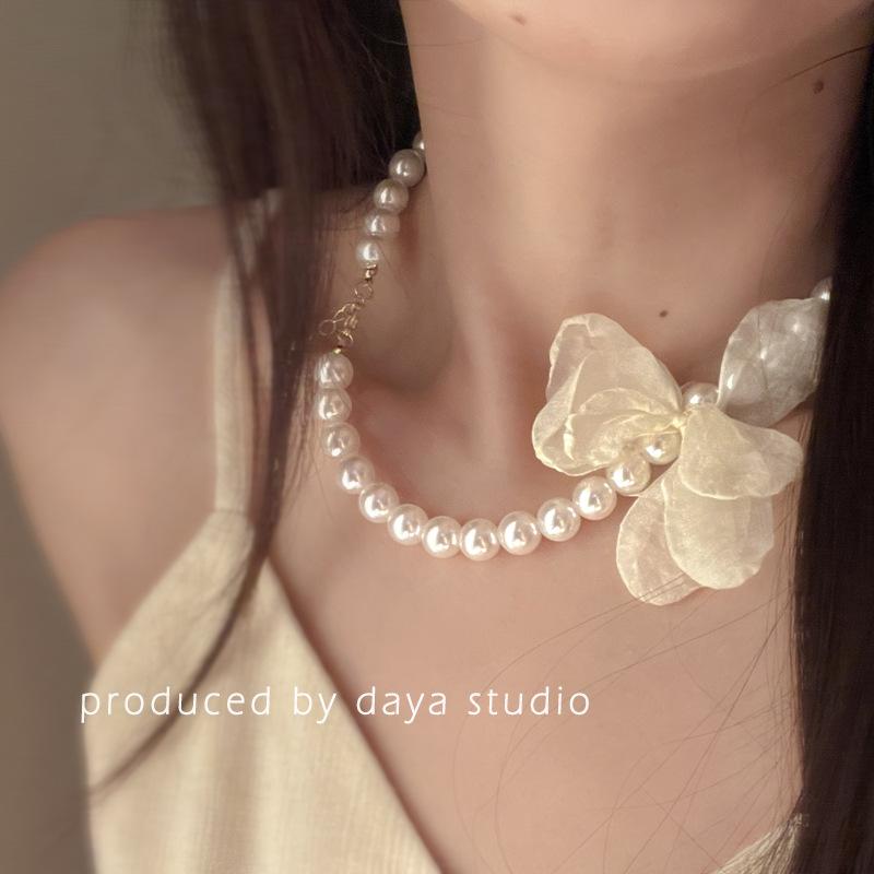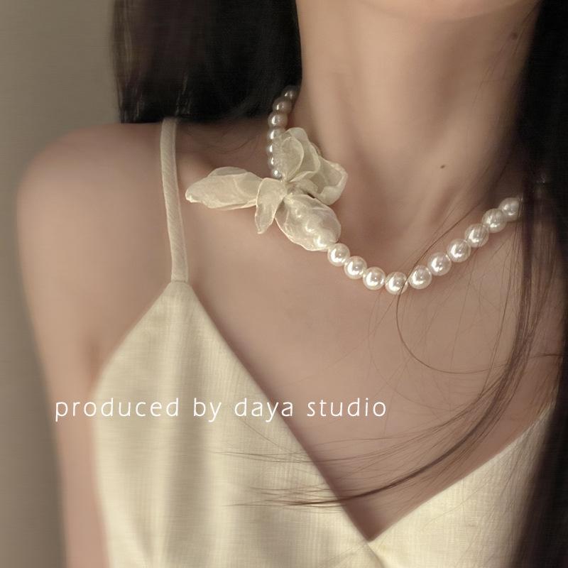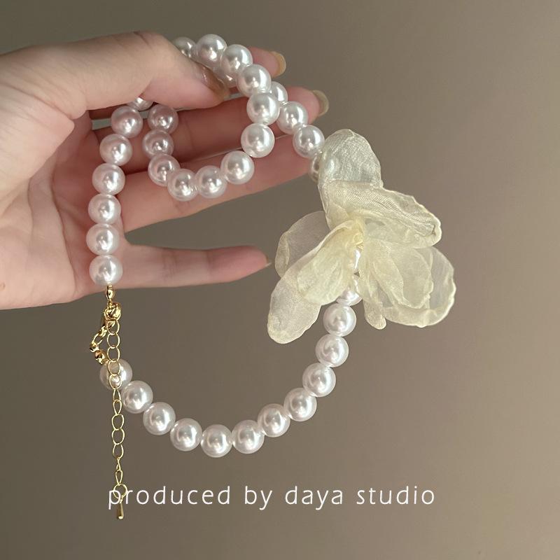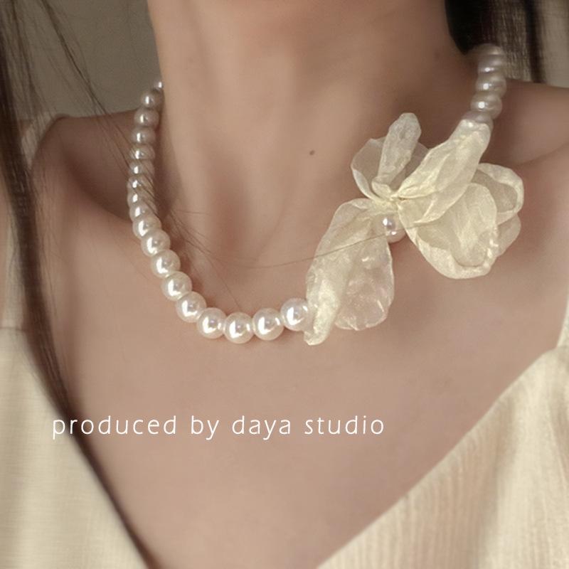 La primavera no llega tarde, collar de flores de gasa con perlas retro francesas, diseño de alta gama, collar de clavícula con temperamento de hada