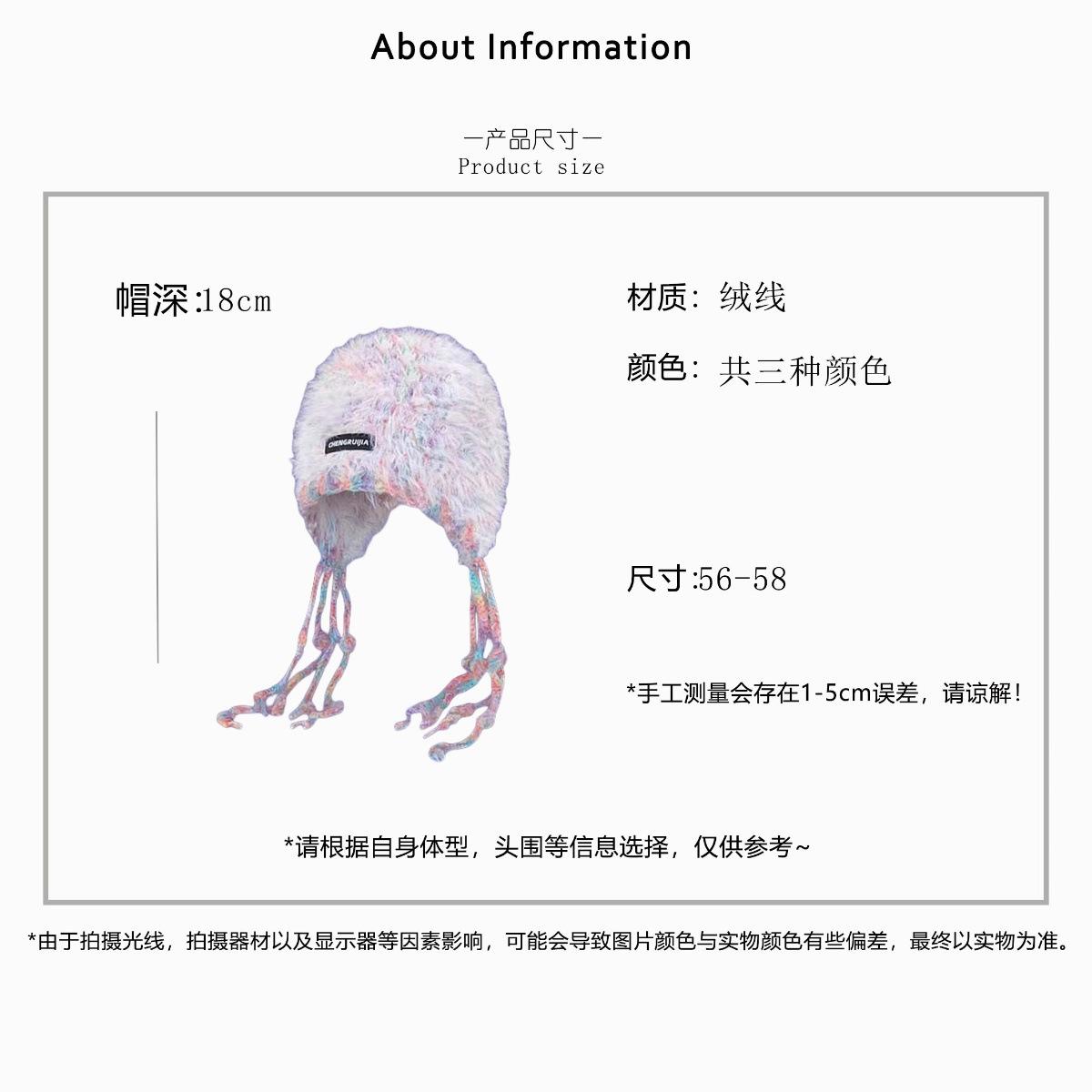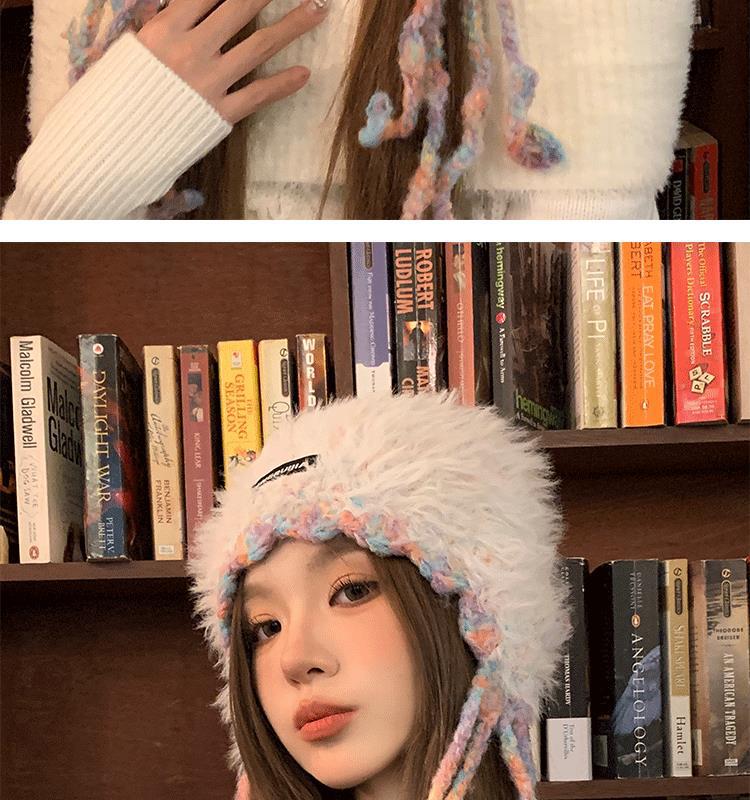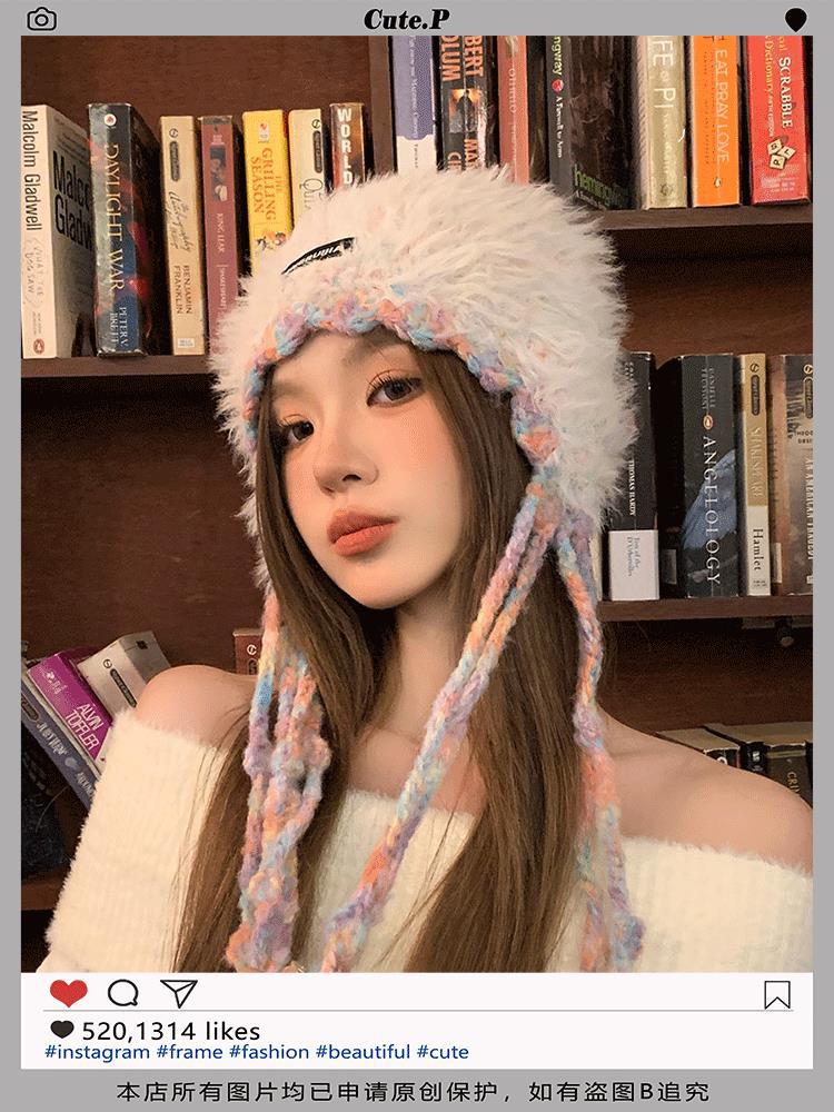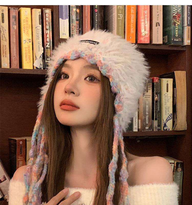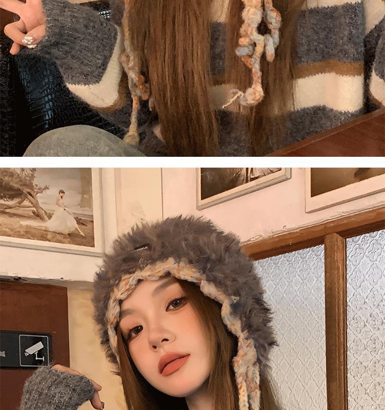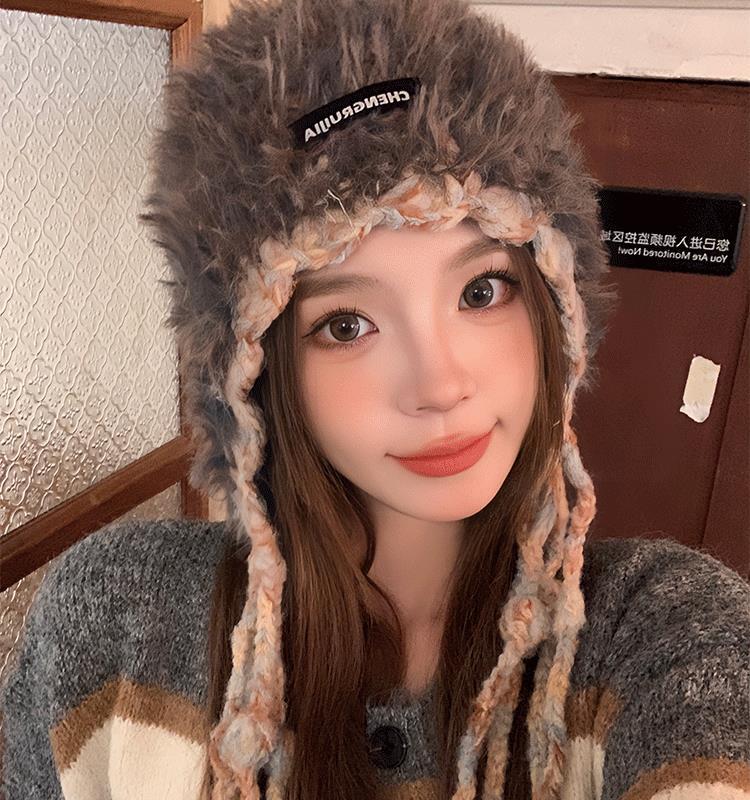Gorro de mujer estilo coreano de otoño e invierno 2023, nuevo gorro de punto de colores variados con correa de felpa, gorro de lana cálido y con protección para las orejas.