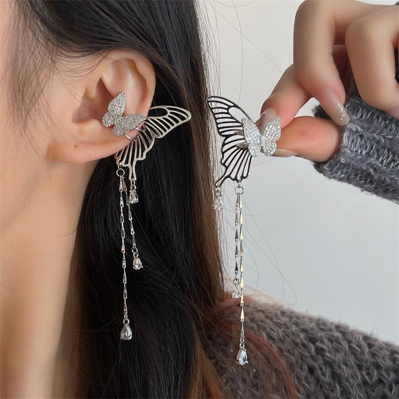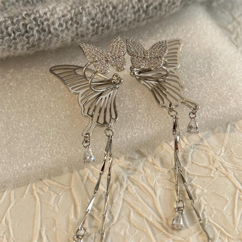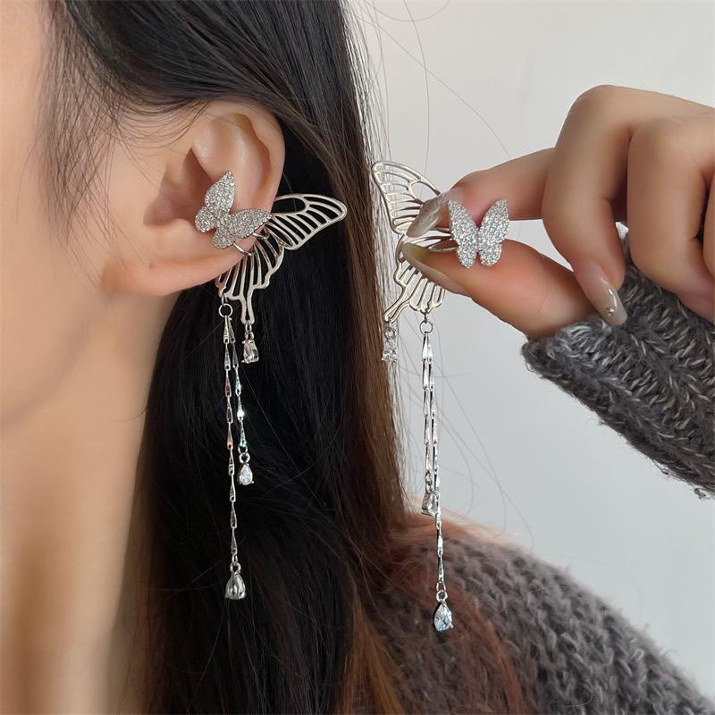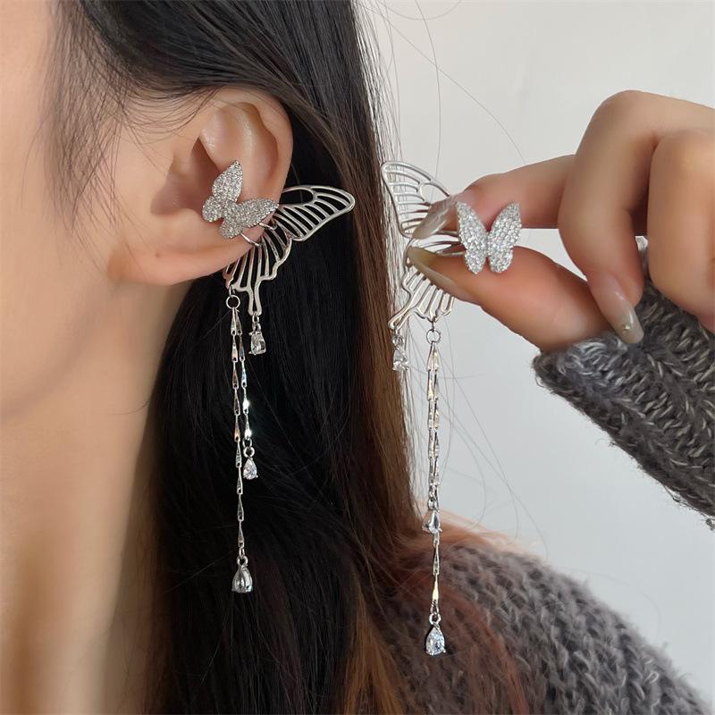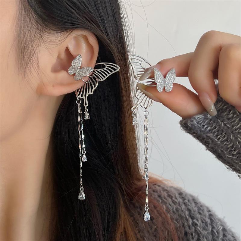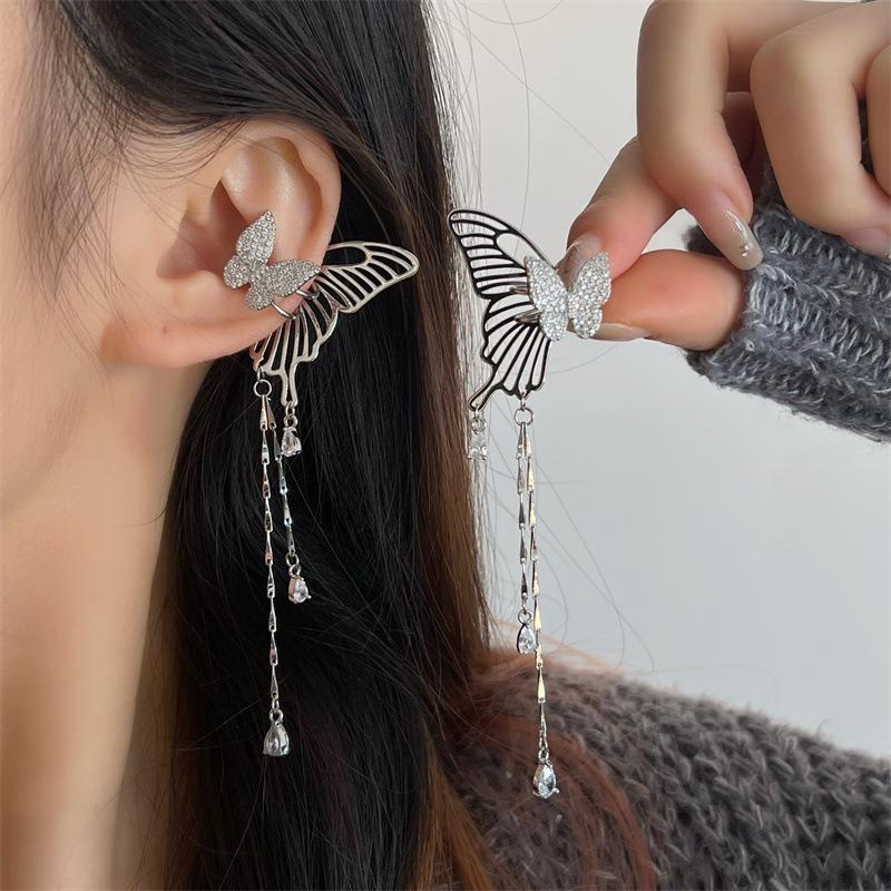 Left Ear butterfly tassel ear clip, Right ear butterfly tassel ear clip