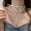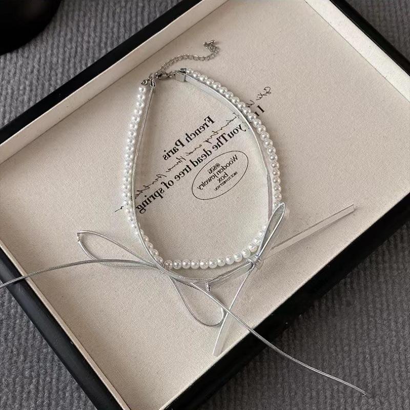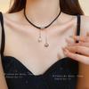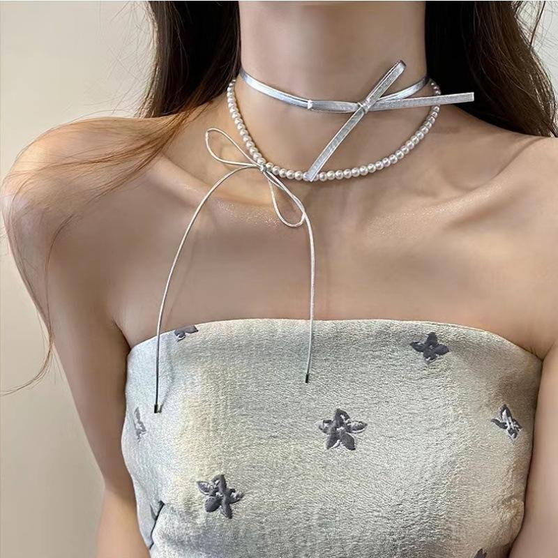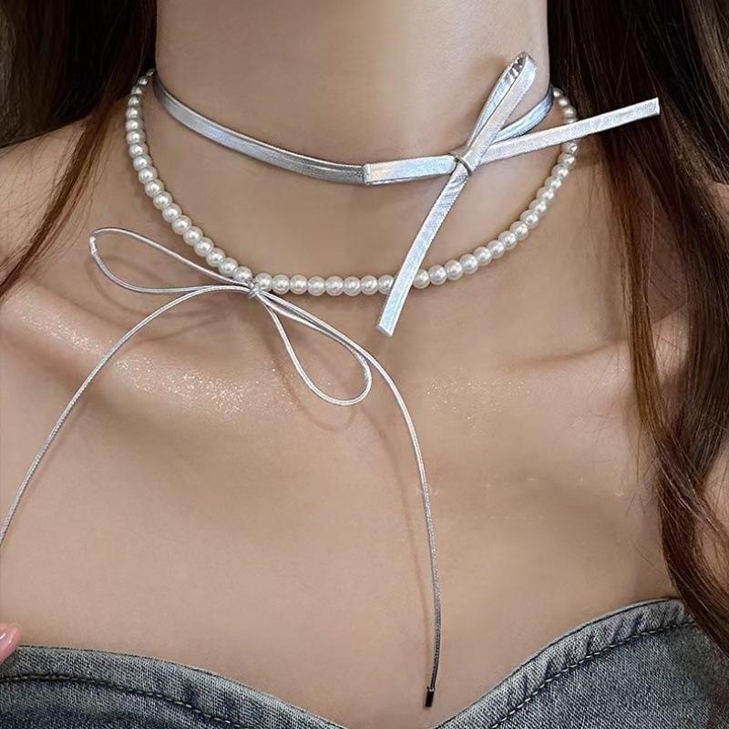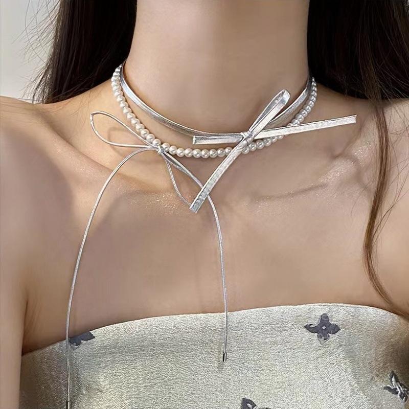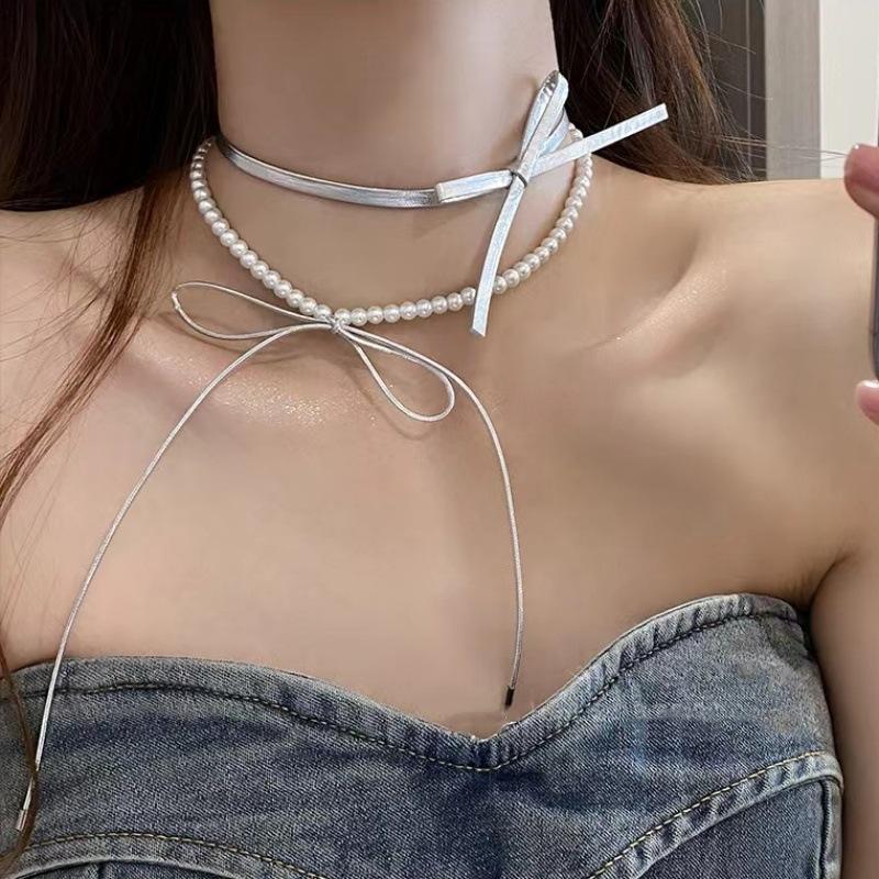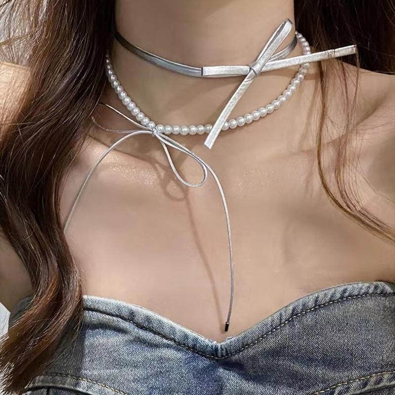 Collar de perlas y lazo de cuero para mujer, elegante y de moda, ligero, de lujo, con diseño de nicho, cadena de clavícula apilada de doble capa.