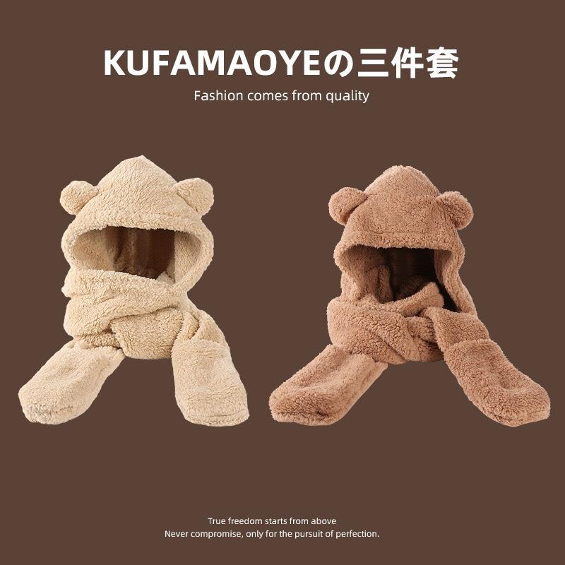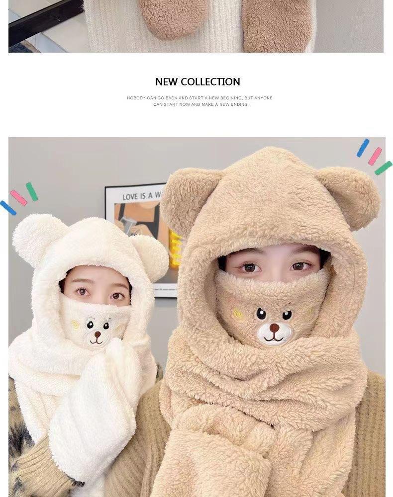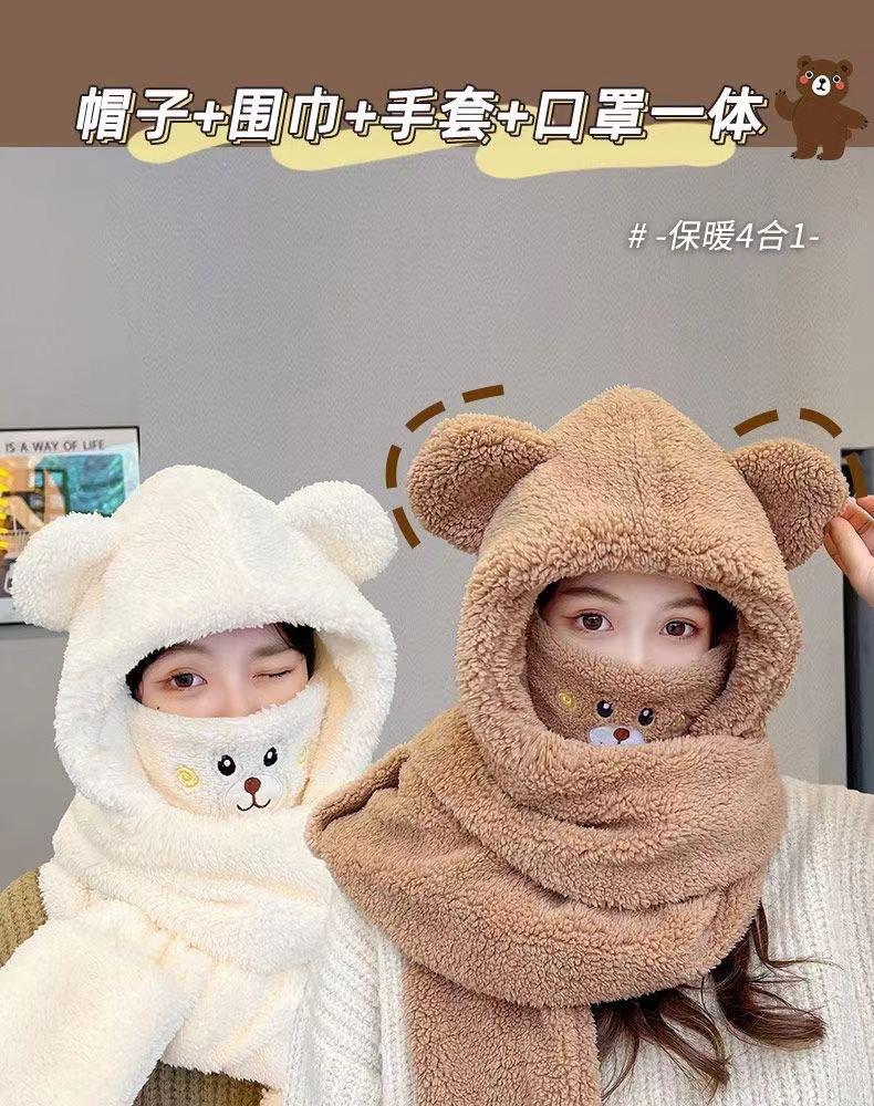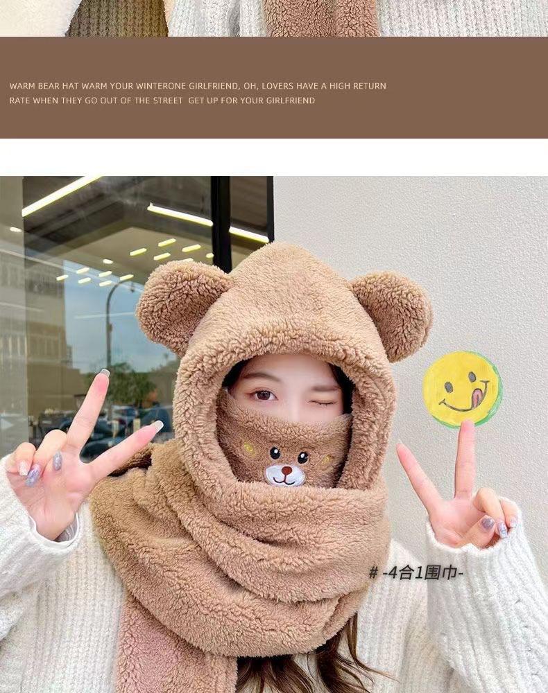 Gorro cálido todo en uno para adultos, bonito gorro de felpa para exteriores con forro polar y capucha de oso, estilo coreano, todo en uno, cuatro en uno