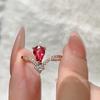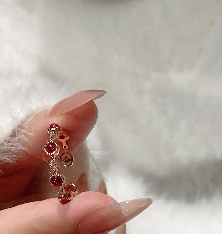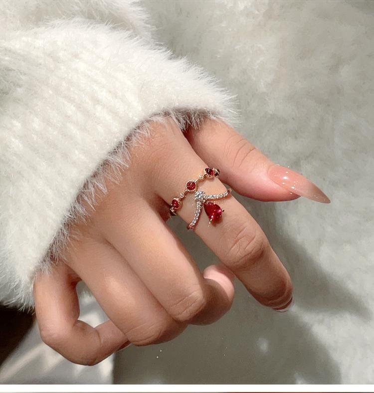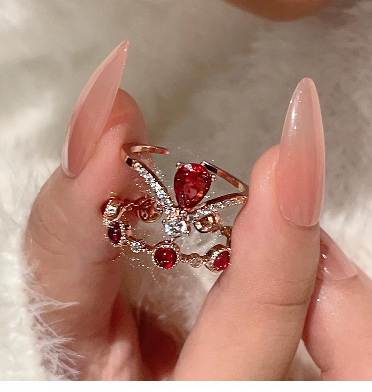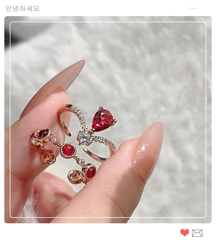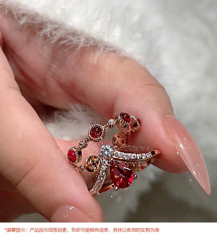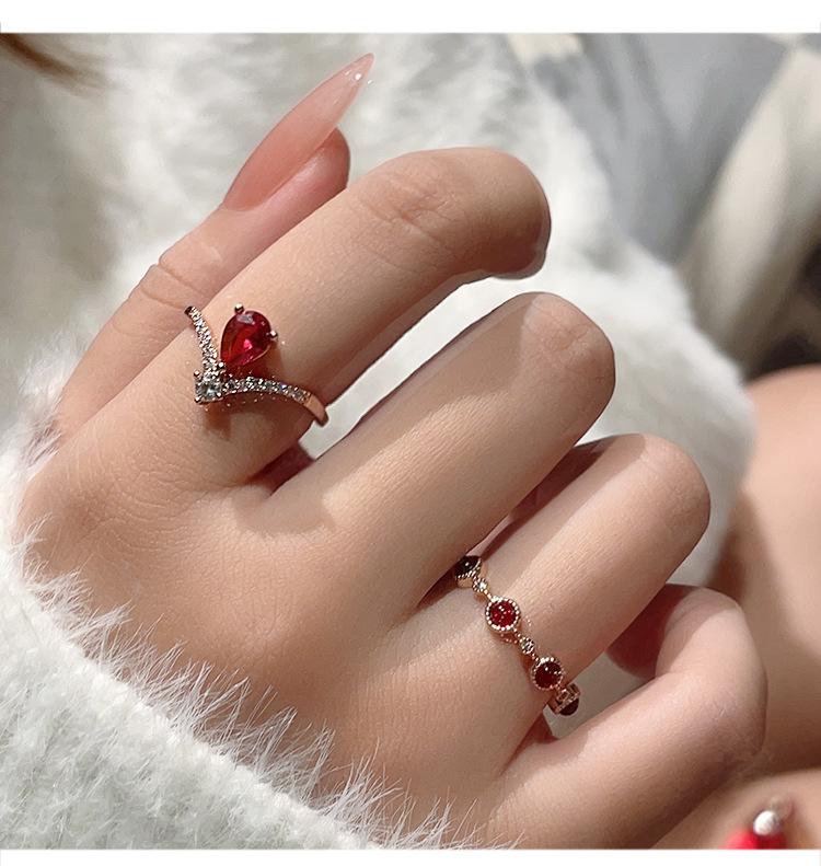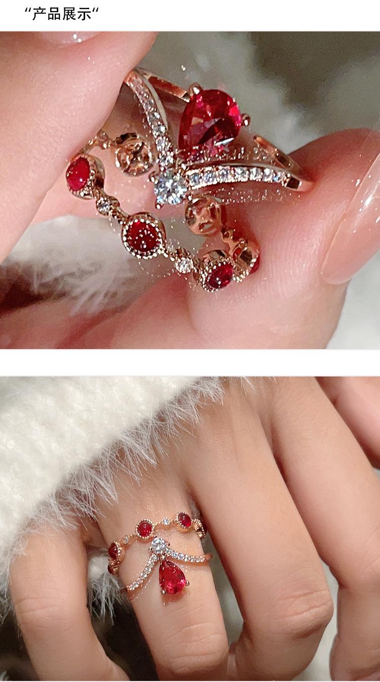 Anillo de rubí festivo retro exquisito de alta gama para mujer, temperamento de lujo ligero, con incrustaciones, apilable, anillo abierto