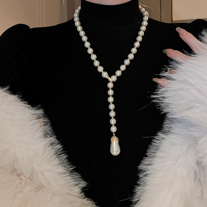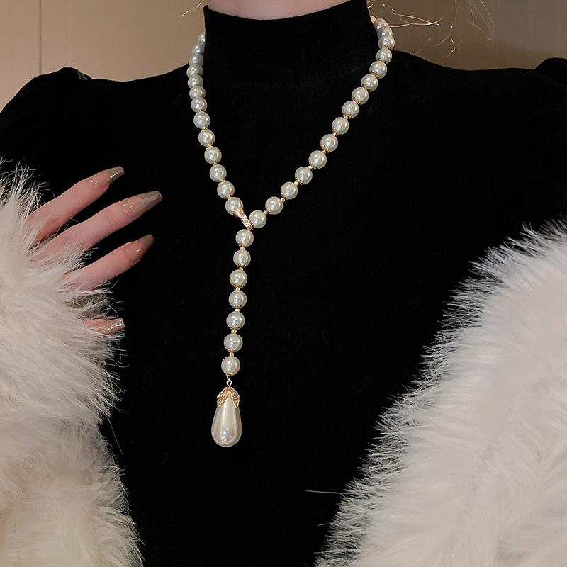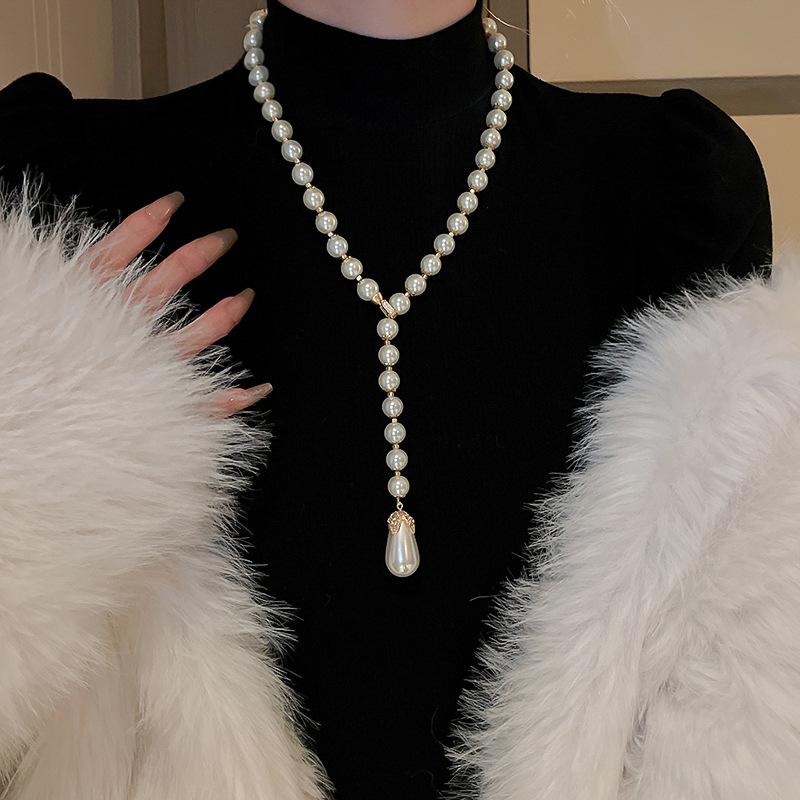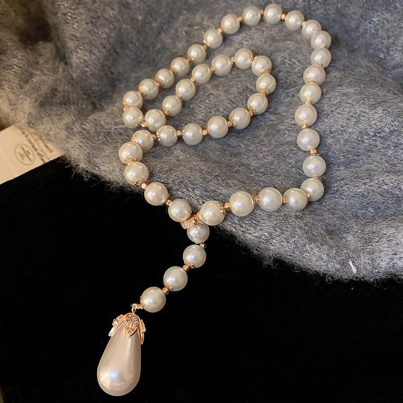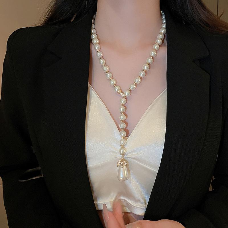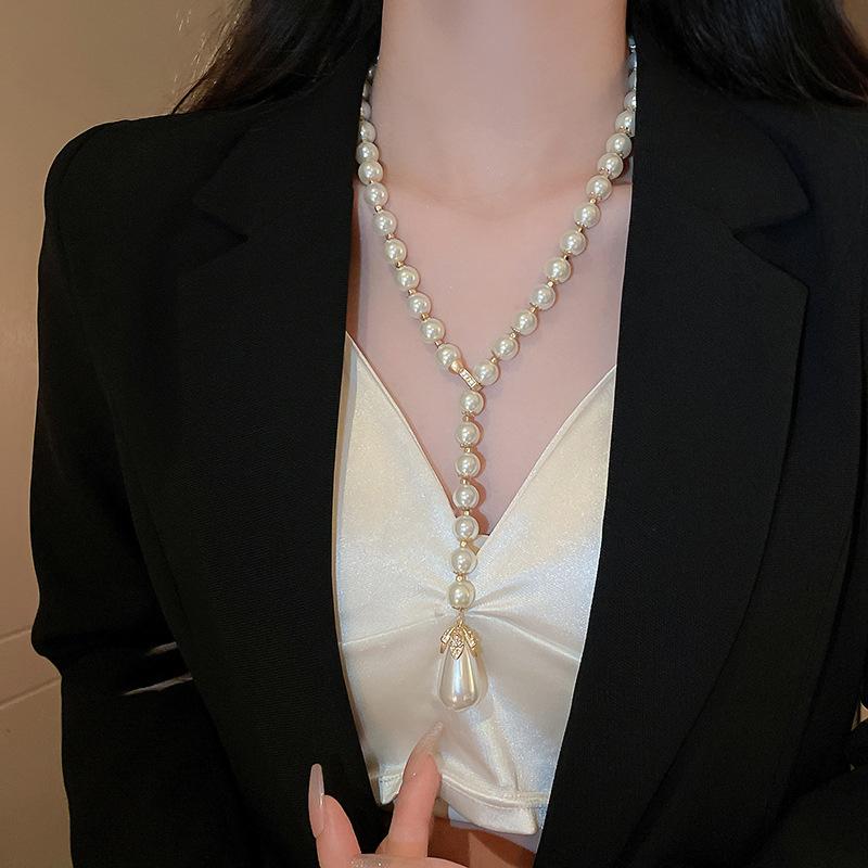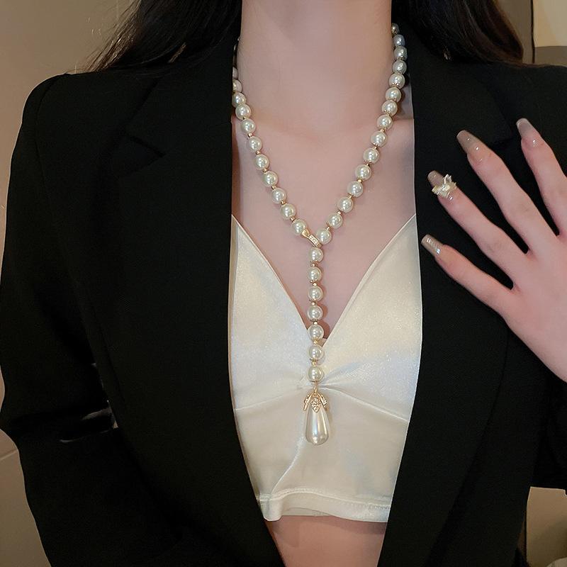Collar de perlas con forma de gota de agua incrustado de diamantes, cadena para suéter de temperamento de lujo ligero francés, explosiones en vivo, joyería de otoño e invierno, mujeres, venta al por mayor