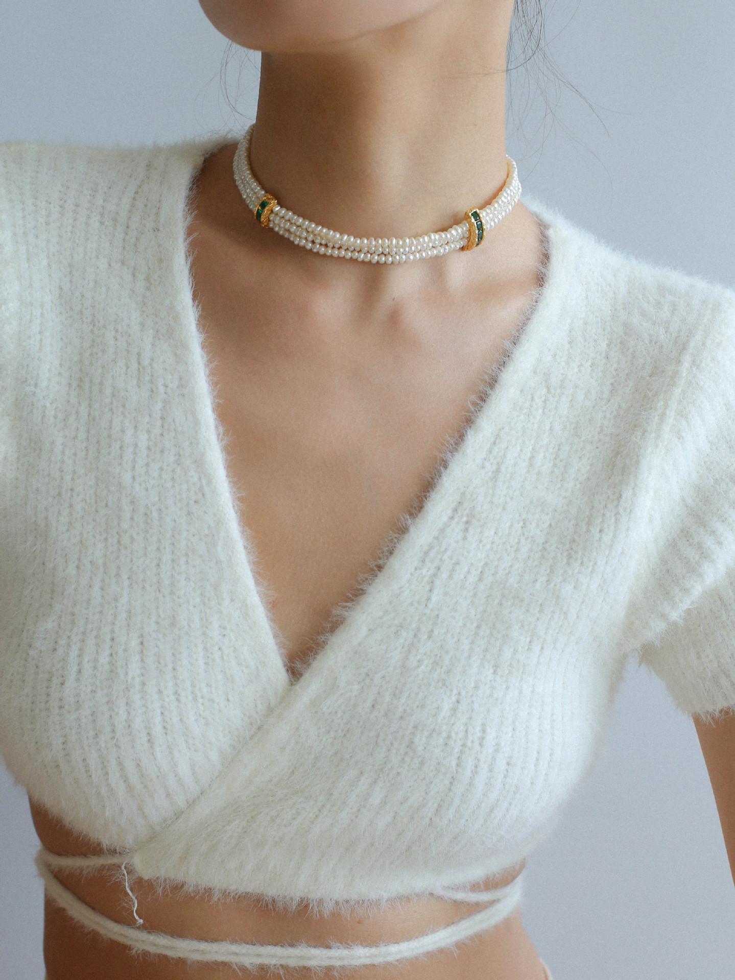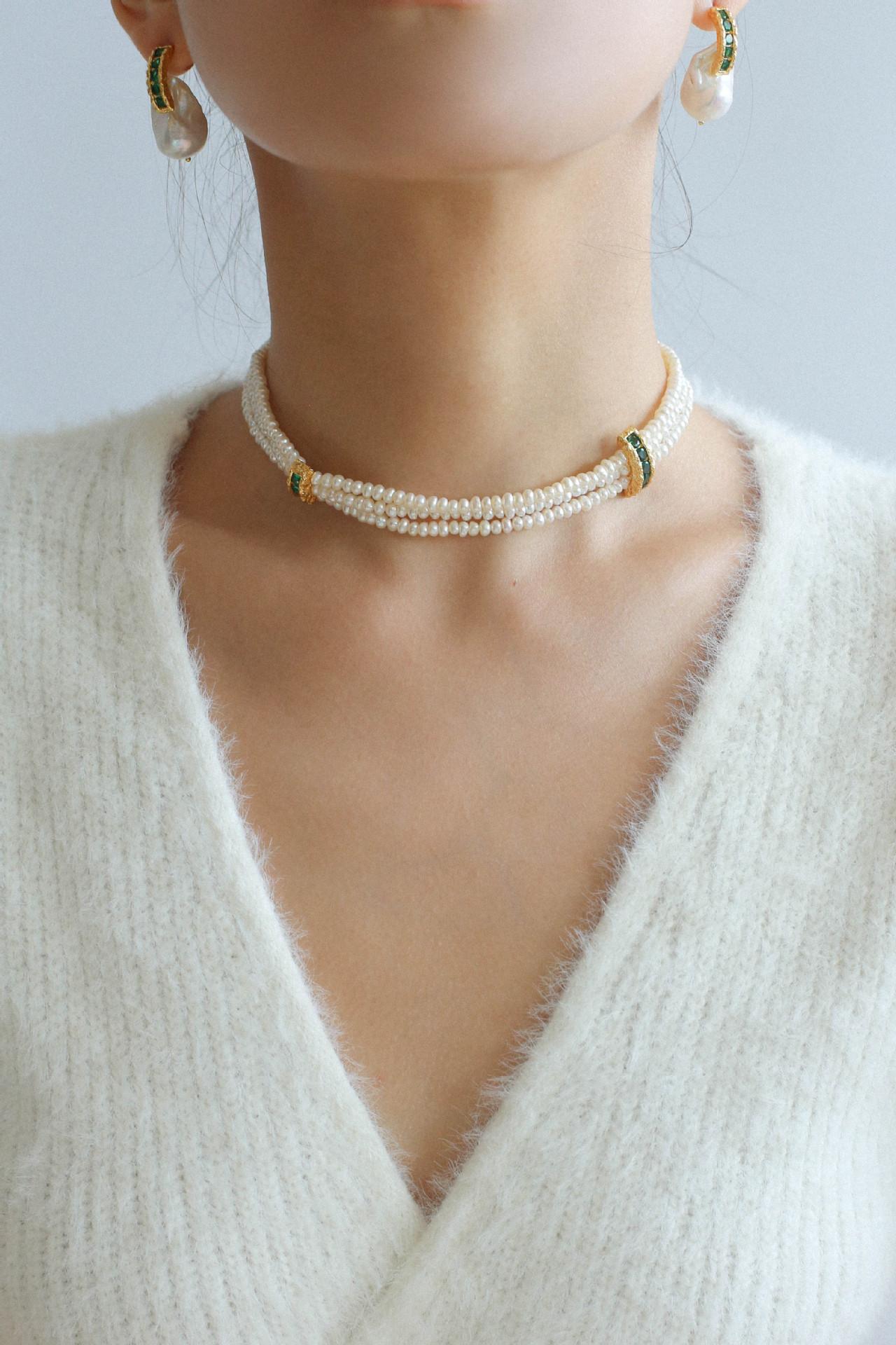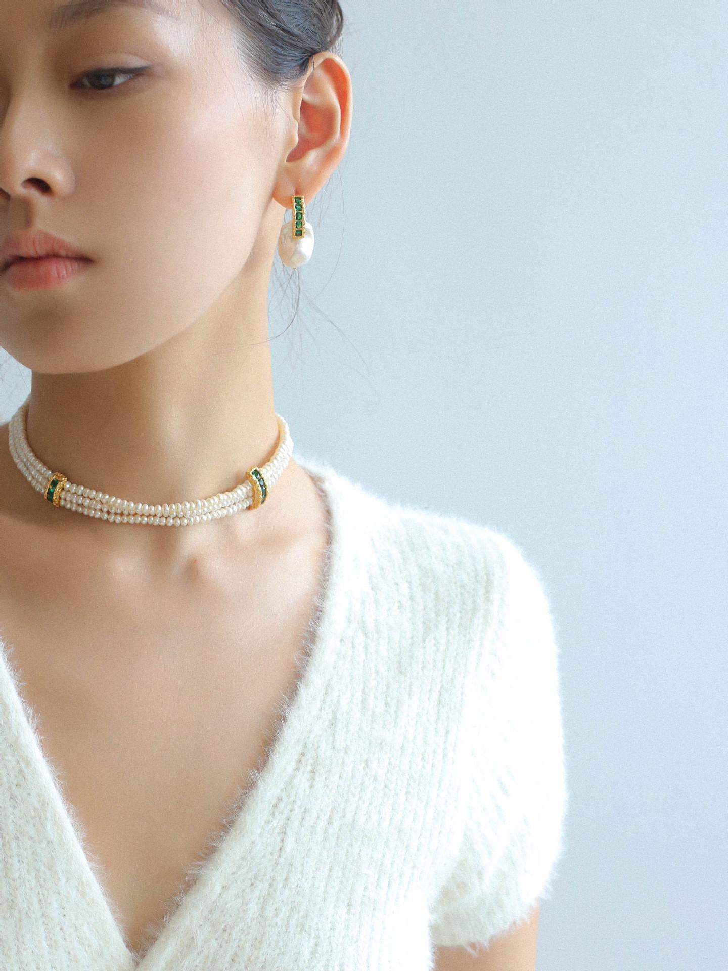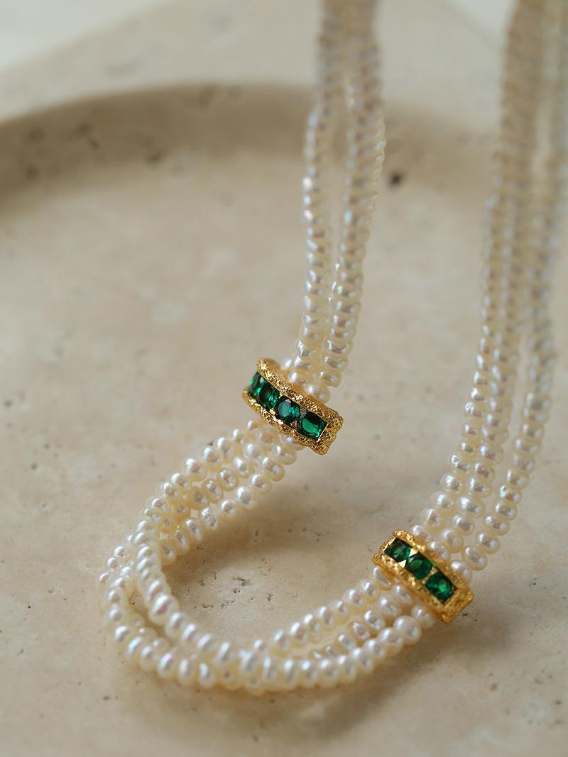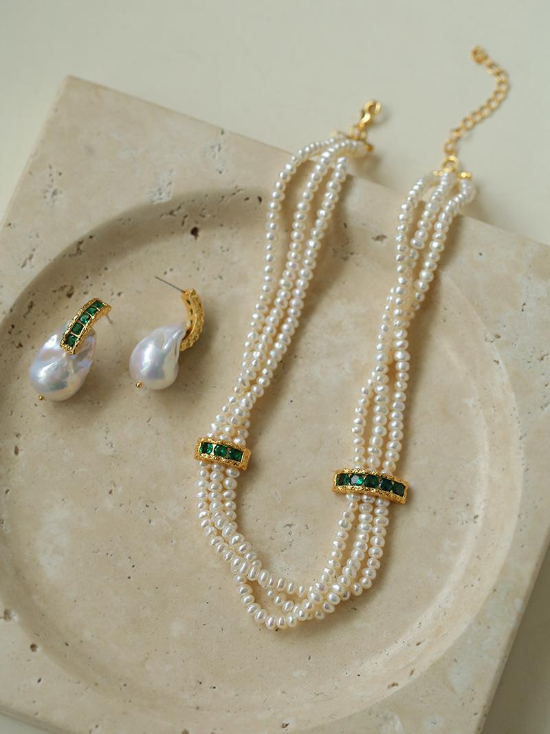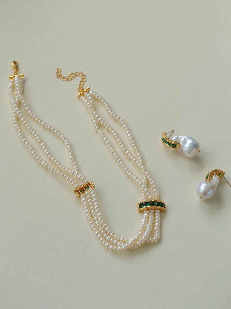 Collar de Perlas de Mijo de Tres Capas Cadena Clavicular de Zircón Verde Aretes Barrocos Collar de Perlas de Moda Transfronterizo