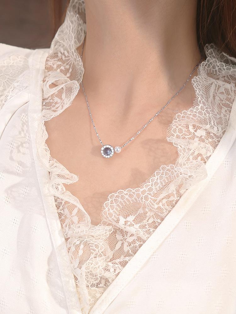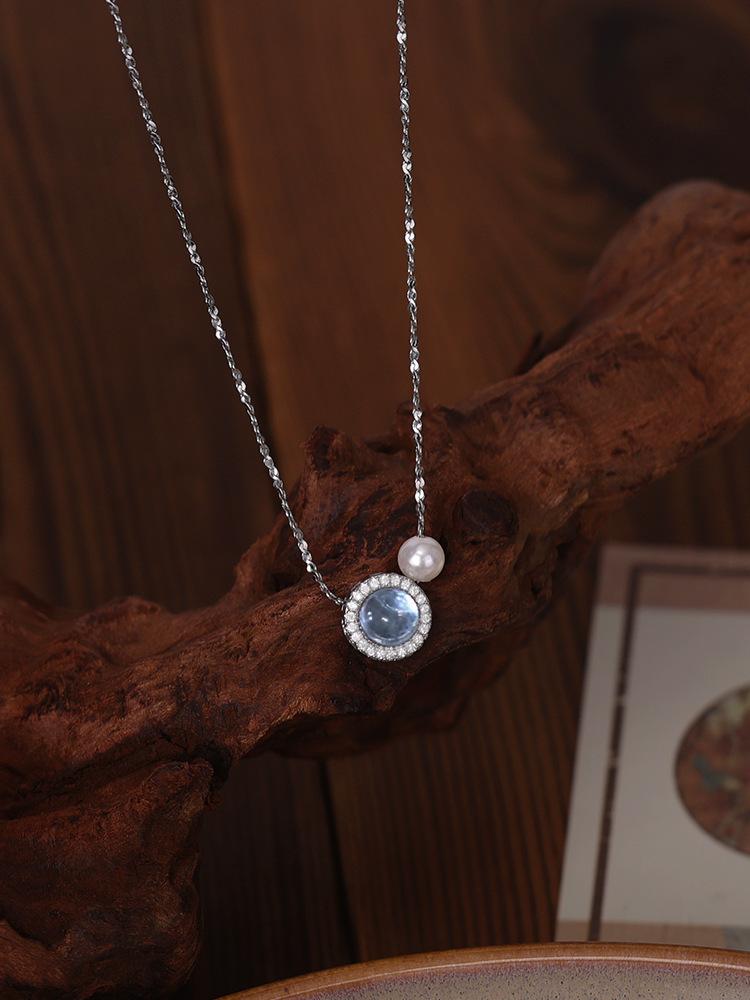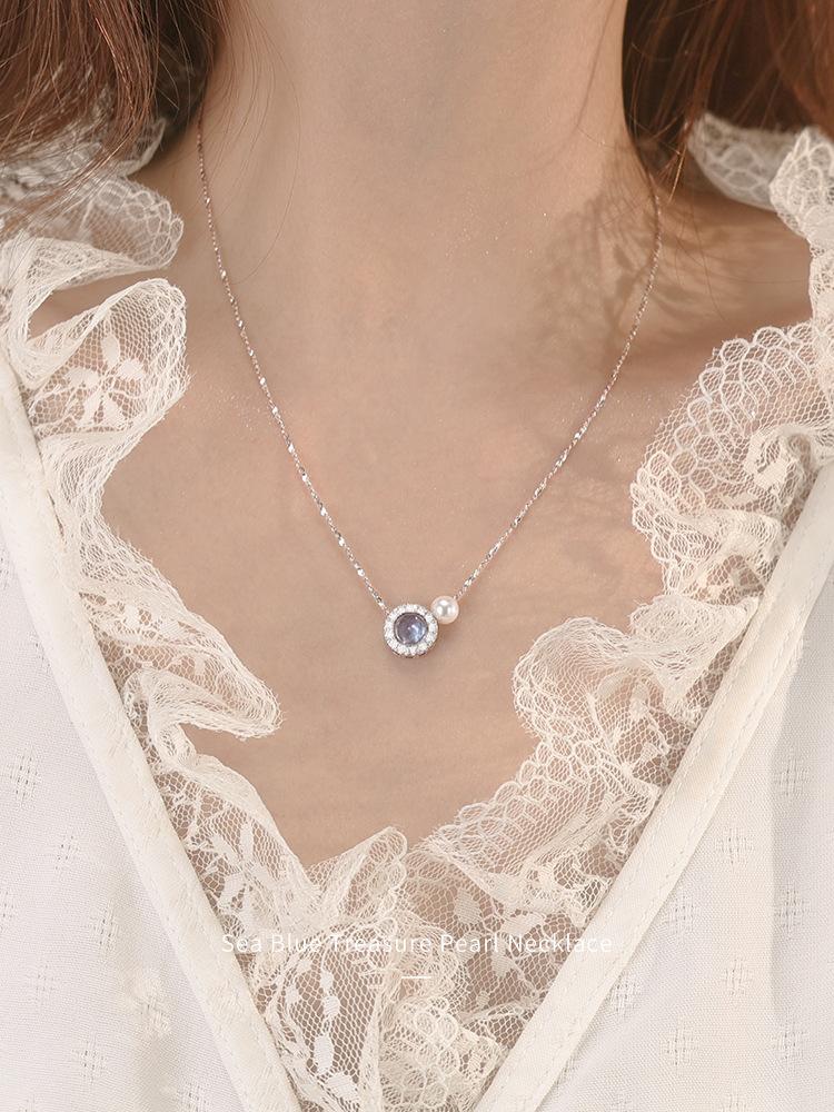 Nuevo collar con colgante de perla aguamarina y ojo de gato para mujer, ligero, de lujo, sencillo y moderno, con cadena de clavícula Gimono.
