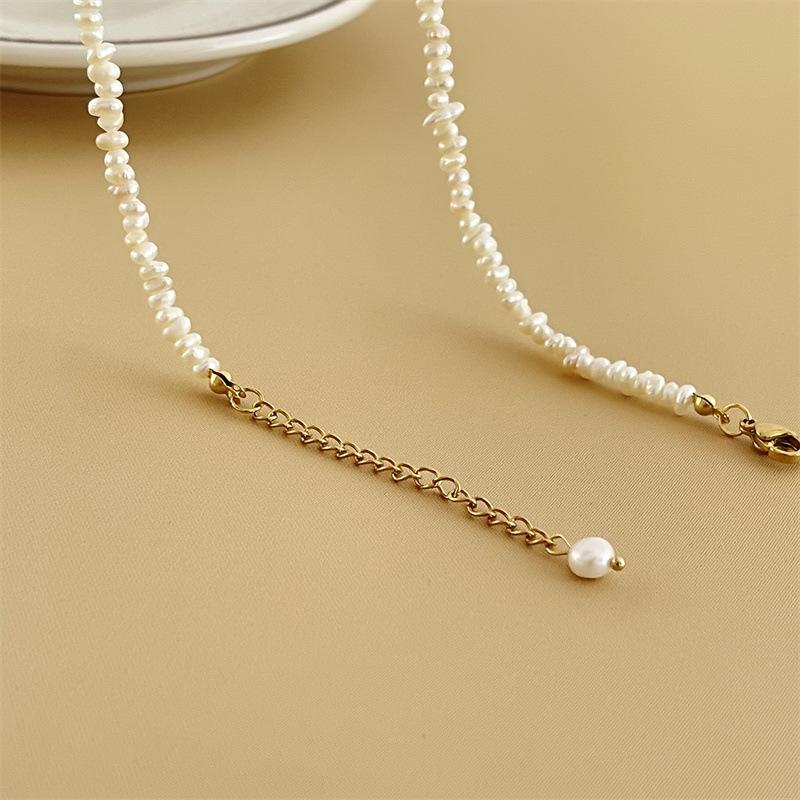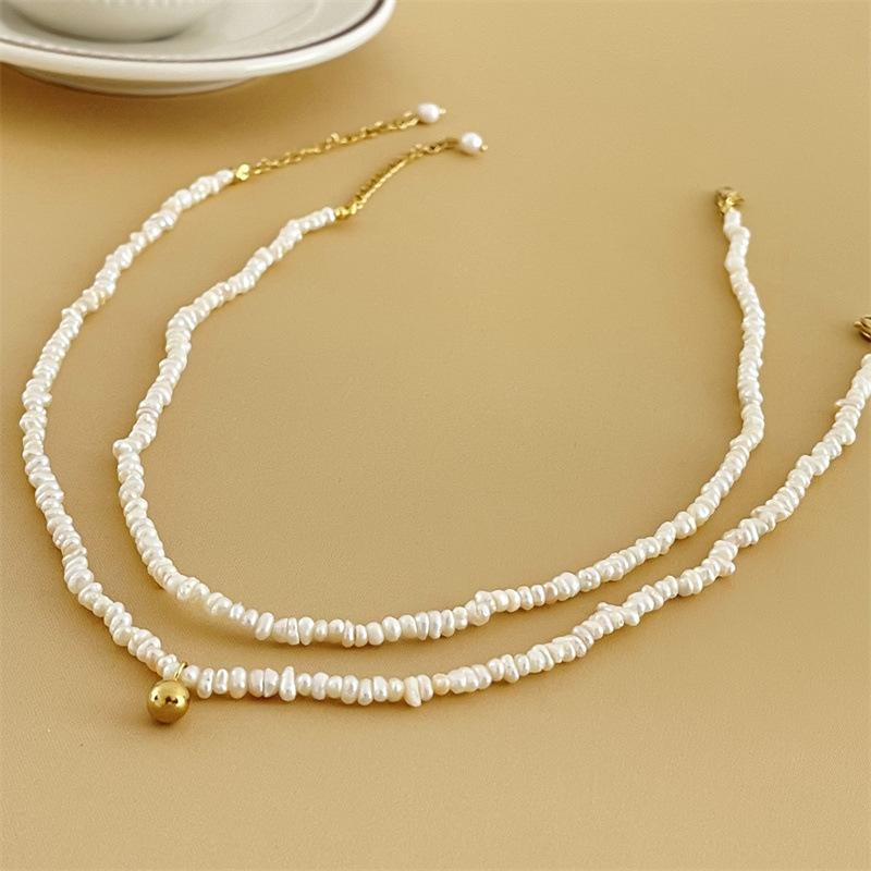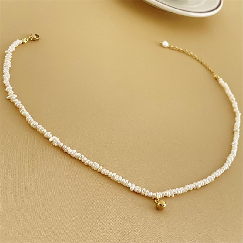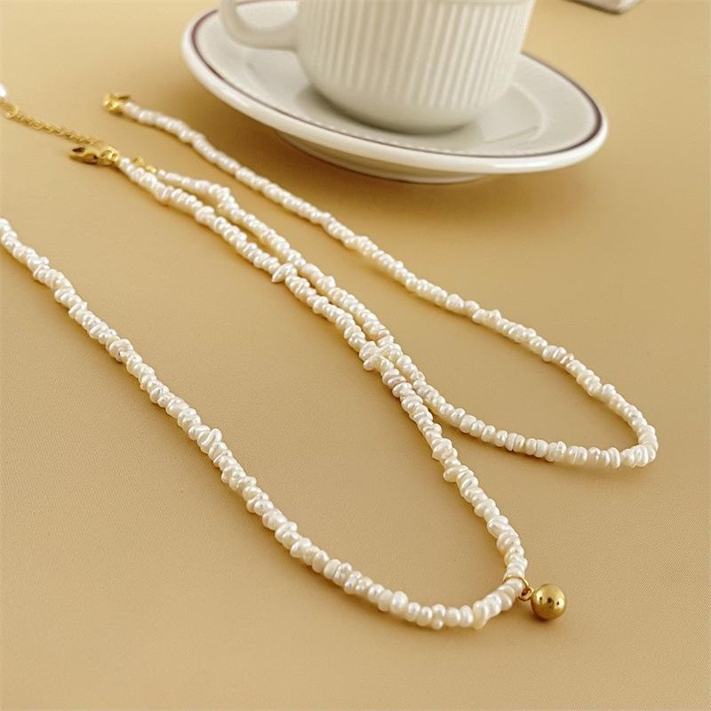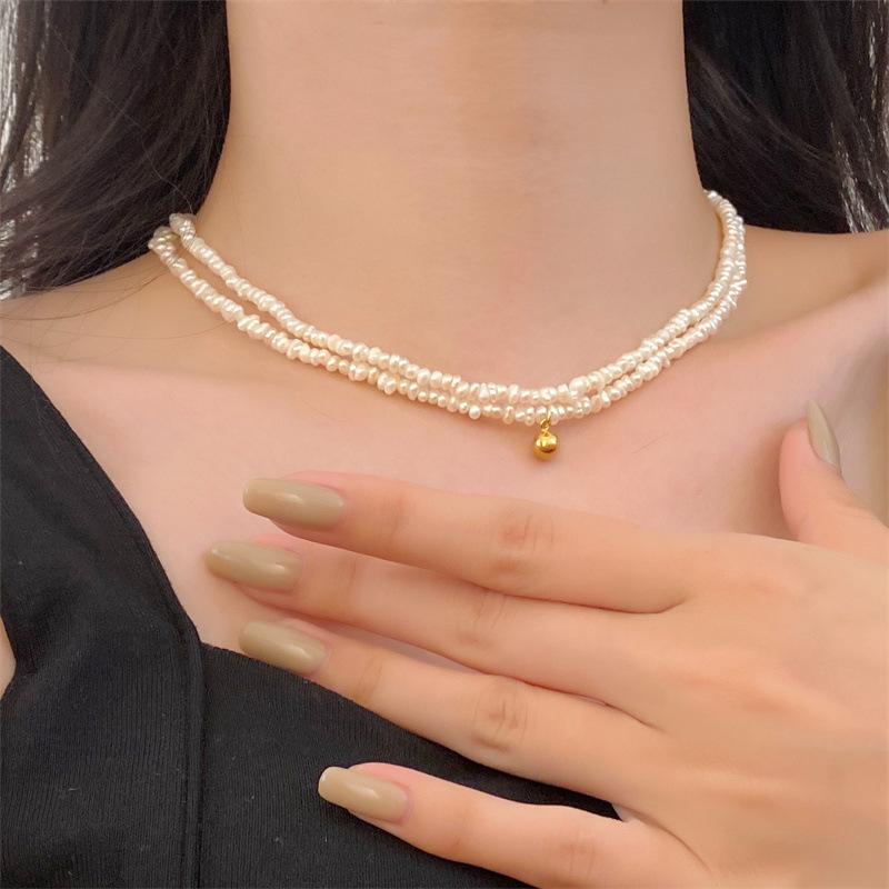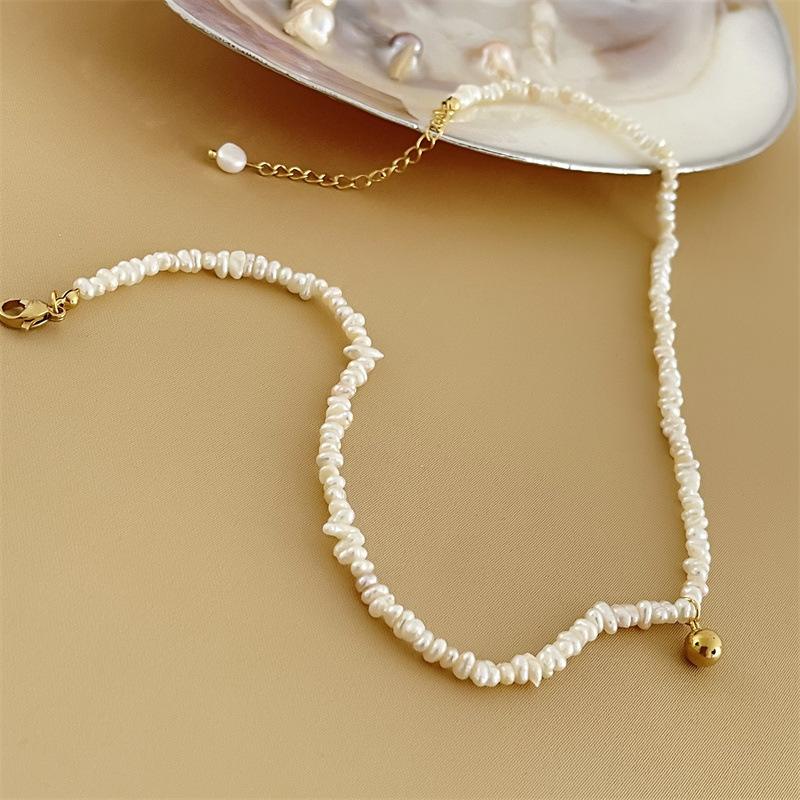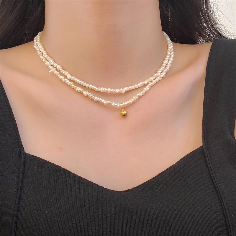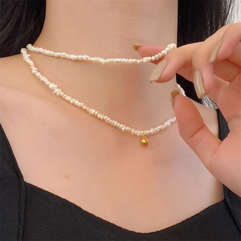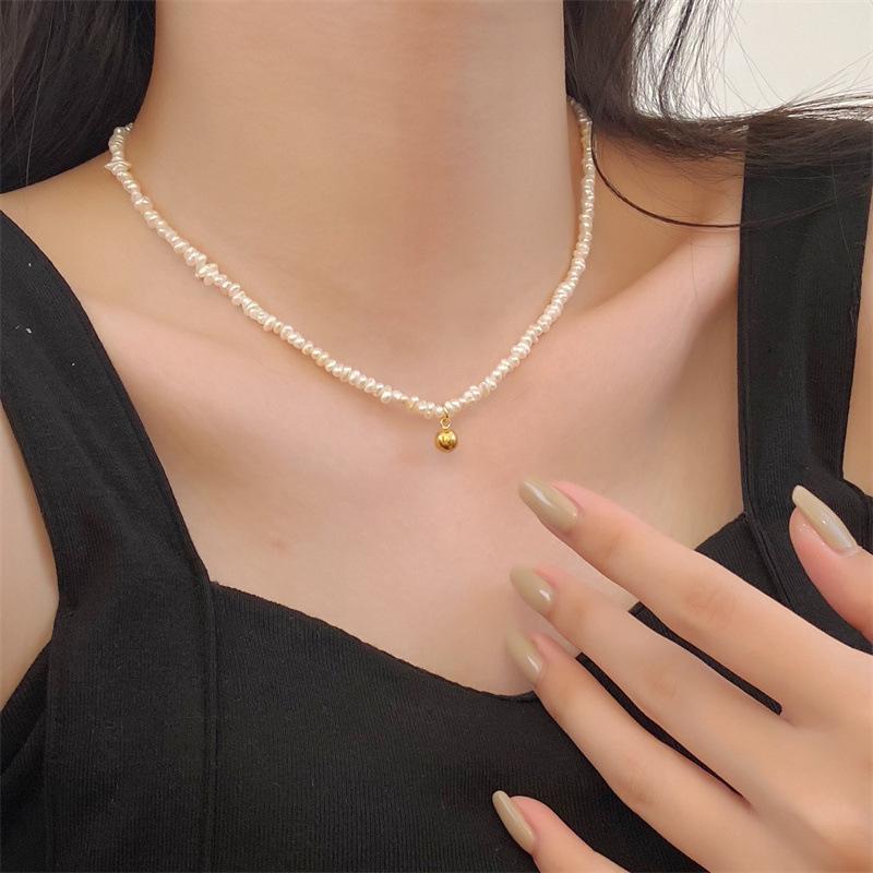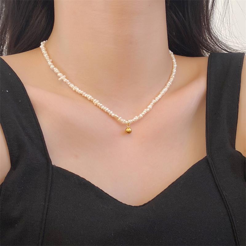 Gargantilla vintage de cuentas de arroz y frijoles dorados, cadena de clavícula de acero de titanio, collar de perlas naturales de agua dulce, collar de bolas de oro pequeñas para mujer