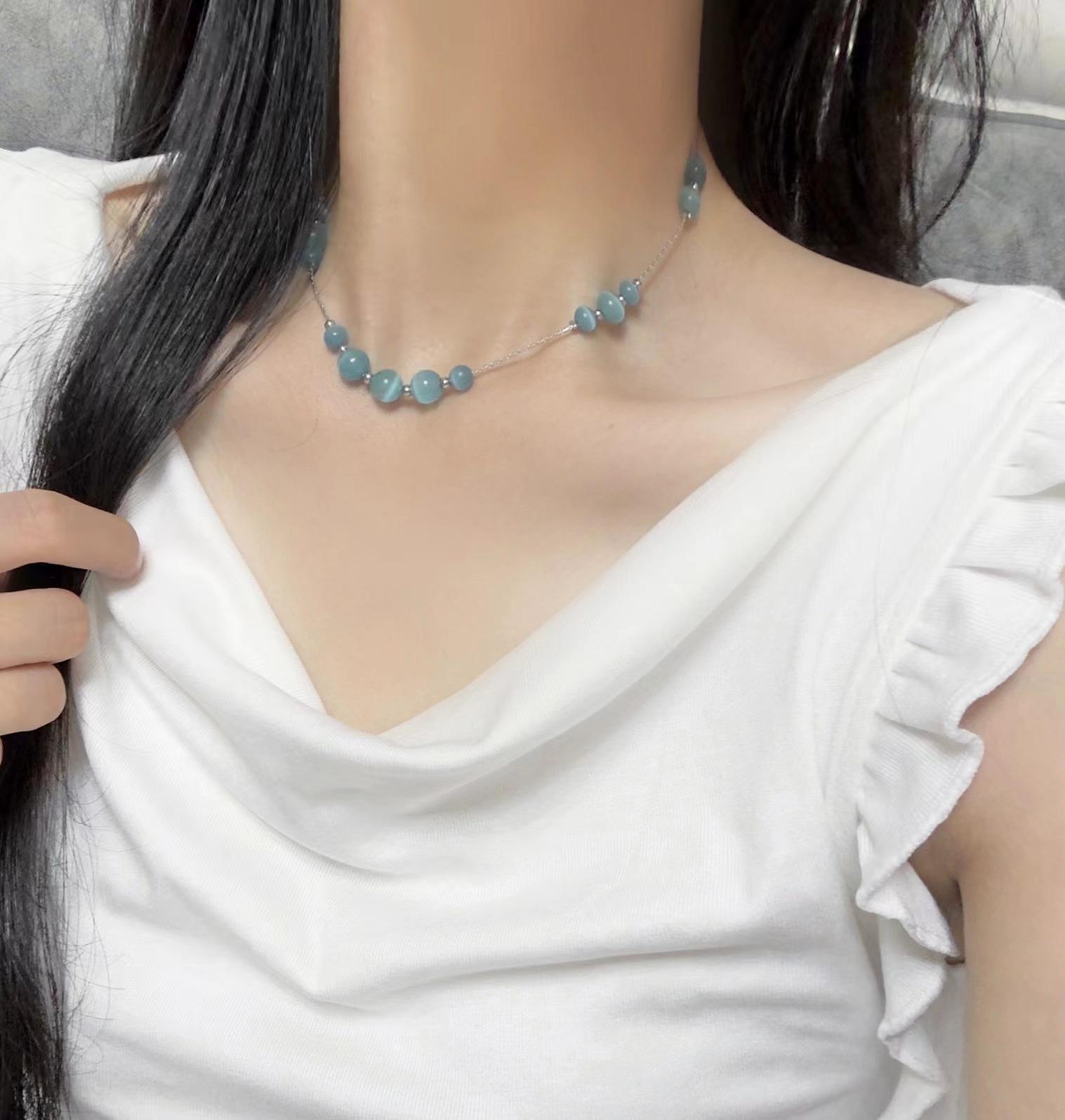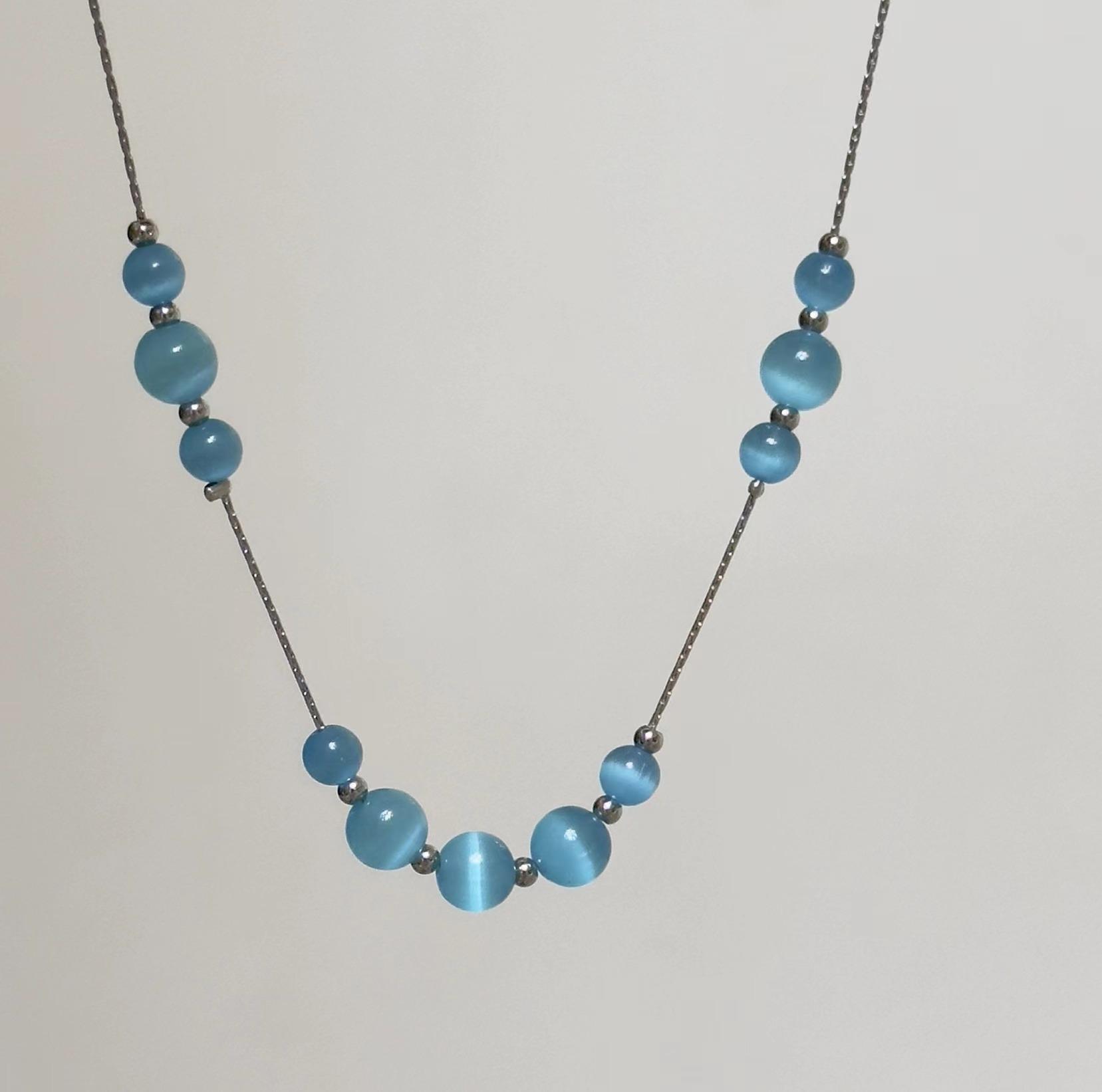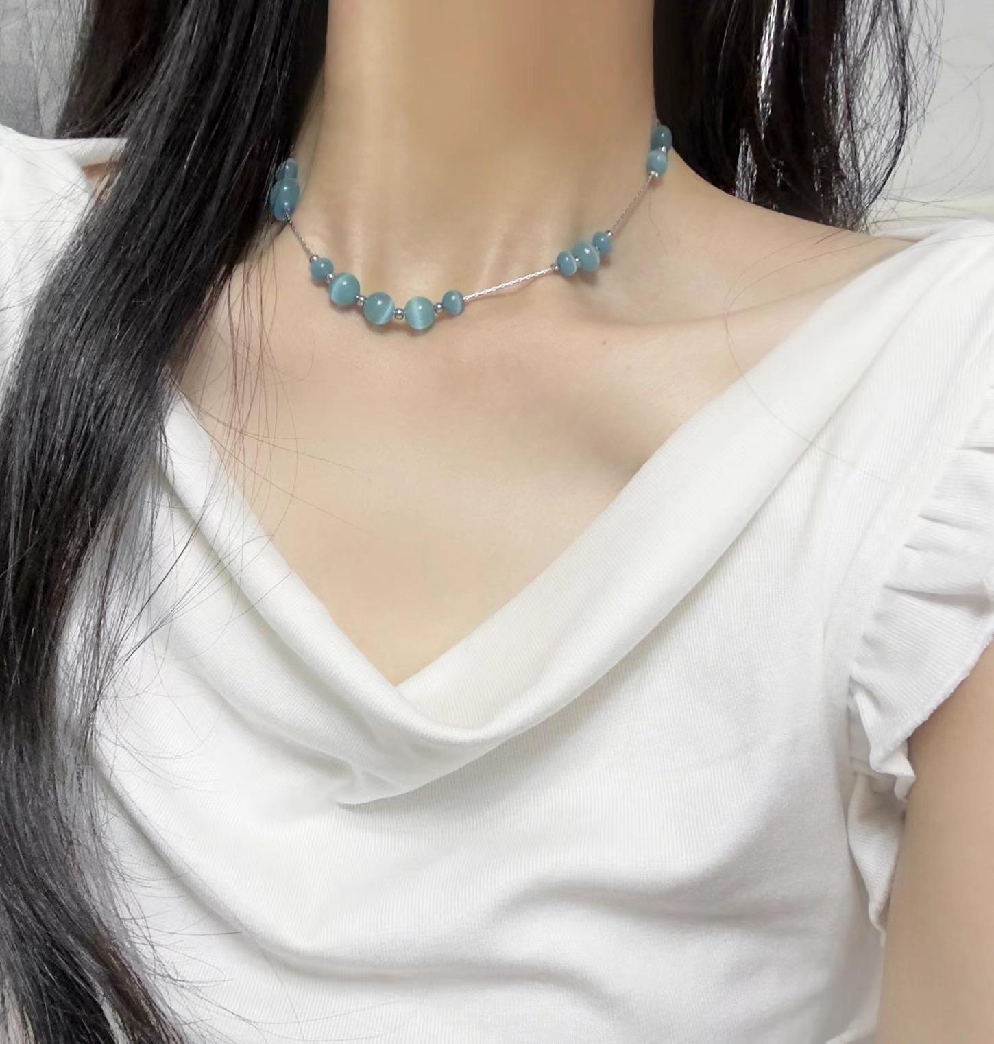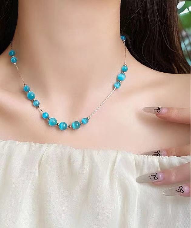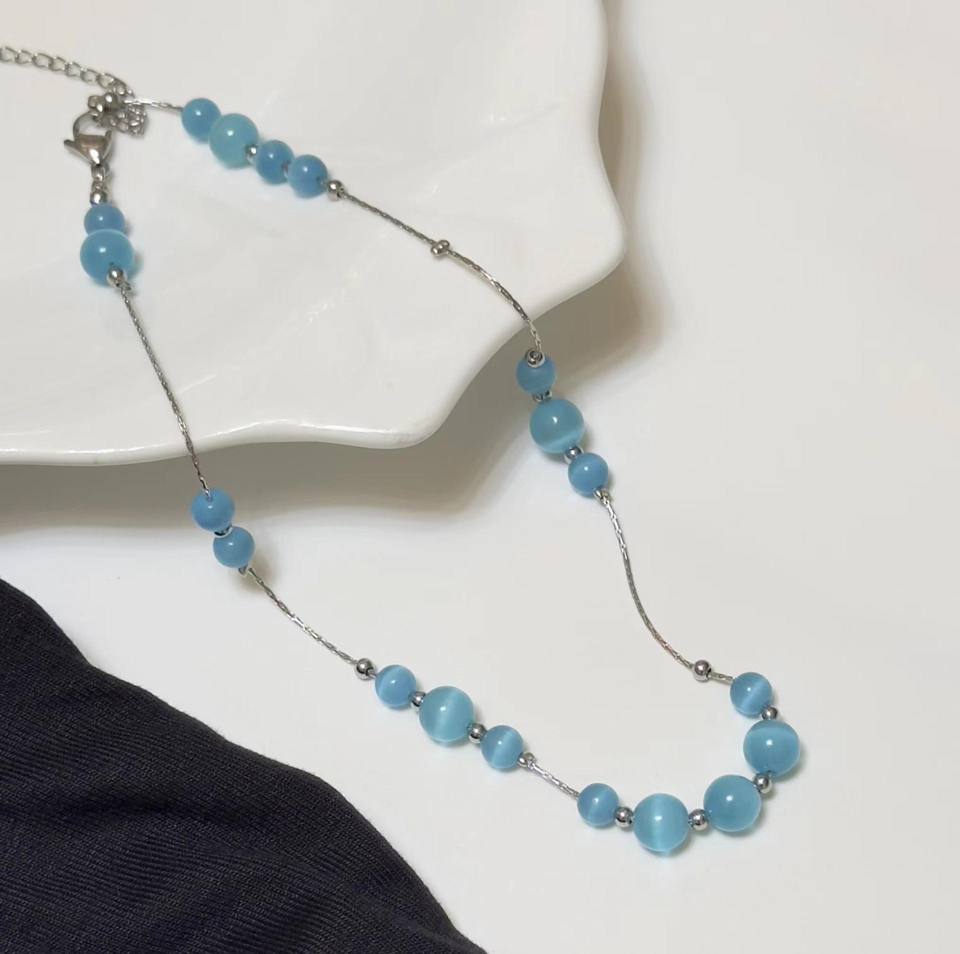 Collar de ópalo redondo azul fresco pequeño de acero de titanio resistente a la decoloración, cadena de clavícula de personalidad simple, joyería ligera de moda de lujo