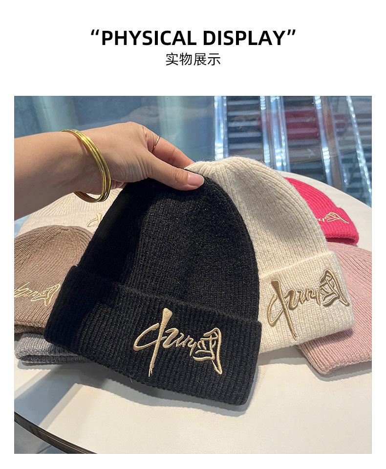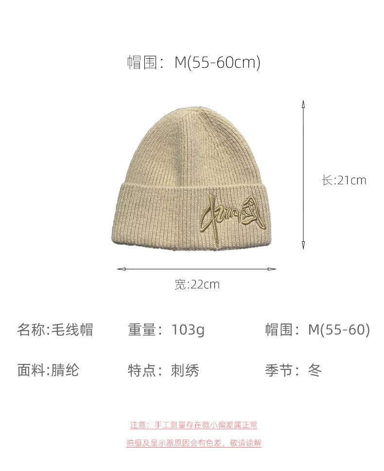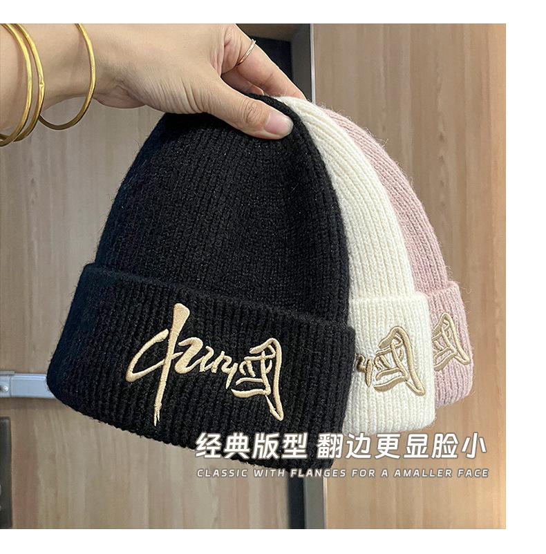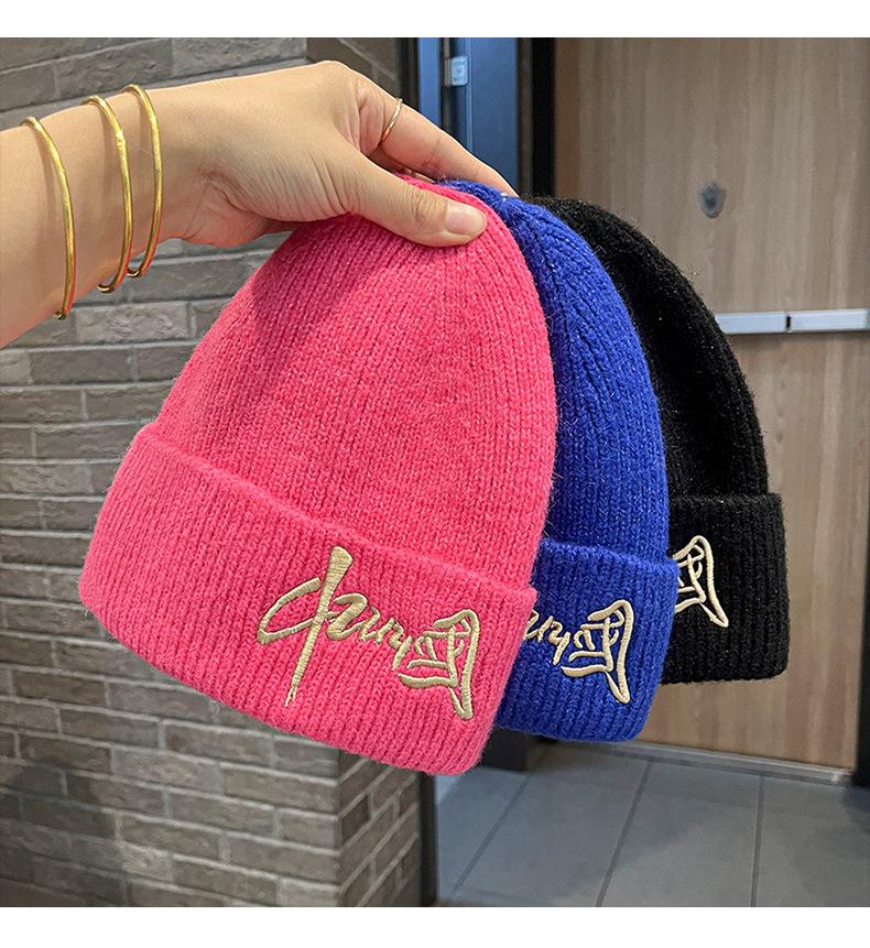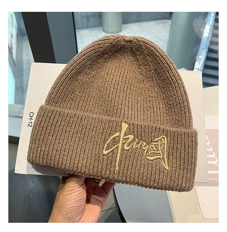 Gorro de Lana para Mujer Nuevo Otoño e Invierno Moda Nacional Bordado Caracteres Chinos Cálido Jersey Gorro Frío para Hombre Personalidad Combinación Versátil Gorro Tejido