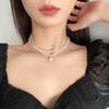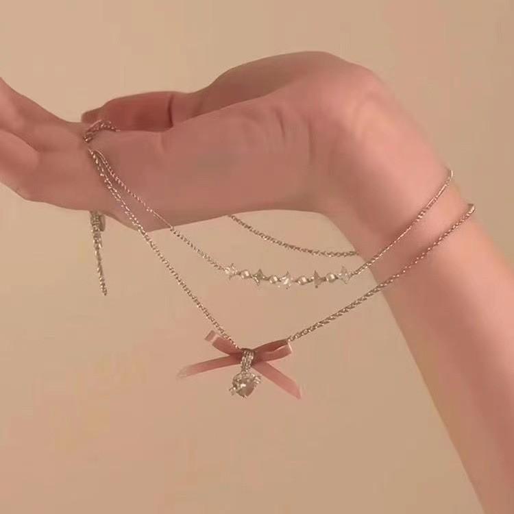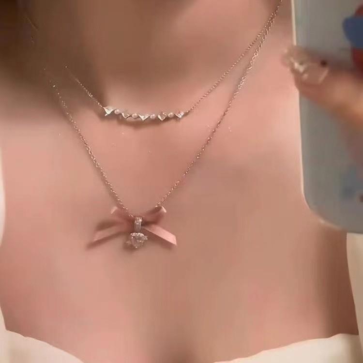 Nuevo collar de doble capa con lazo rosa, diseño de nicho, elegante y ligero, de lujo, de alta gama, con cadena de clavícula para mujer.