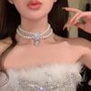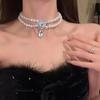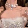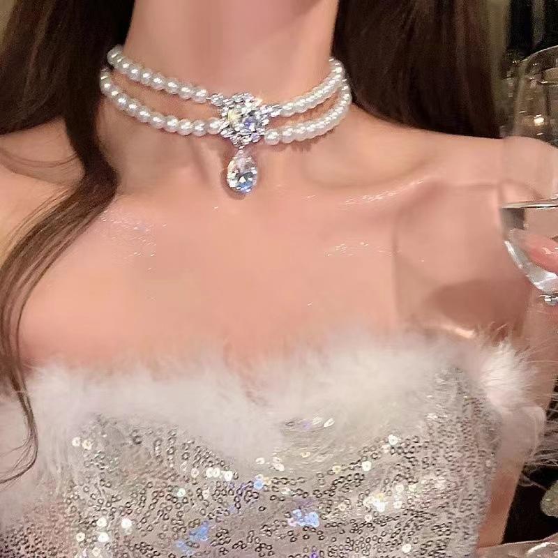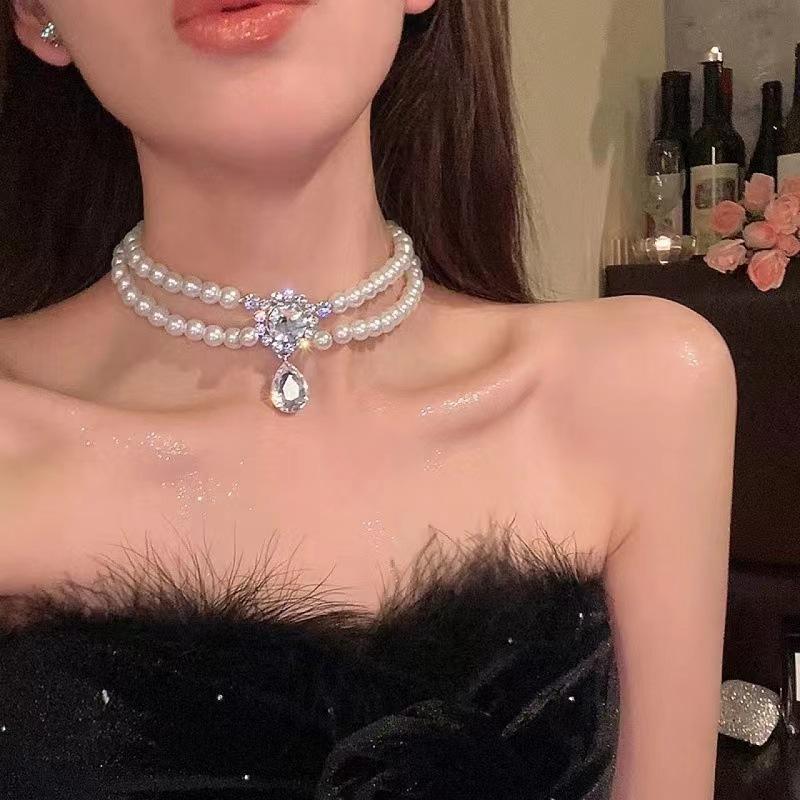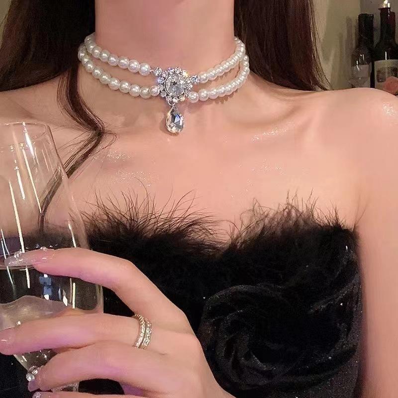 Collar elegante de alta gama con cadena de clavícula de perlas de doble capa y diamantes de imitación en forma de gota, estilo retro francés.