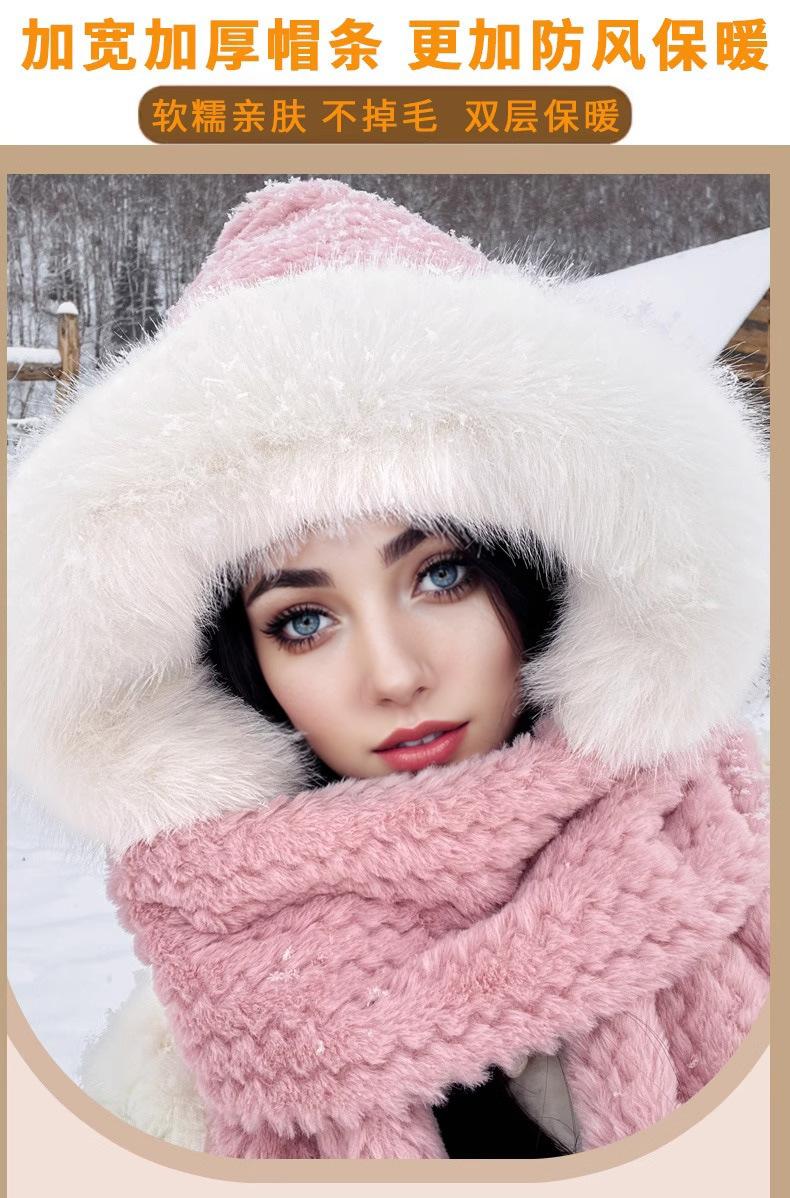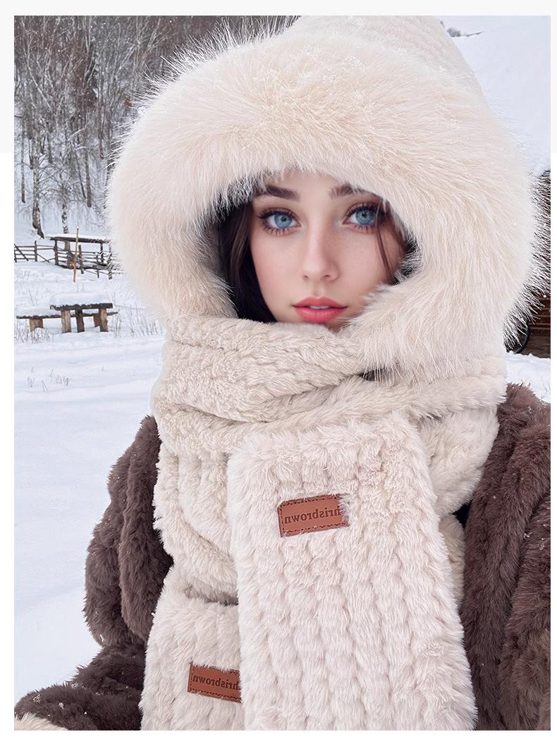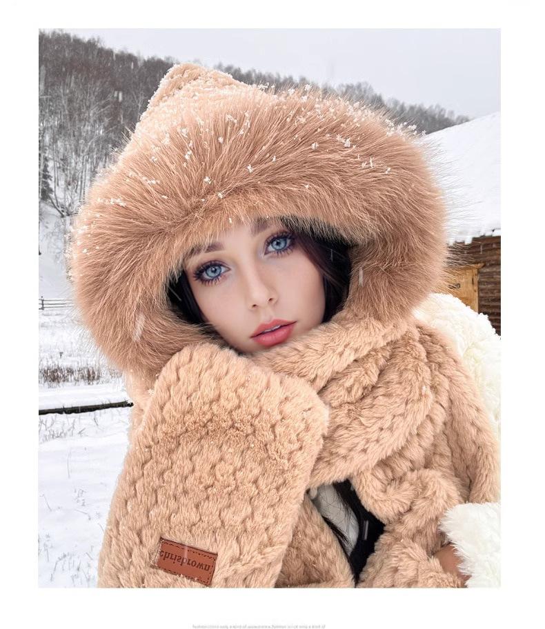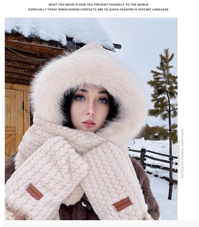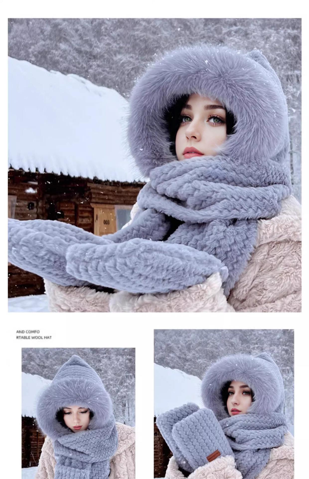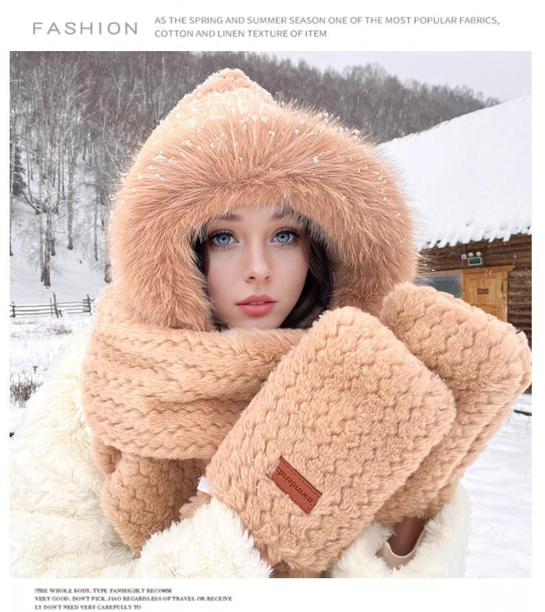 Conjunto de Tres Piezas para Invierno para Montar al Aire Libre: Sombrero Esponjoso con Bufanda Integrada, Tejido Cálido de Pelo de Conejo Rex, Bufanda a Prueba de Viento con Sombrero Integrado