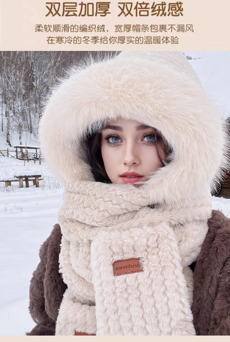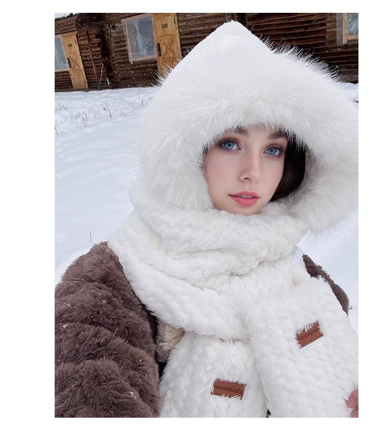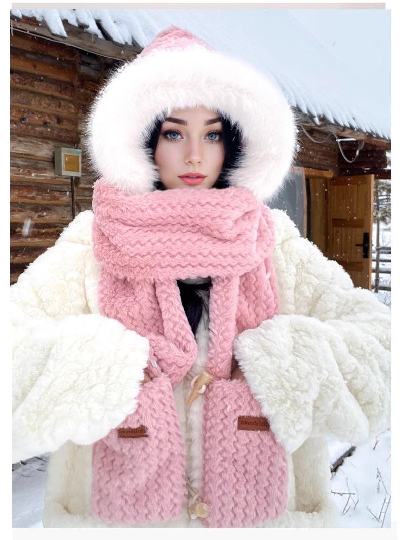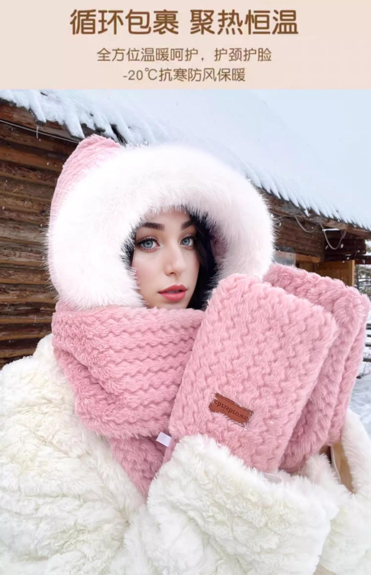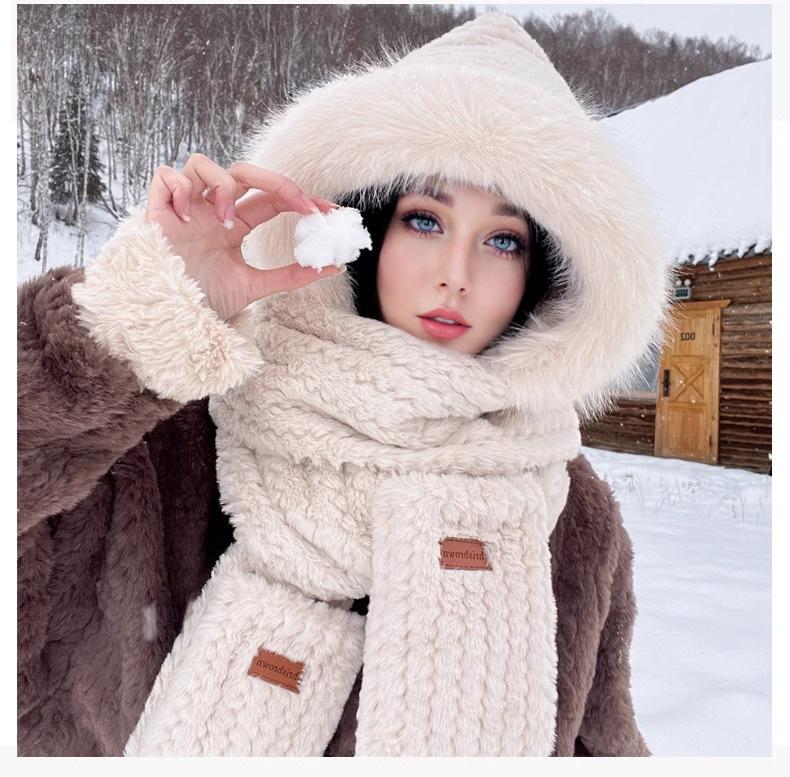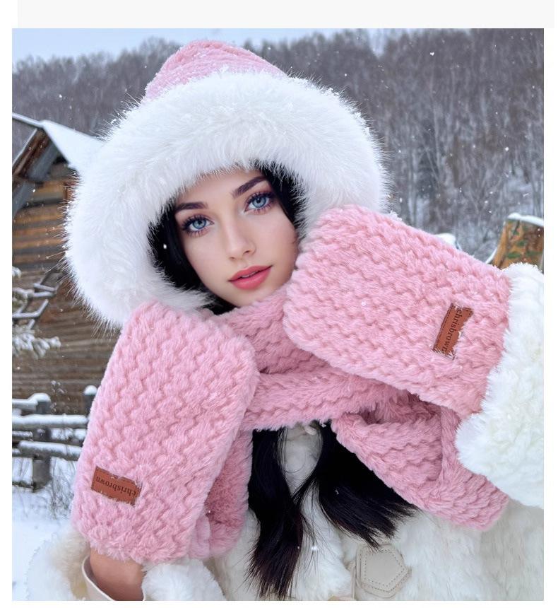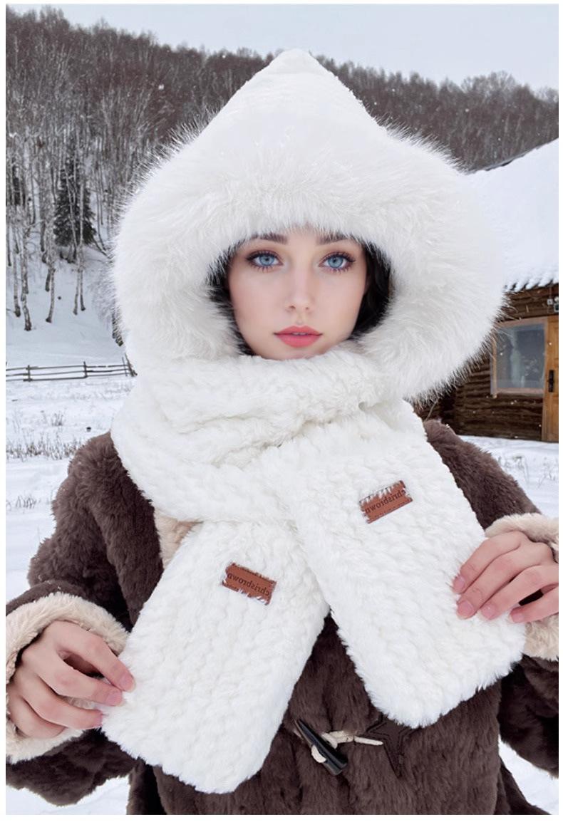 Conjunto de Tres Piezas para Invierno para Montar al Aire Libre: Sombrero Esponjoso con Bufanda Integrada, Tejido Cálido de Pelo de Conejo Rex, Bufanda a Prueba de Viento con Sombrero Integrado