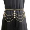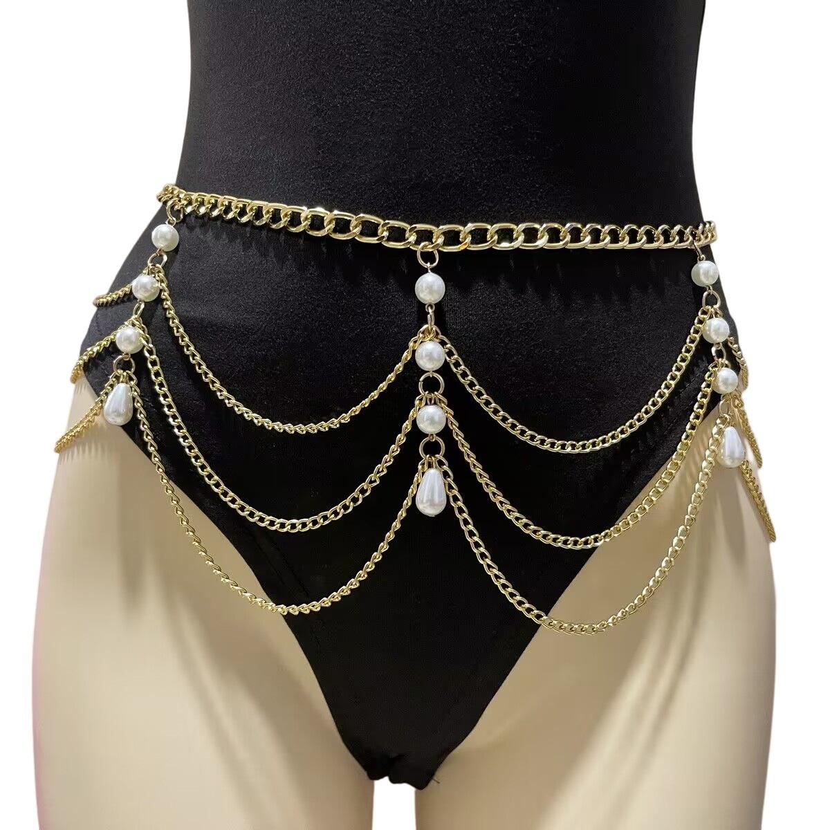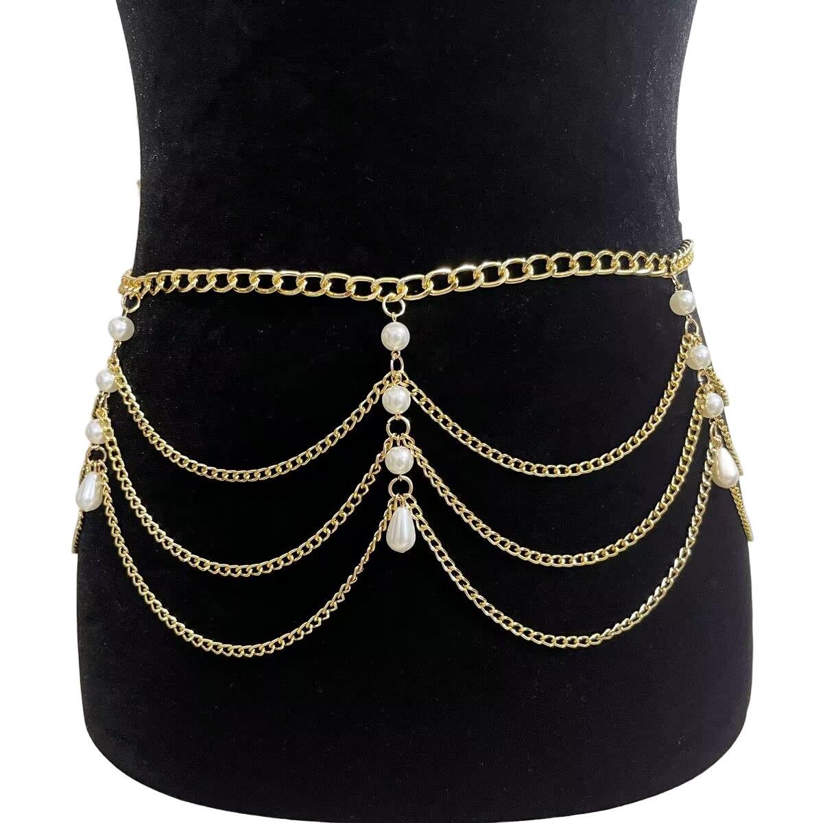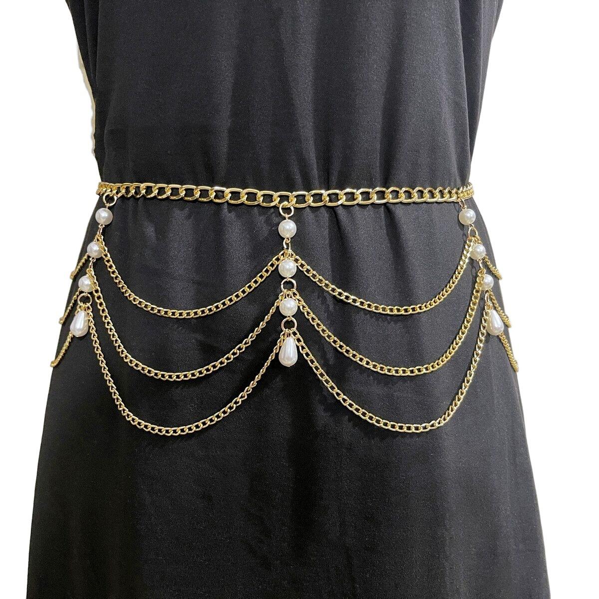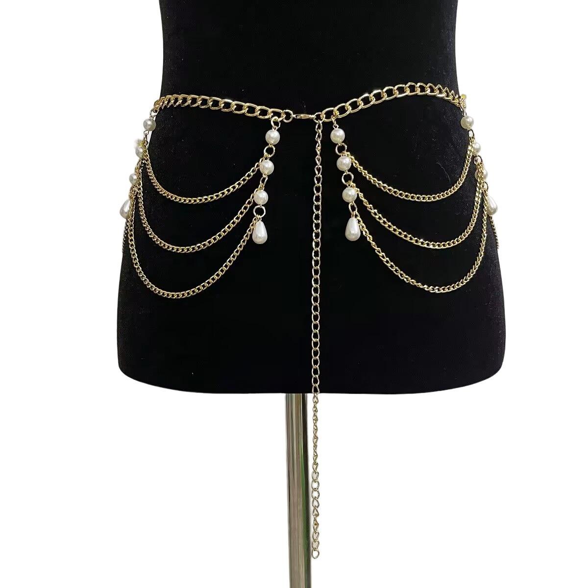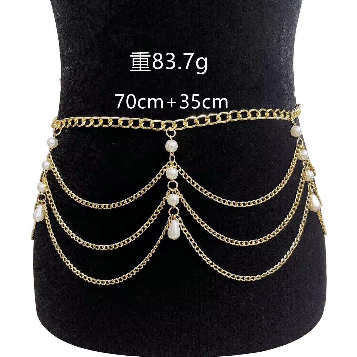 Cadena de cintura con perlas retro, joyería transfronteriza europea y americana, cadena de cuerpo con borlas onduladas multicapa de metal a la moda para mujer.