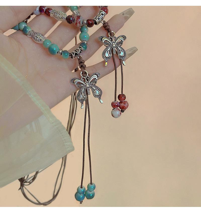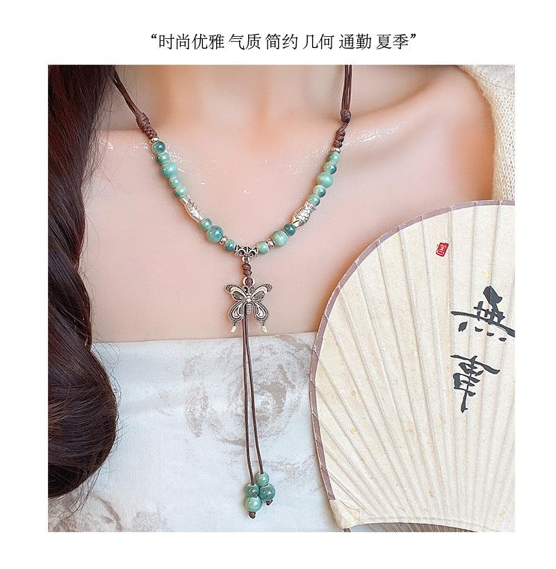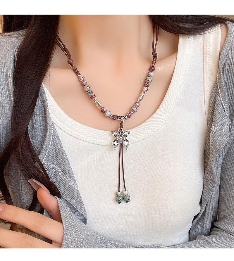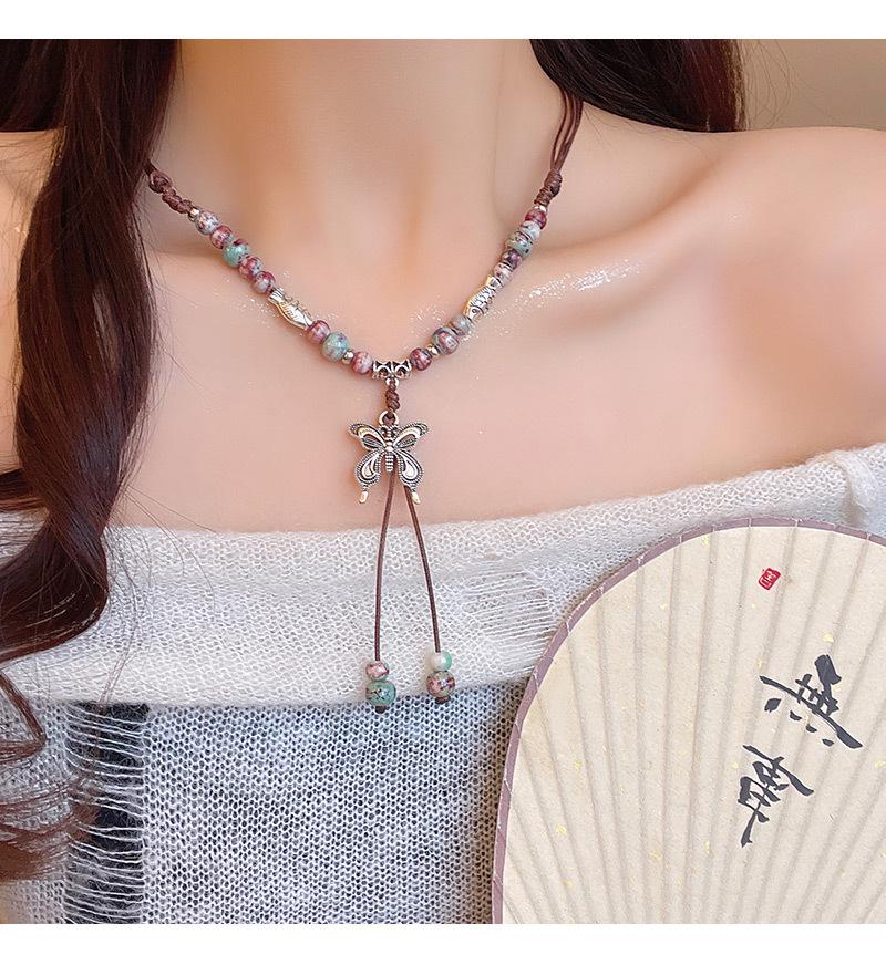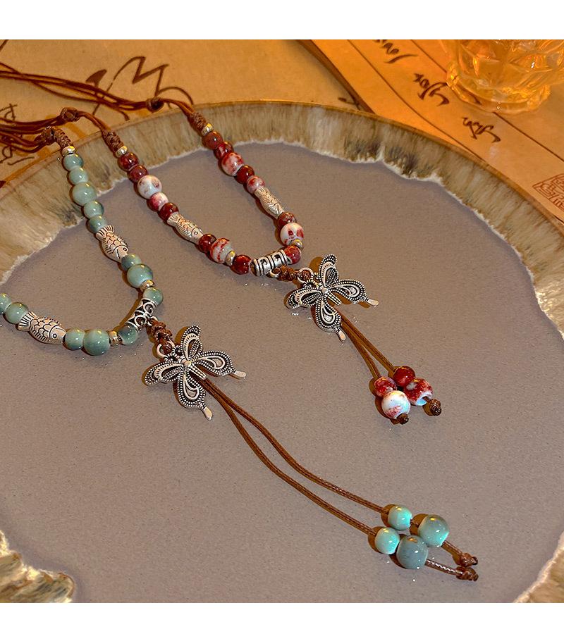 Collar de cuerda tejida con mariposas de cerámica y cuentas de colores, nuevo accesorio antiguo étnico chino, cadena de clavícula ligera de lujo de alta gama.