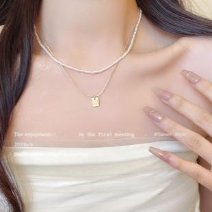Collar de perlas de doble capa de lujo ligero para mujer, moda retro francesa, colgante cuadrado, collar de clavícula, accesorios de temperamento